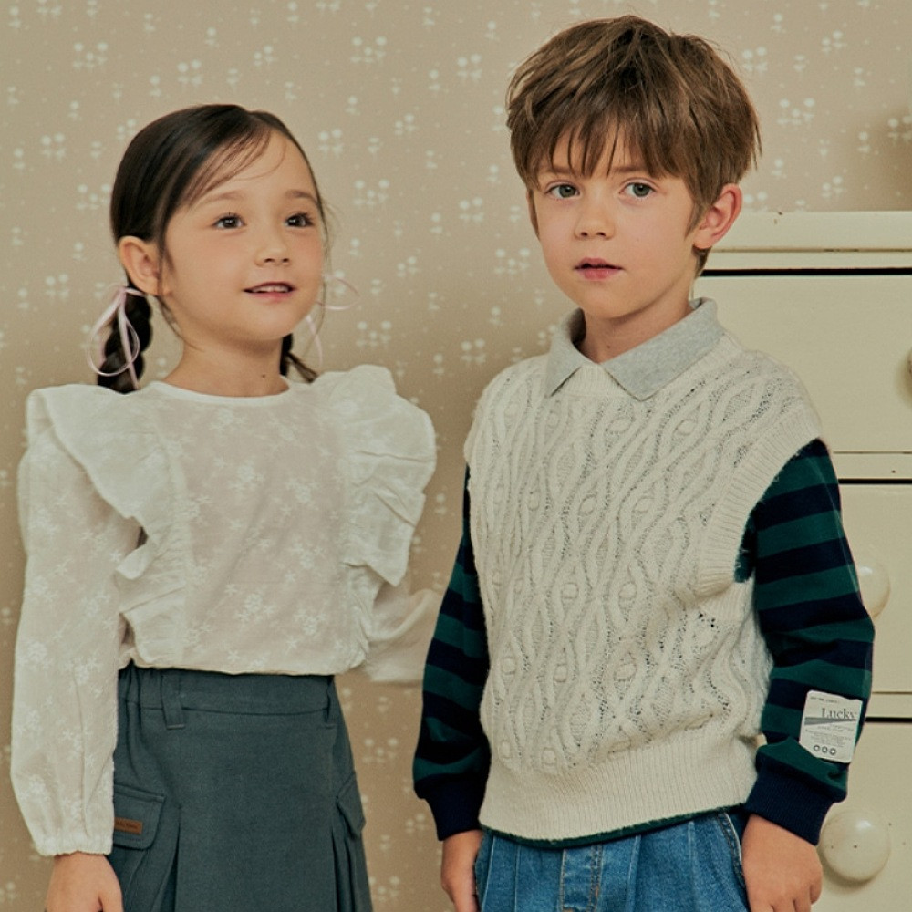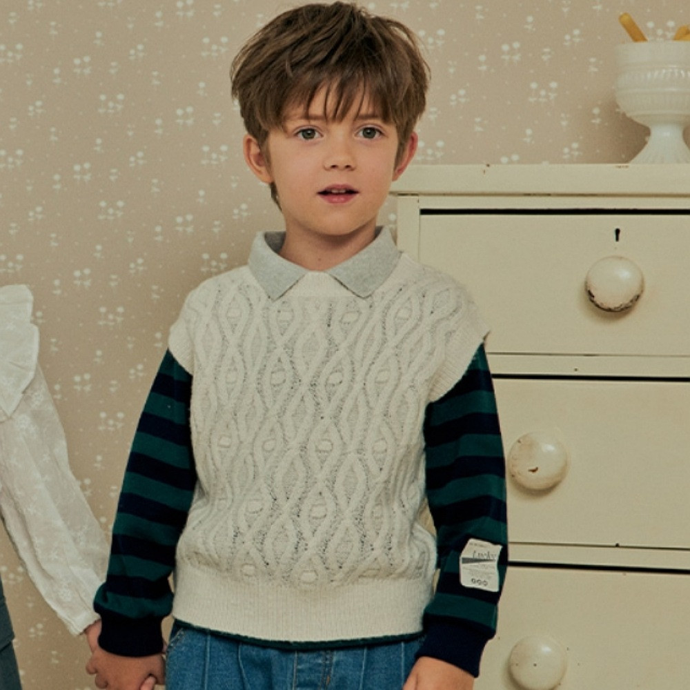 마름모꼴의 조직이 독특한 니트조끼입니다. 부드러운 원사를 사용하여 편하게 입을 수 있습니다. V넥 디자인의 남아 여아 공용스타일입니다. 셔츠나 블라우스,기본 티셔츠 와 함께 단정하게 코디하기 좋은상품입니다. 면바지,청바지,스커트등 어디에나 잘 어울리는 아이템입니다.