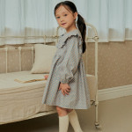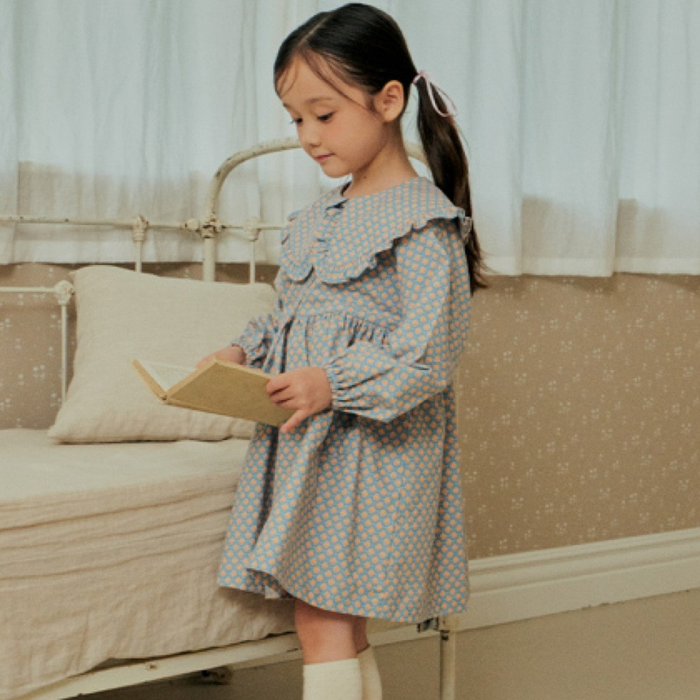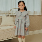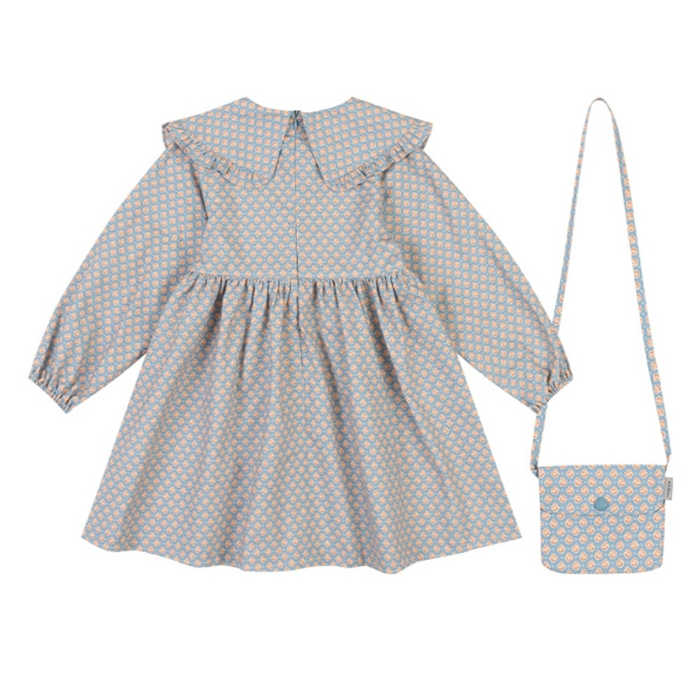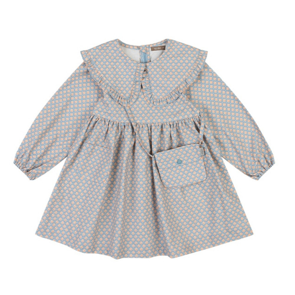 프릴이 달린 빅카라로 포인트를 준 원피스입니다. 어린이들이 좋아하는 가방이 세트입니다.