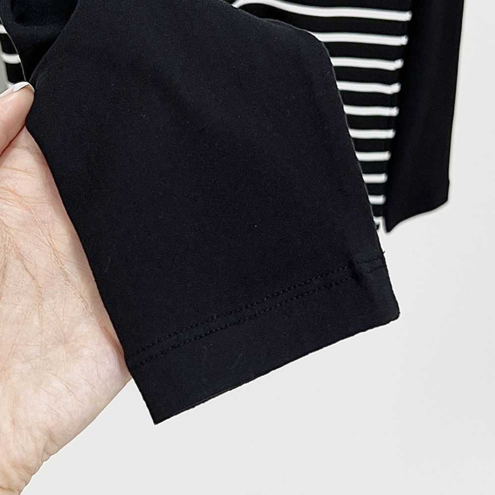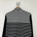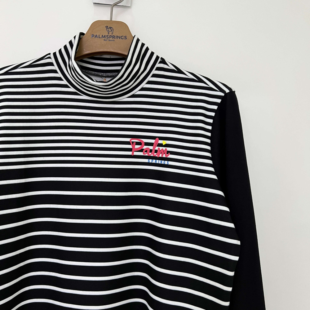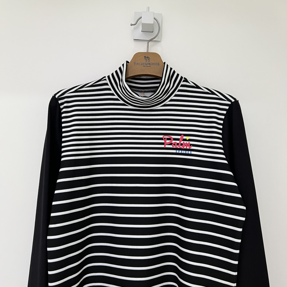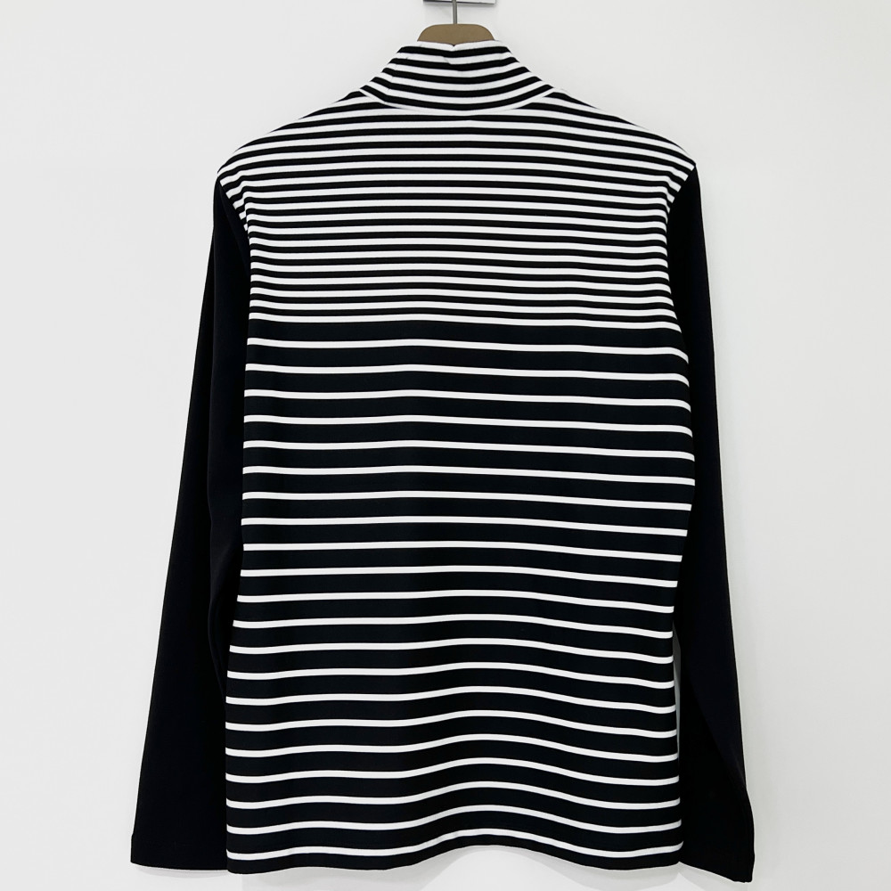스트라이프 패턴 배색의 여성 폴라 긴팔 티셔츠입니다.