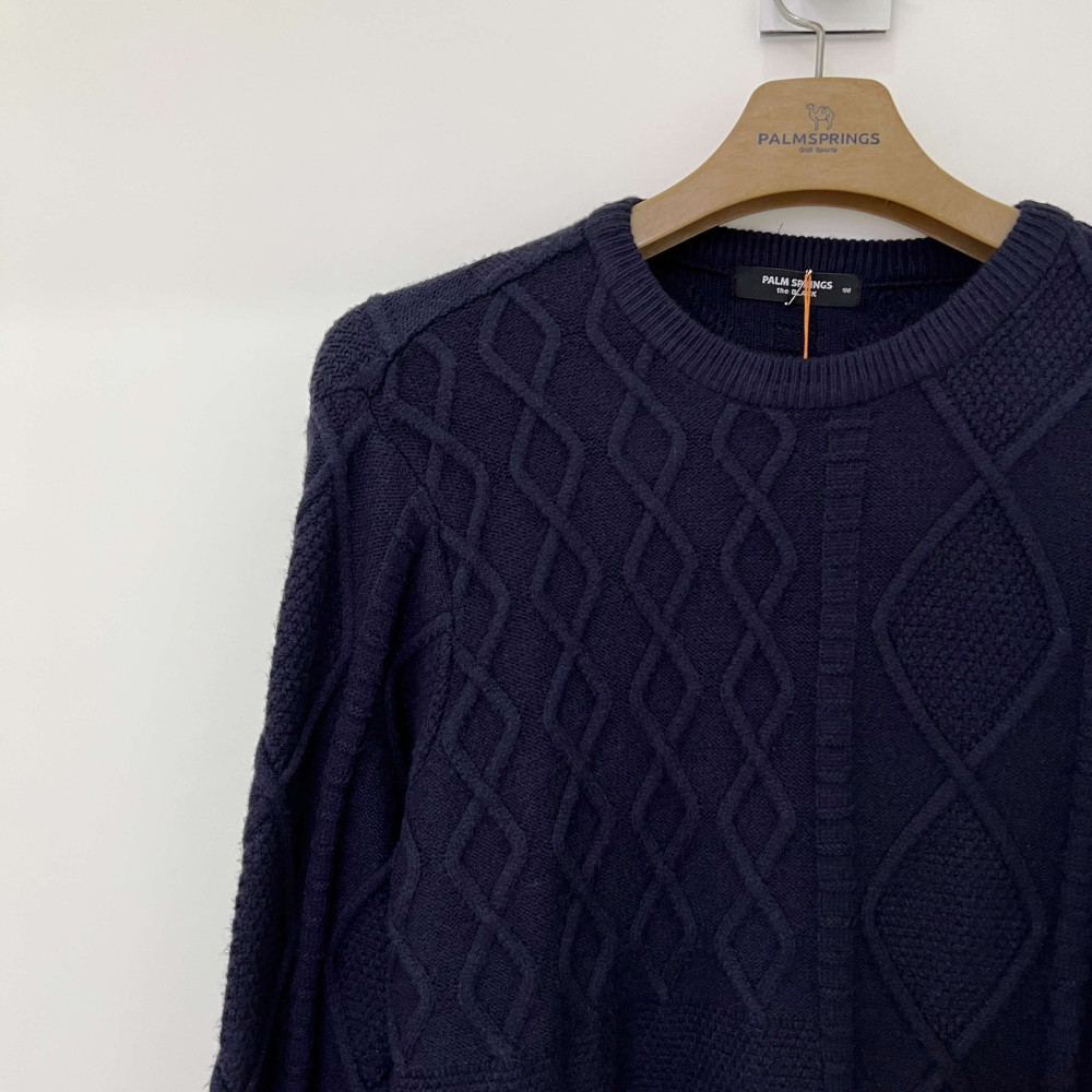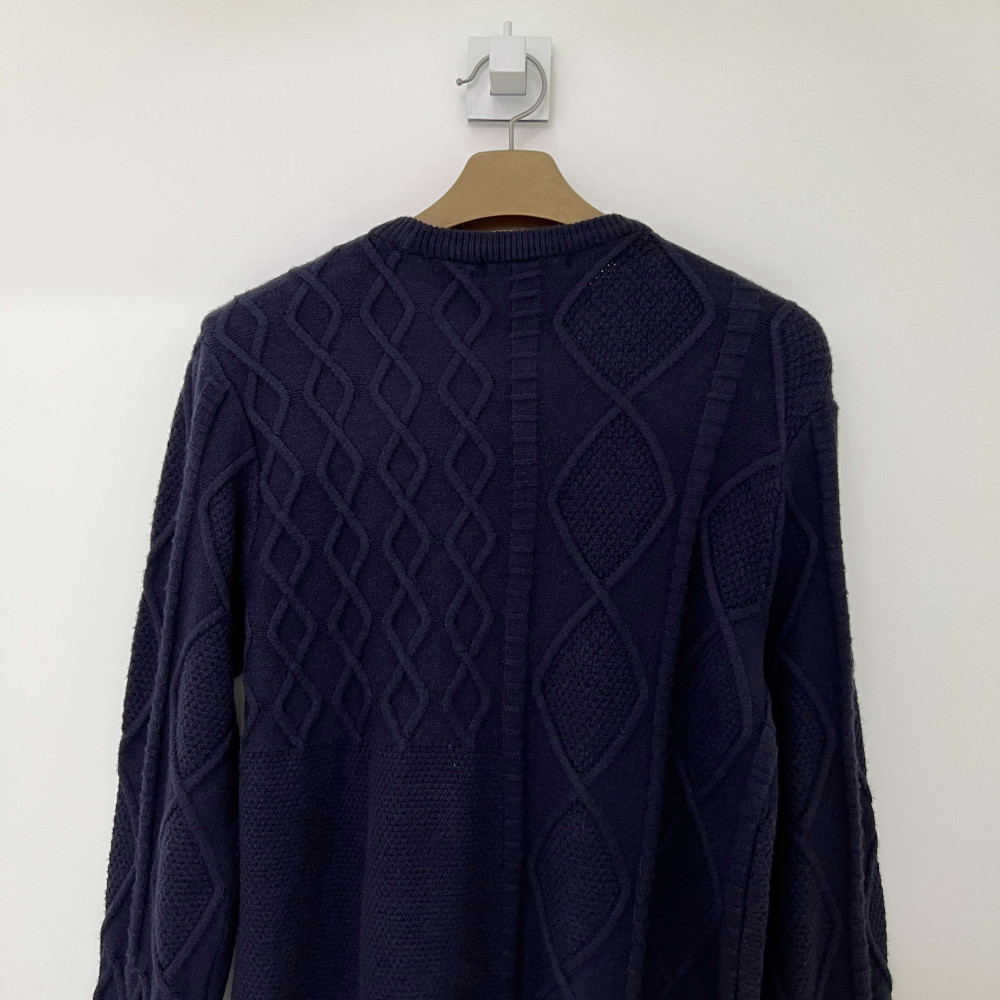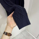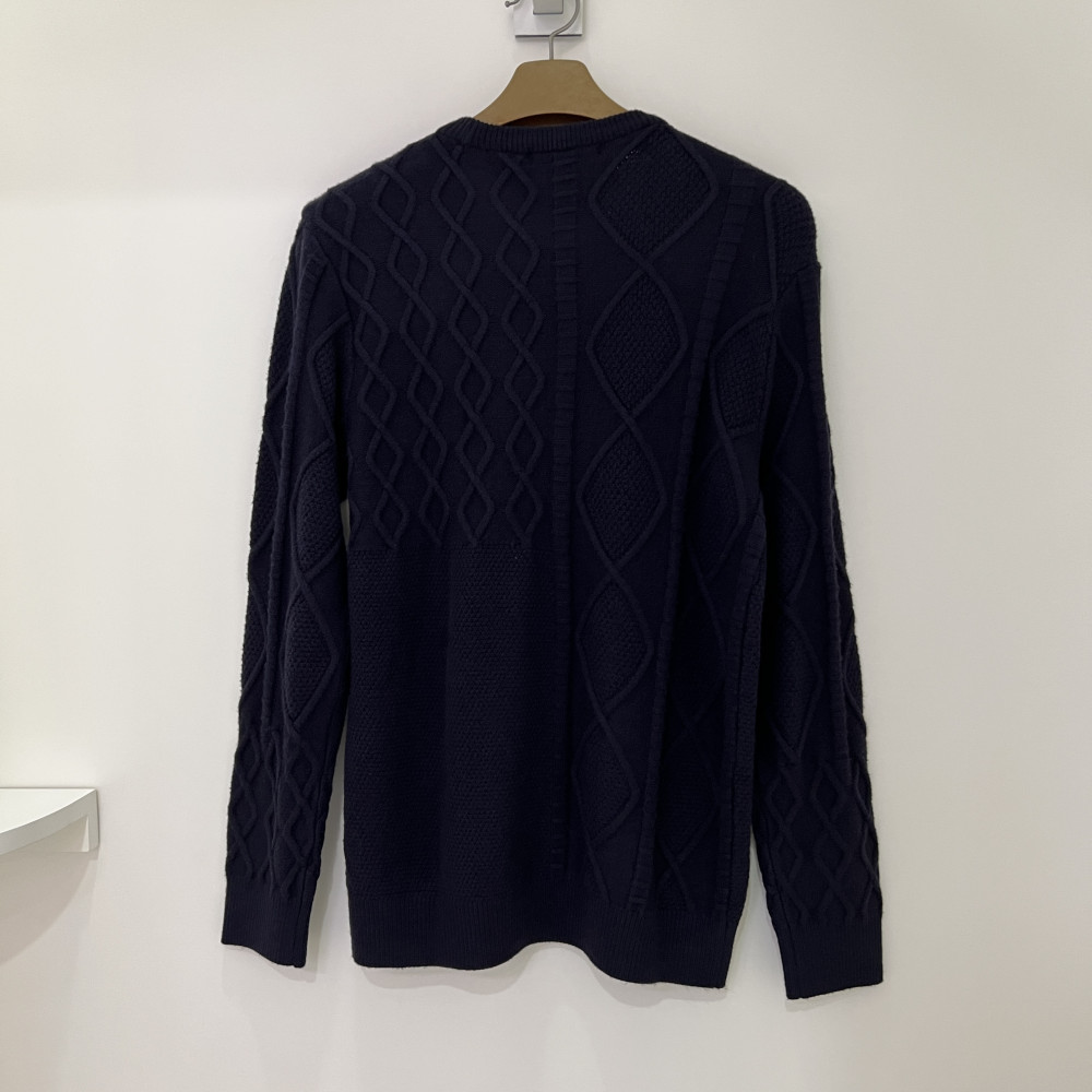 케이블 니트 짜임 배색이 들어간 따뜻한 라운드넥 니트입니다.