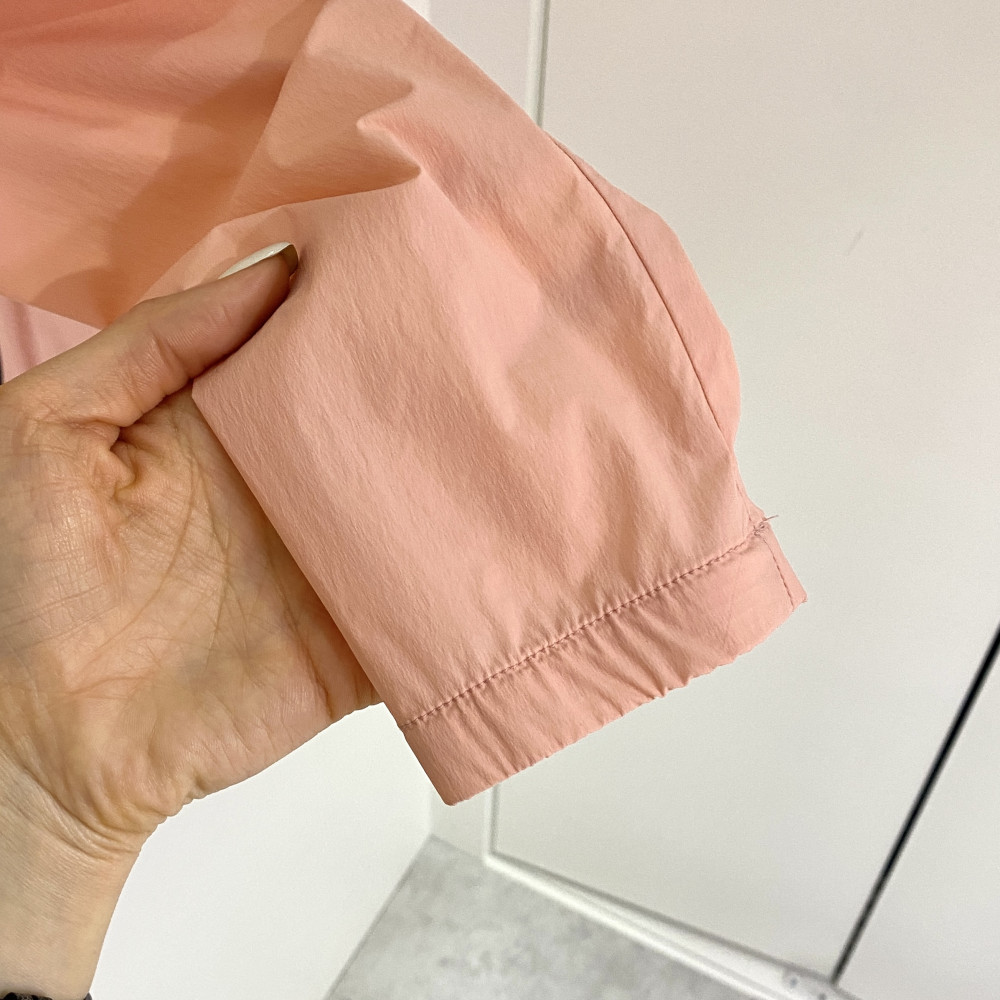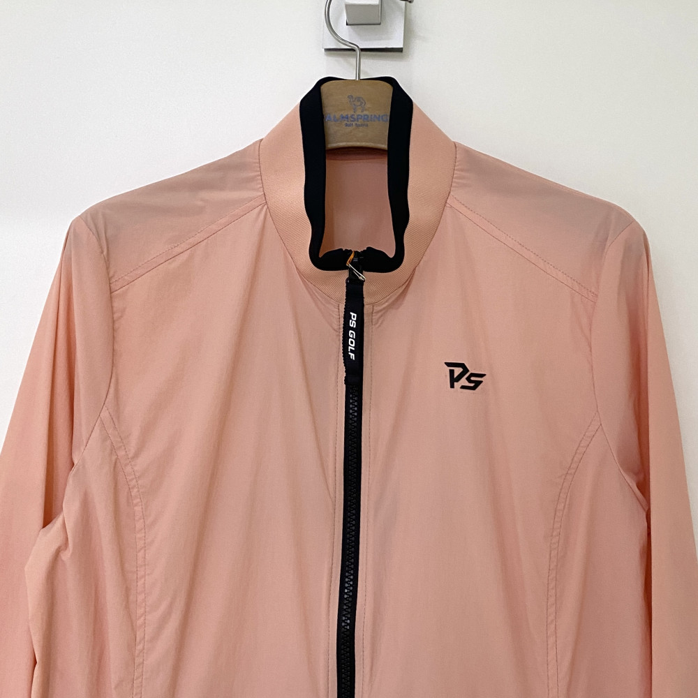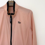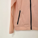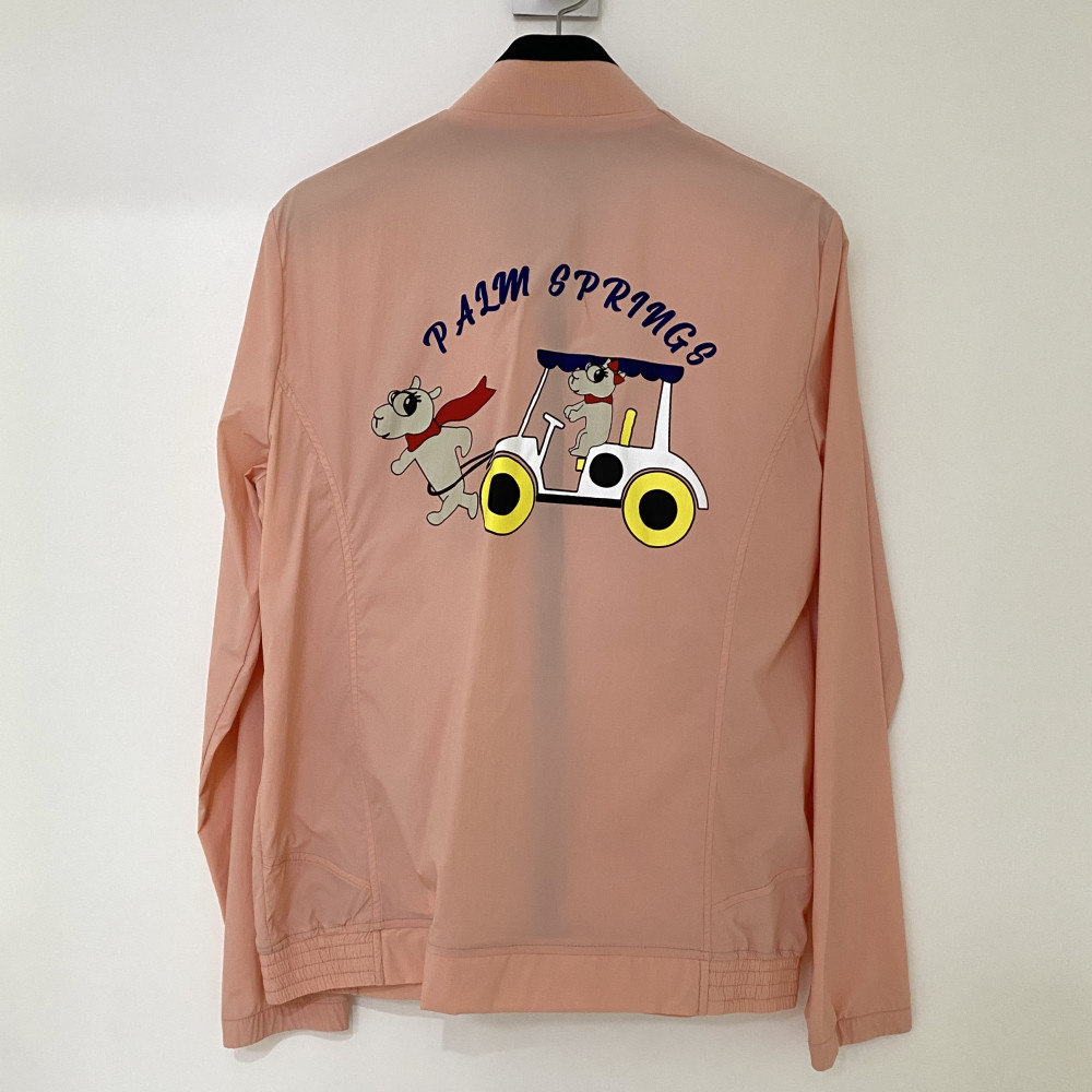 넥 부분 져지 소재 배색과 등판 프린팅을 포인트로 더해준 여성 간절기 하이넥 풀집업 바람막이 점퍼입니다.