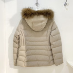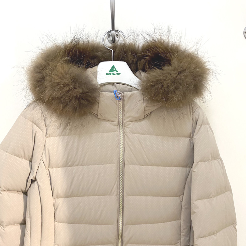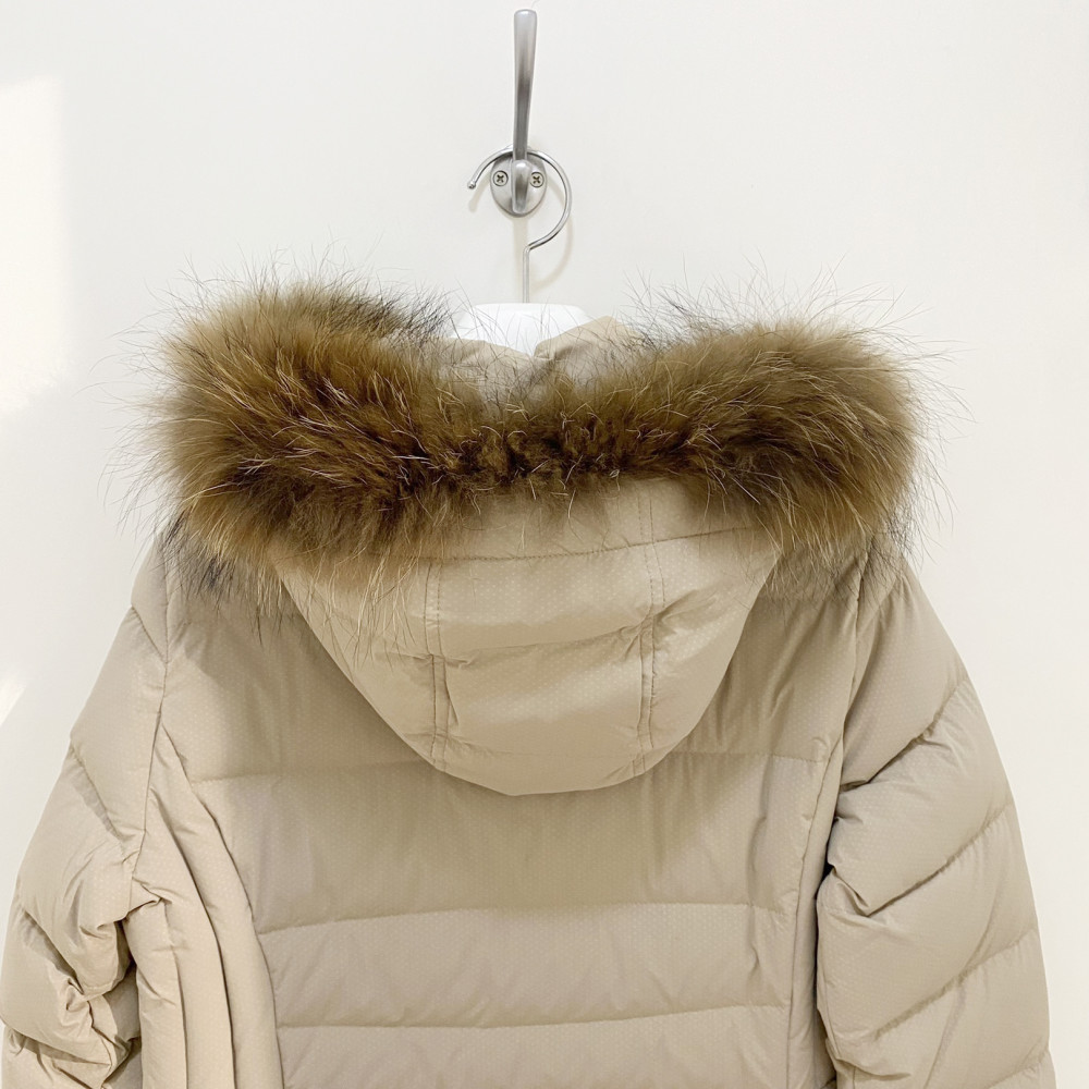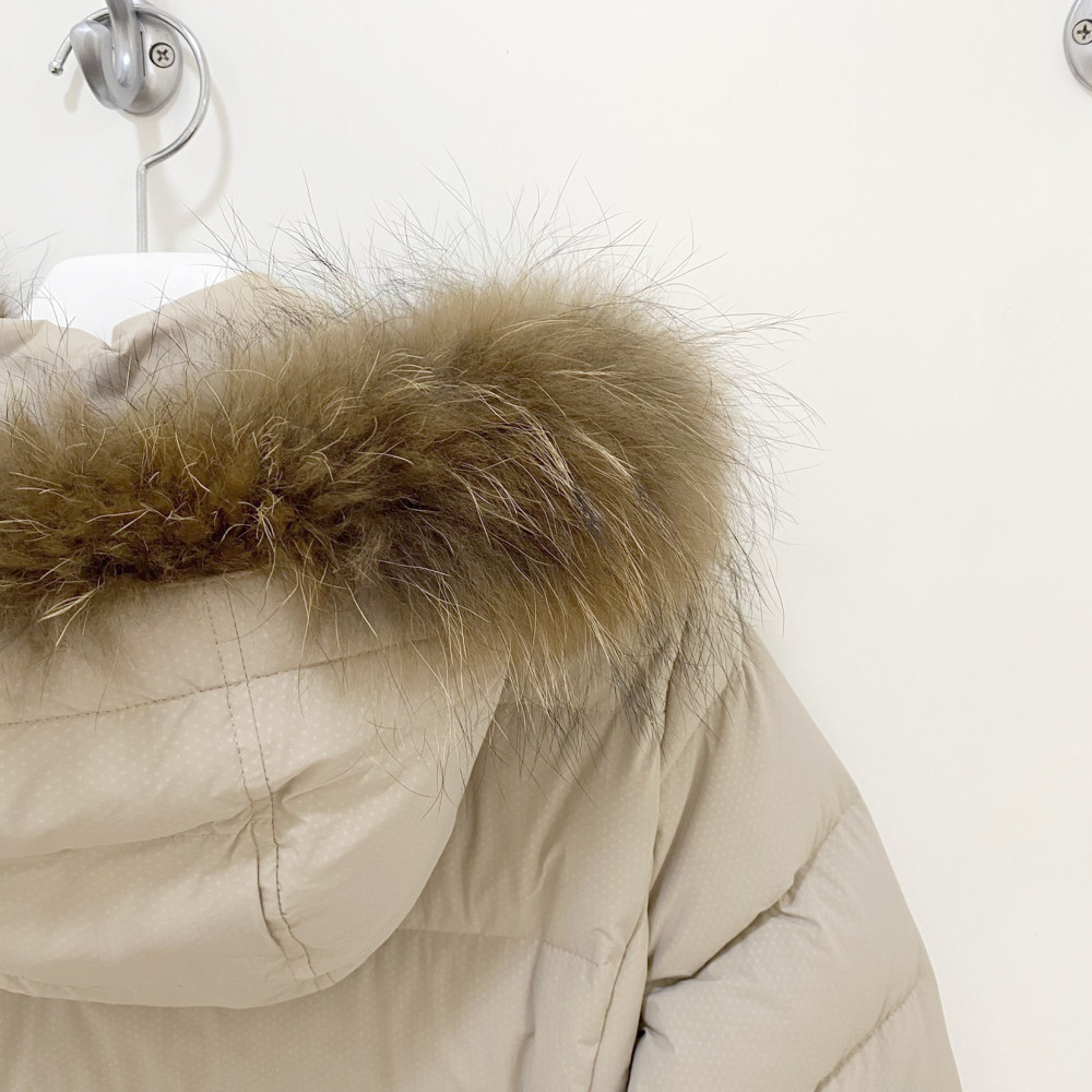 후드 부분 라쿤 퍼 트리밍으로 고급스럽고 따뜻해보이는 느낌을 더해준 여성 구스 다운 점퍼입니다.