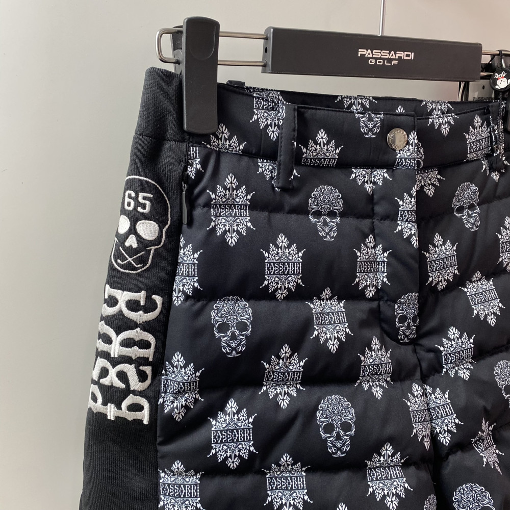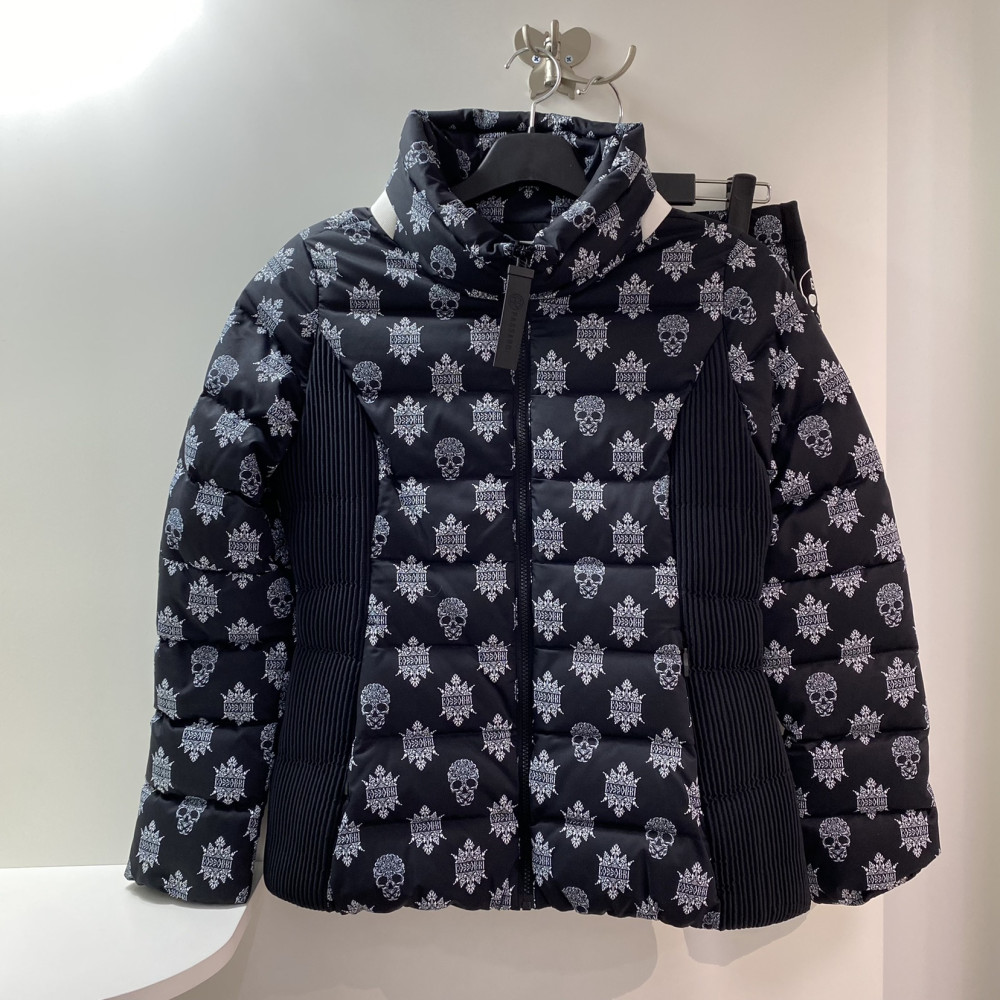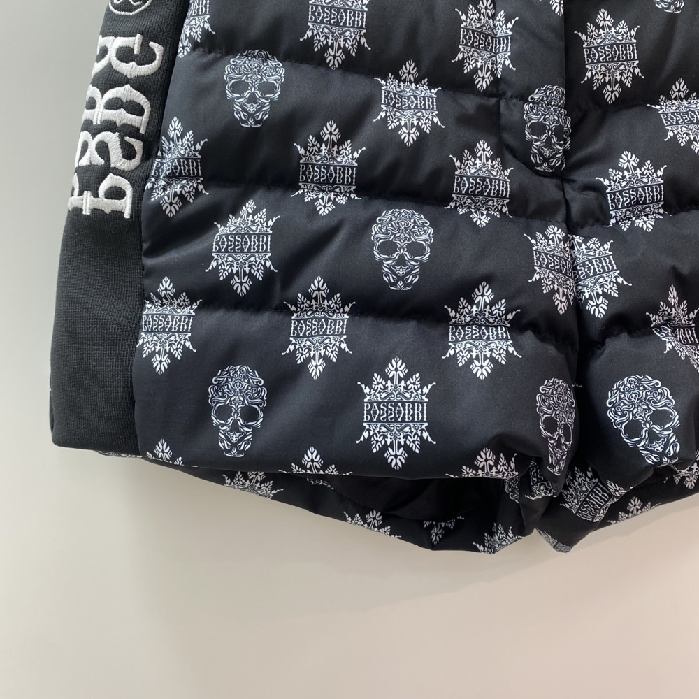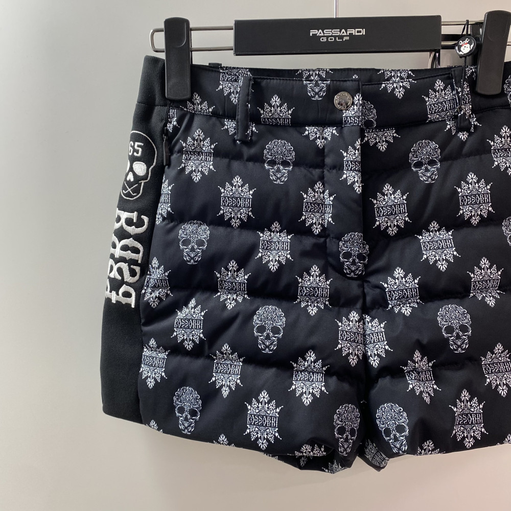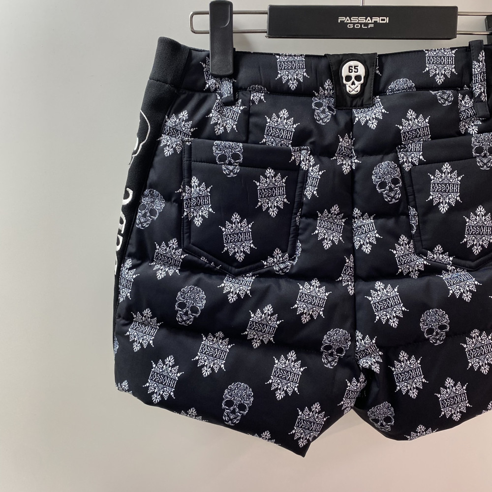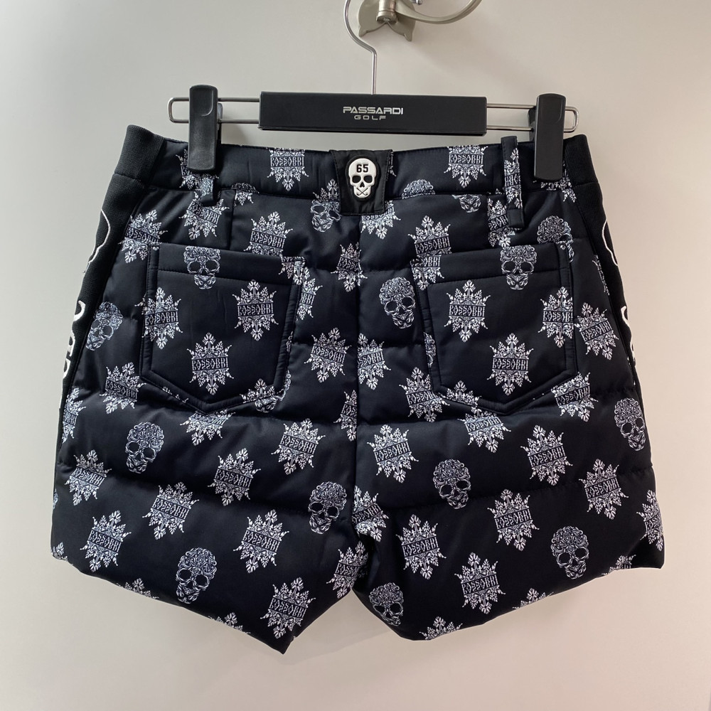 전판에 스컬 프린트가 되어져있는 덕다운 소재의 여성 겨울 다운 팬츠 반바지입니다. 동일 패턴의 다운 점퍼와 세트상품이며 함꼐 착용 시 더욱 멋스럽게 연출할 수 있습니다.