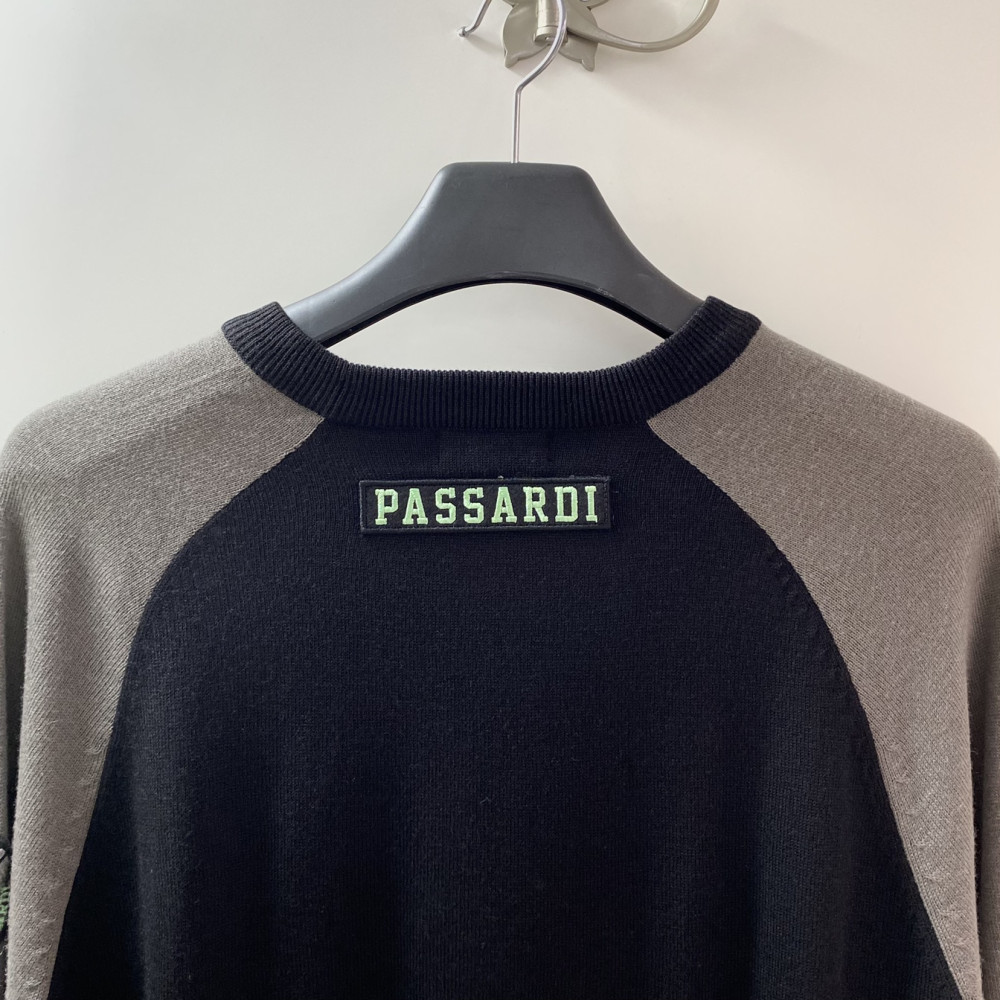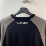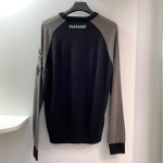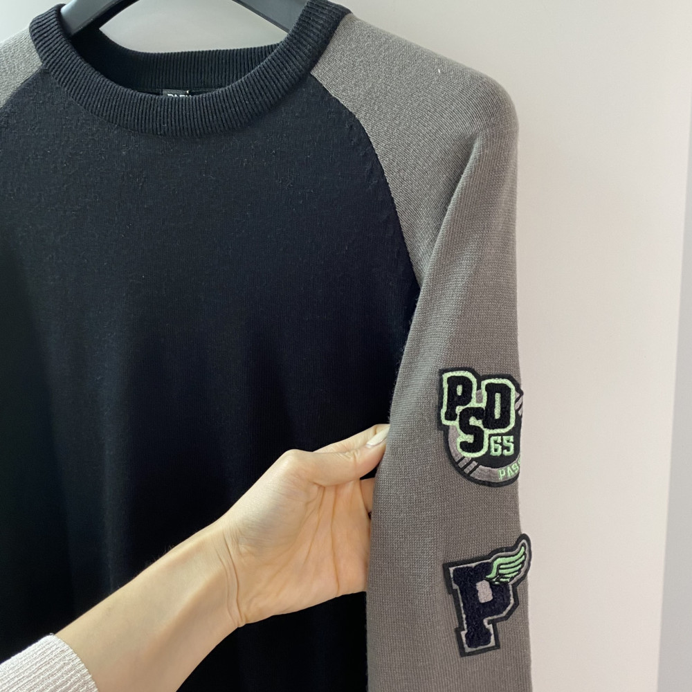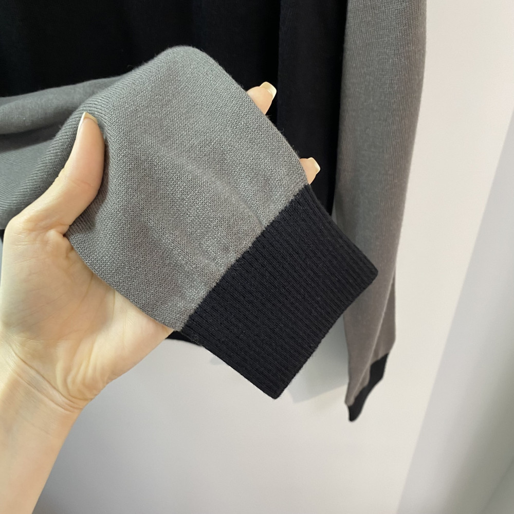 나그랑 소매 컬러 배색 라운드넥 긴팔 니트입니다. 소매부분에 와펜 포인트가 들어가있습니다.