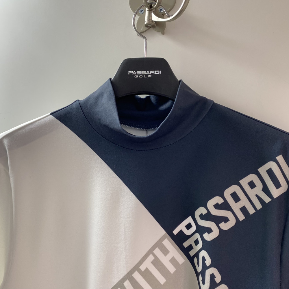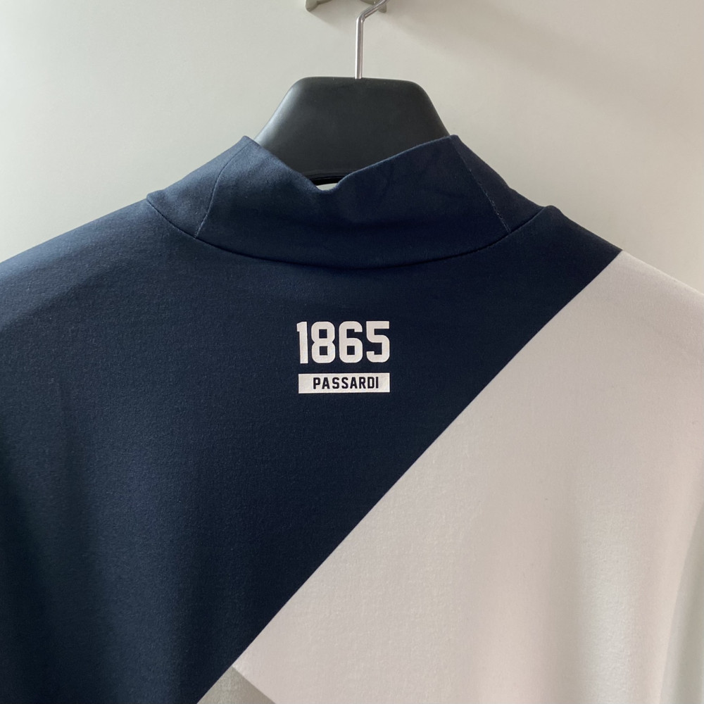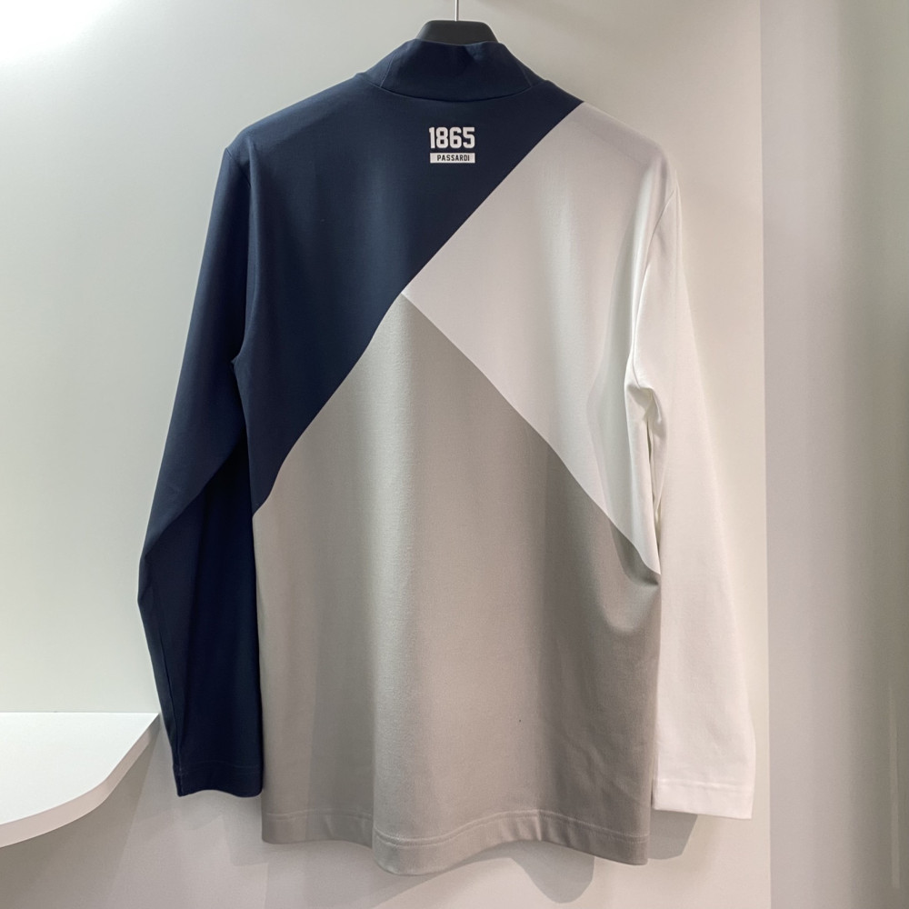 가을에 착용하기 좋은 사선으로 컬러 배색이 들어간 디자인의 긴팔 반목 티셔츠입니다.