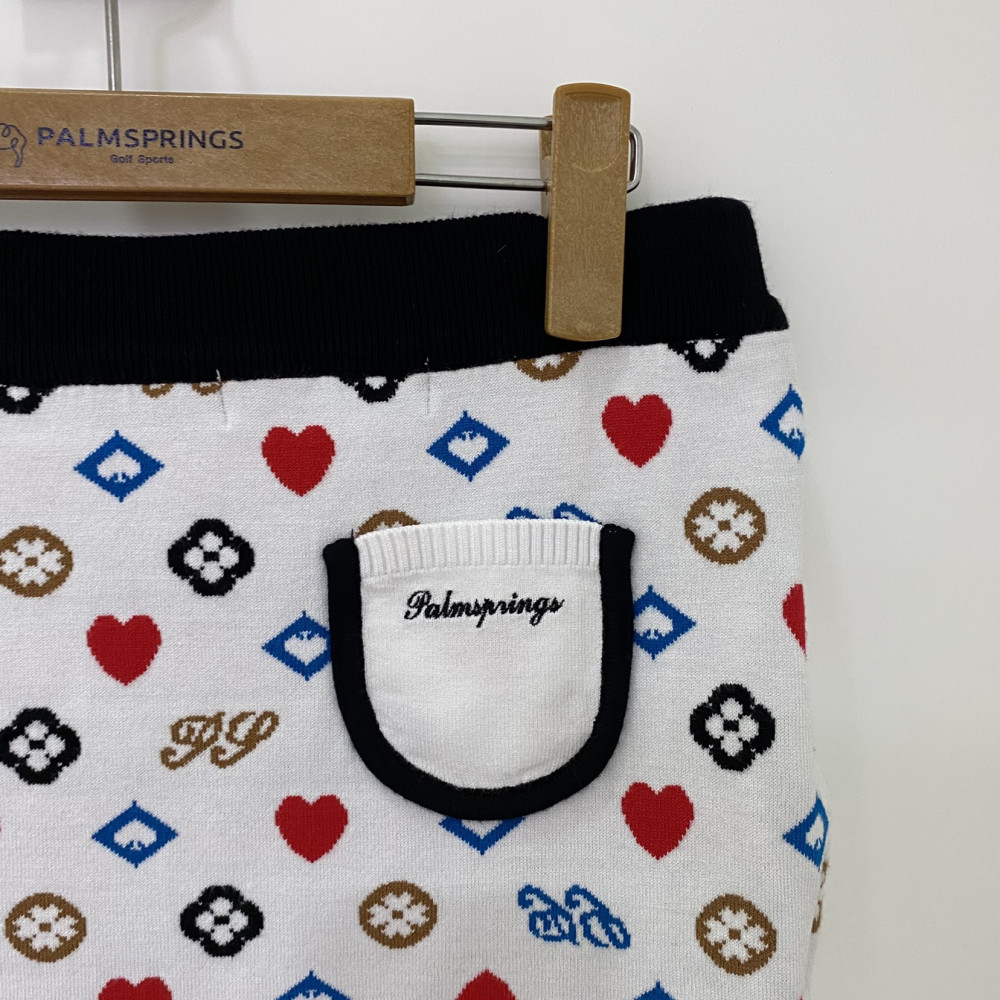 전판에 패턴이 캐주얼한 느낌의 니트 스커트 입니다. 밑단 프릴로 귀여운 느낌을 주며, 동일한 패턴의 니트 베스트와 세트로 착용할 수 있습니다.