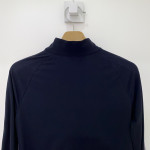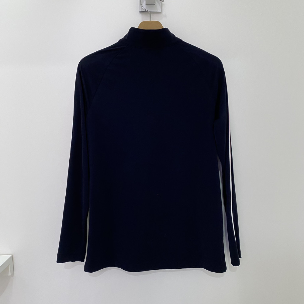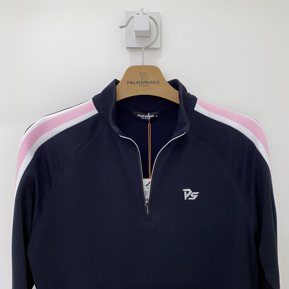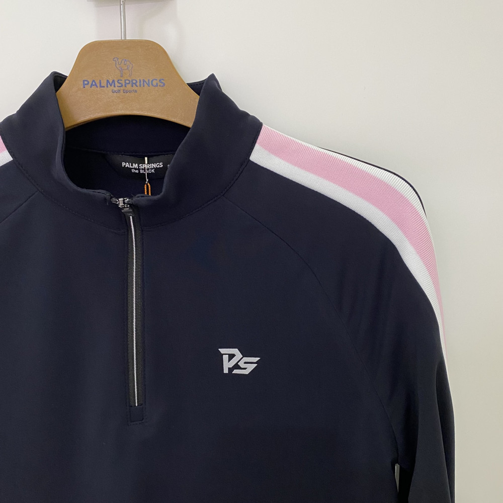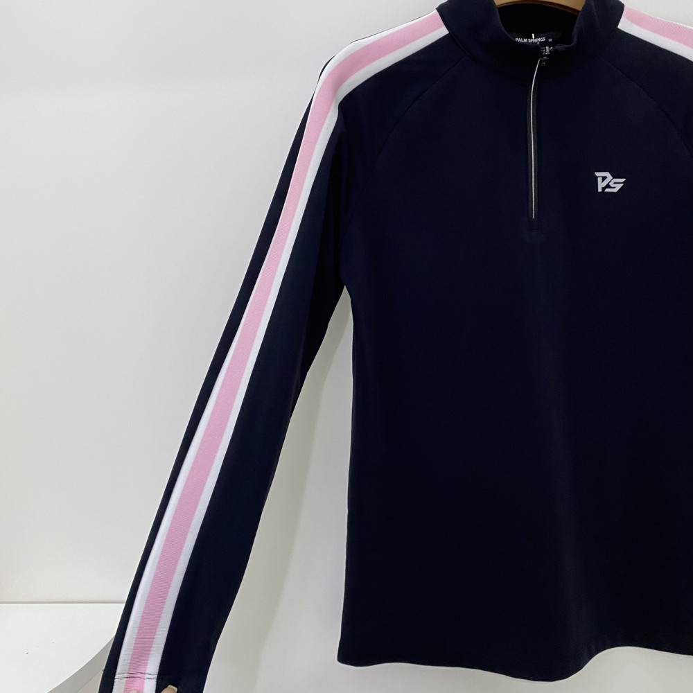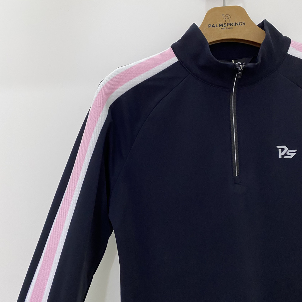 소매 부분에 어꺠부터 이어져 내려오는 컬러 라인 배색이 포인트로 들어가있는 하이넥 반집업 긴팔 티셔츠입니다.