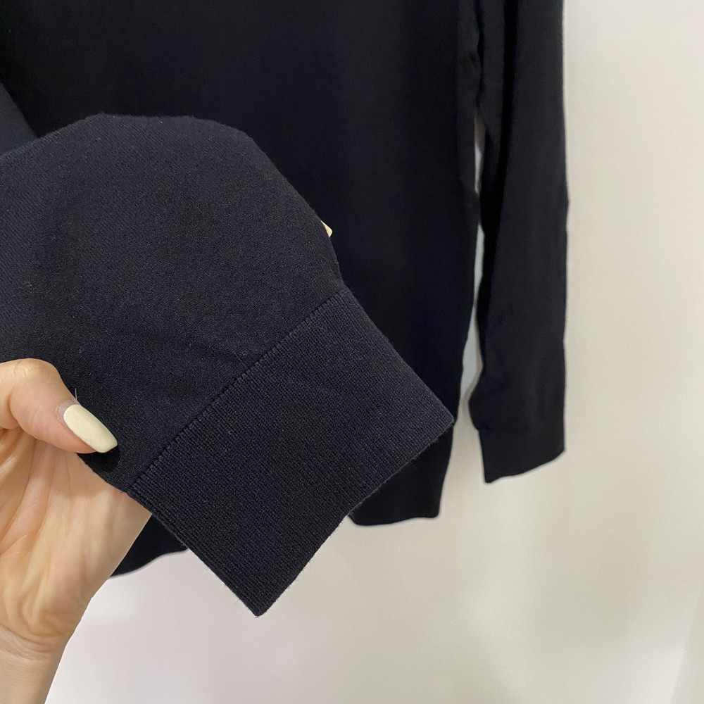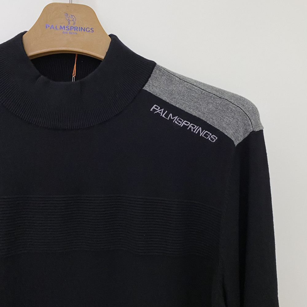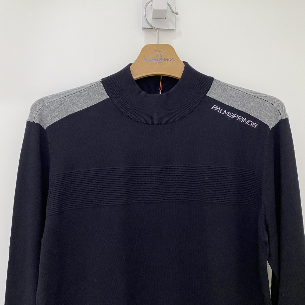 어깨 부분에 컬러 배색이 포인트로 들어가있는 반목 디자인의 남성용 긴팔 니트입니다.