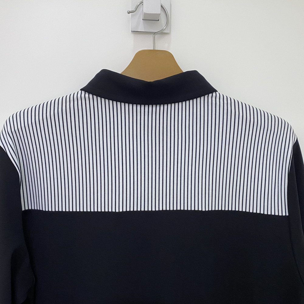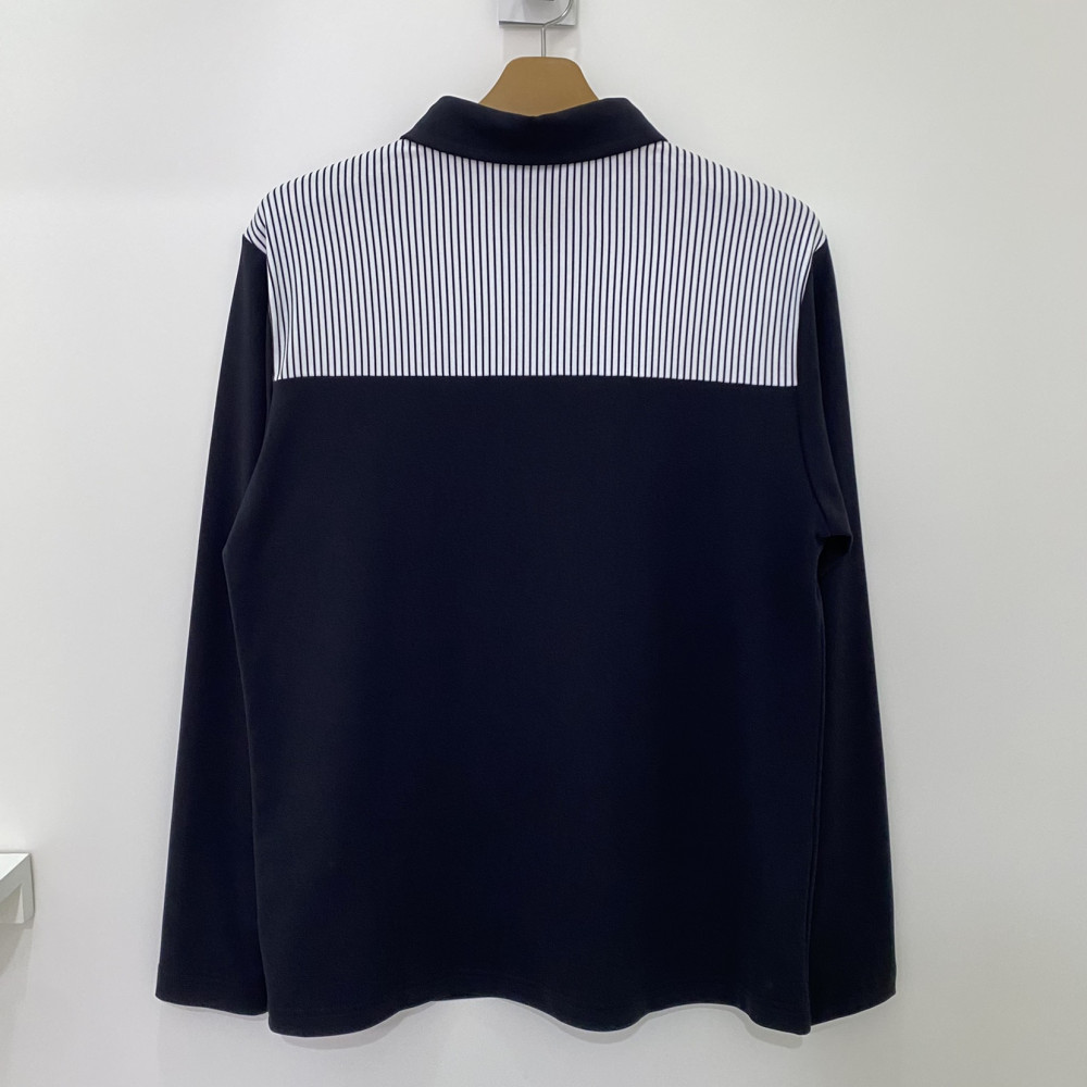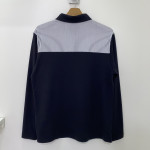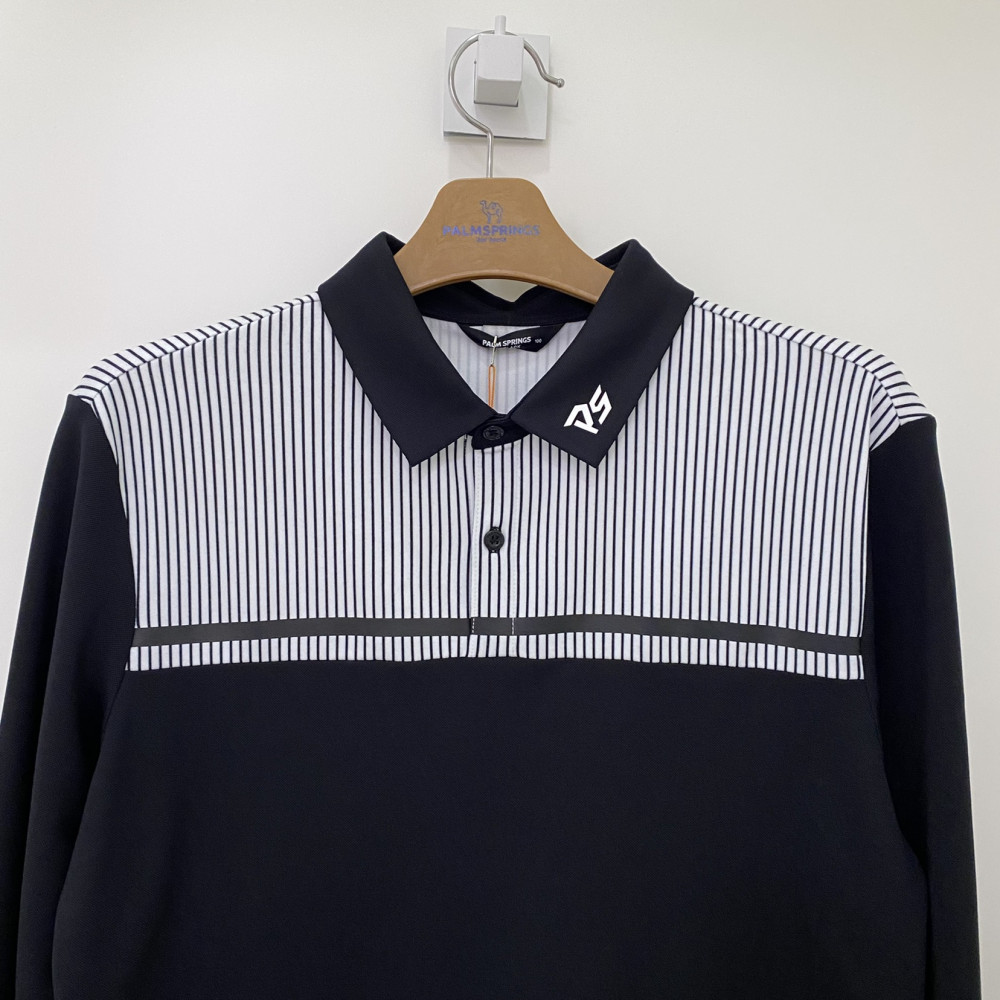 상단에 스트라이프 패턴이 포인트로 들어가있는 남성 긴팔 카라티셔츠입니다.