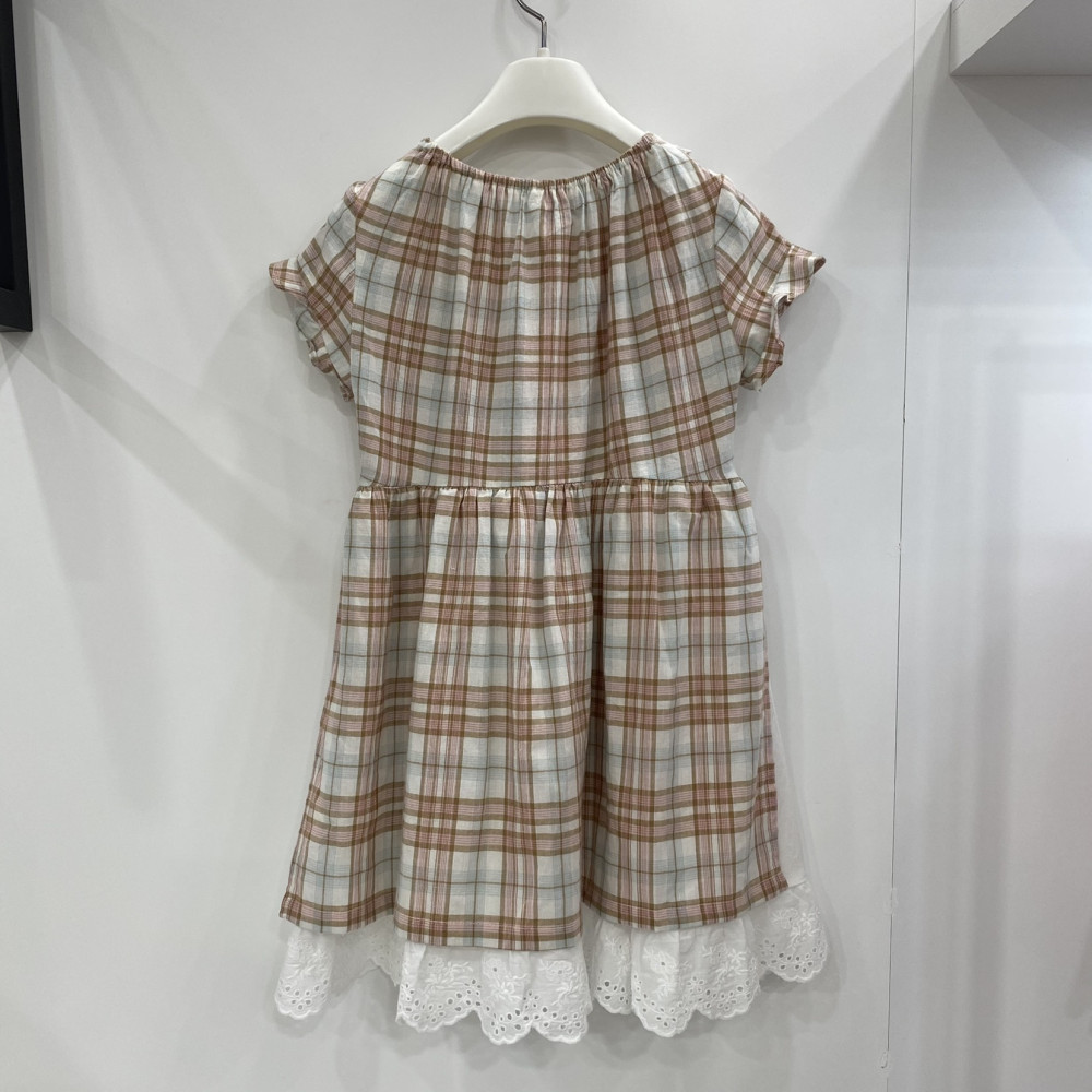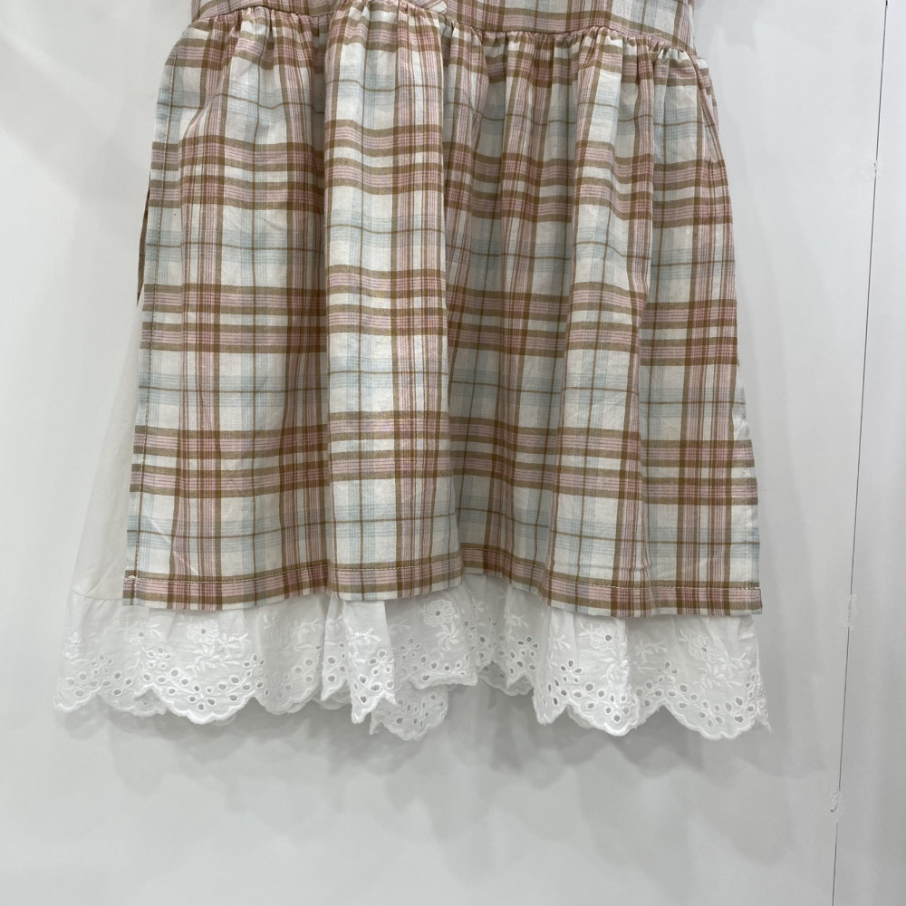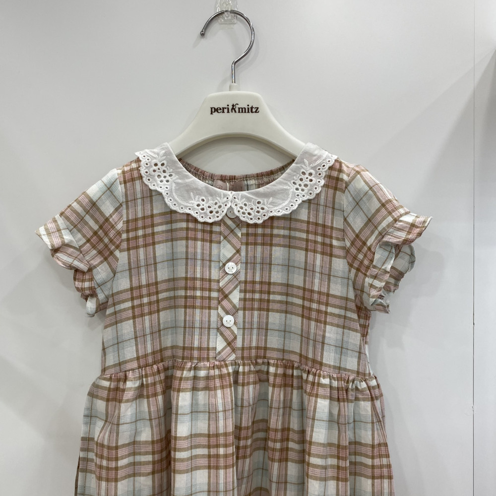 네크라인과 원피스 밑단에 사랑스러운 펀칭 레이스 디테일이 들어가있는 체크 패턴의 반팔 원피스입니다.