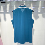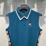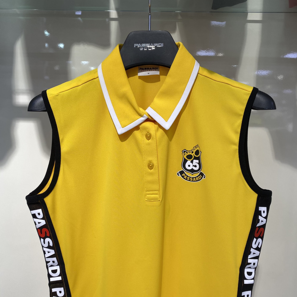 양쪽 사이드에 메쉬 테이프 배색이 포인트로 들어가있는 카라 민소매 티셔츠 입니다.
