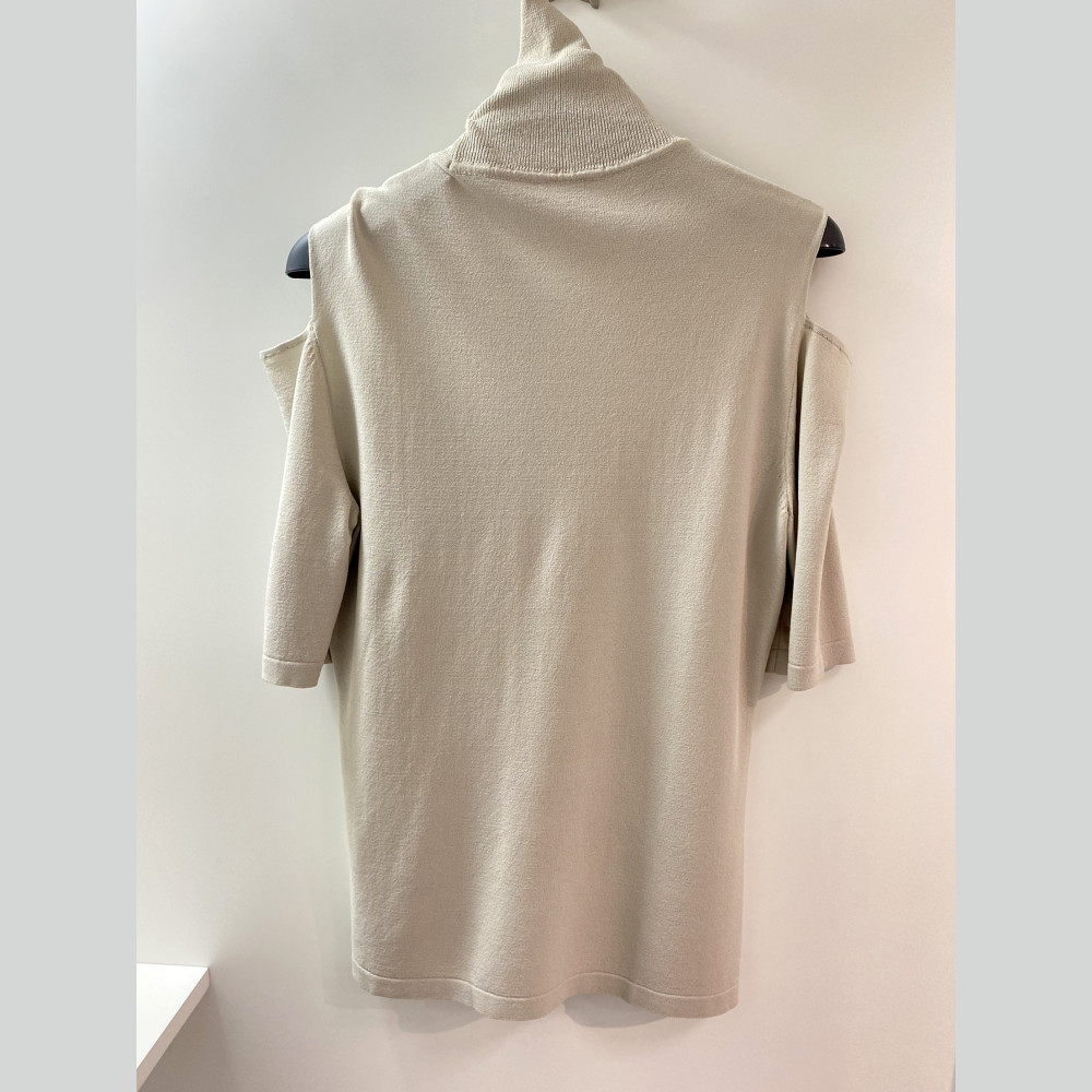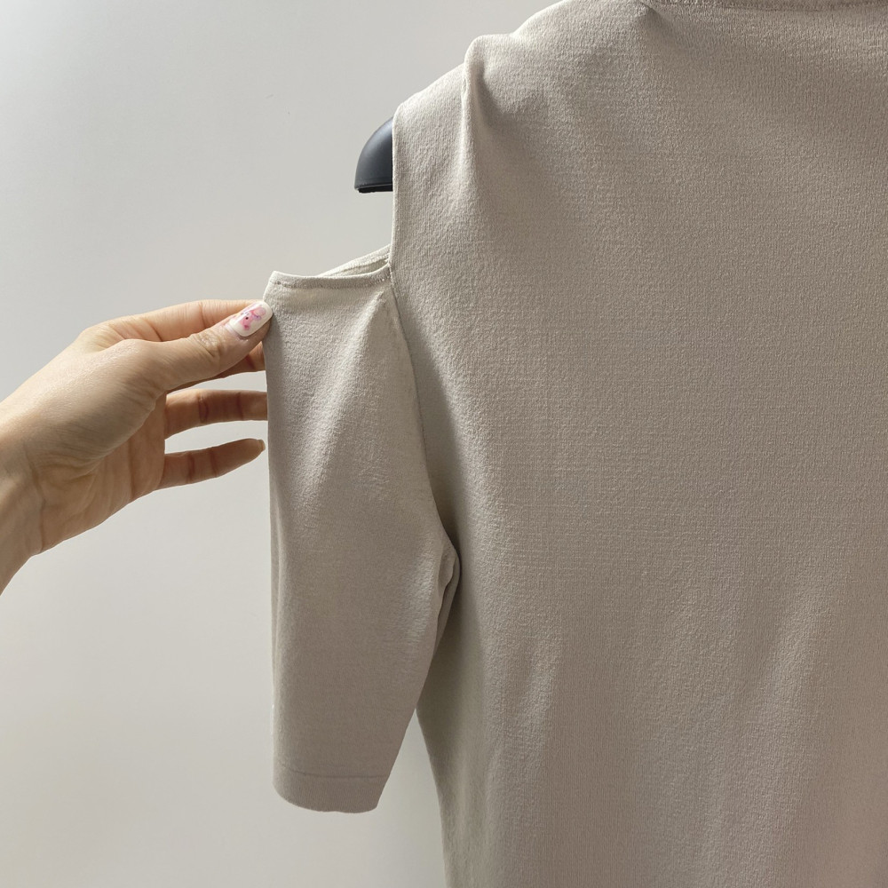 여성스러운 느낌의 어꺠 트임 반팔 니트입니다.