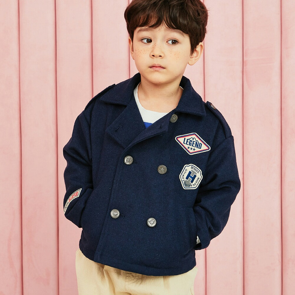 와펜장식이 멋있는 더블 자켓입니다. 입학식이나 정장이 필요한 날에 너무 딱딱하지않은 세련된 느낌으로 입을 수 있는 적당한 두께감의 자켓입니다