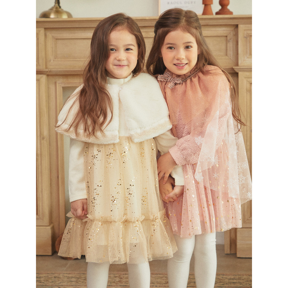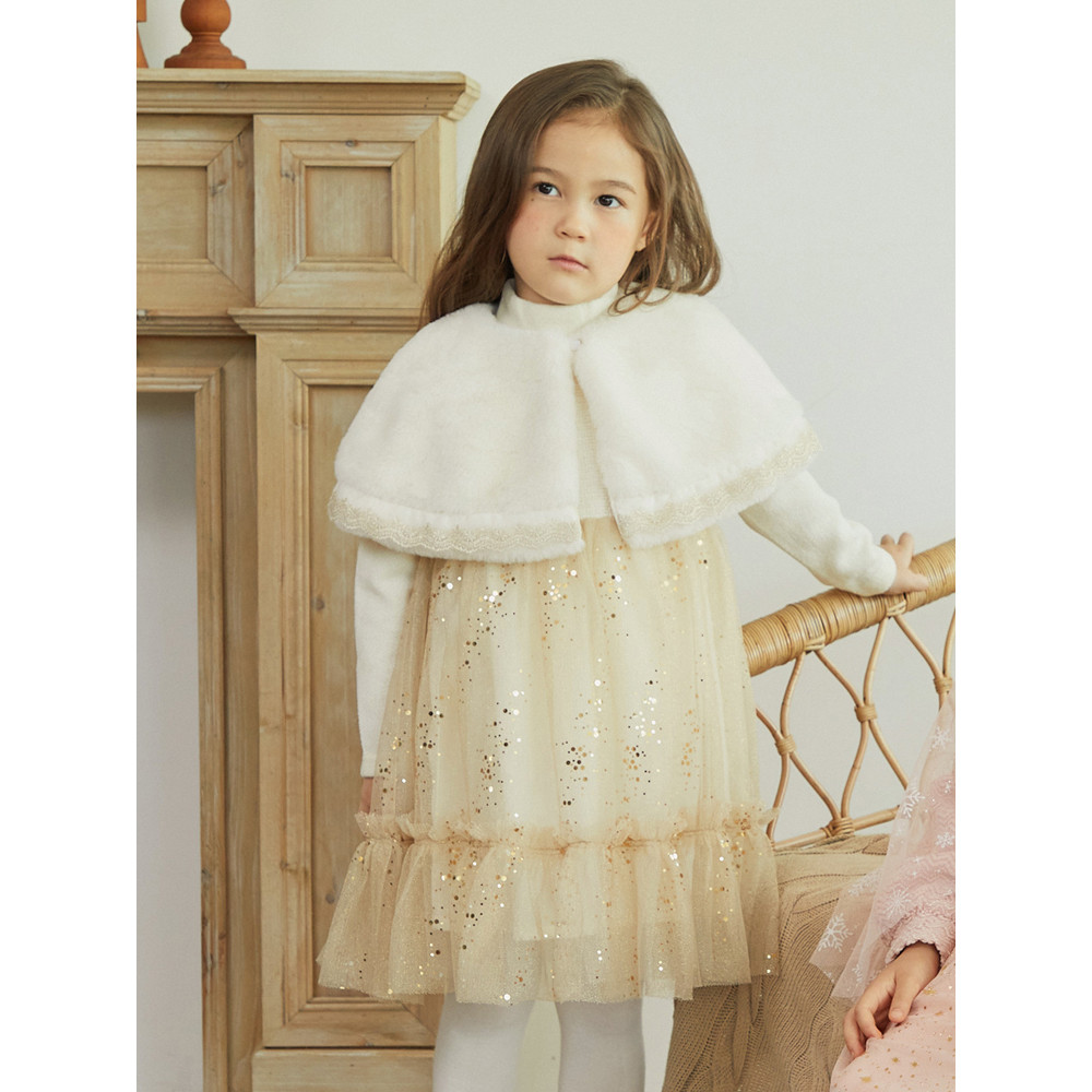 어린이들이 좋아하는 공주원피스입니다. 민소매원피스로 블라우스나 폴라티등 다양한 코디로 분위기를 바꿀 수 있고 퍼 망토로 화려함을 더해 줍니다