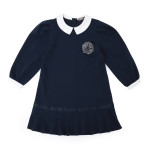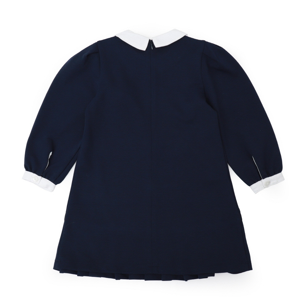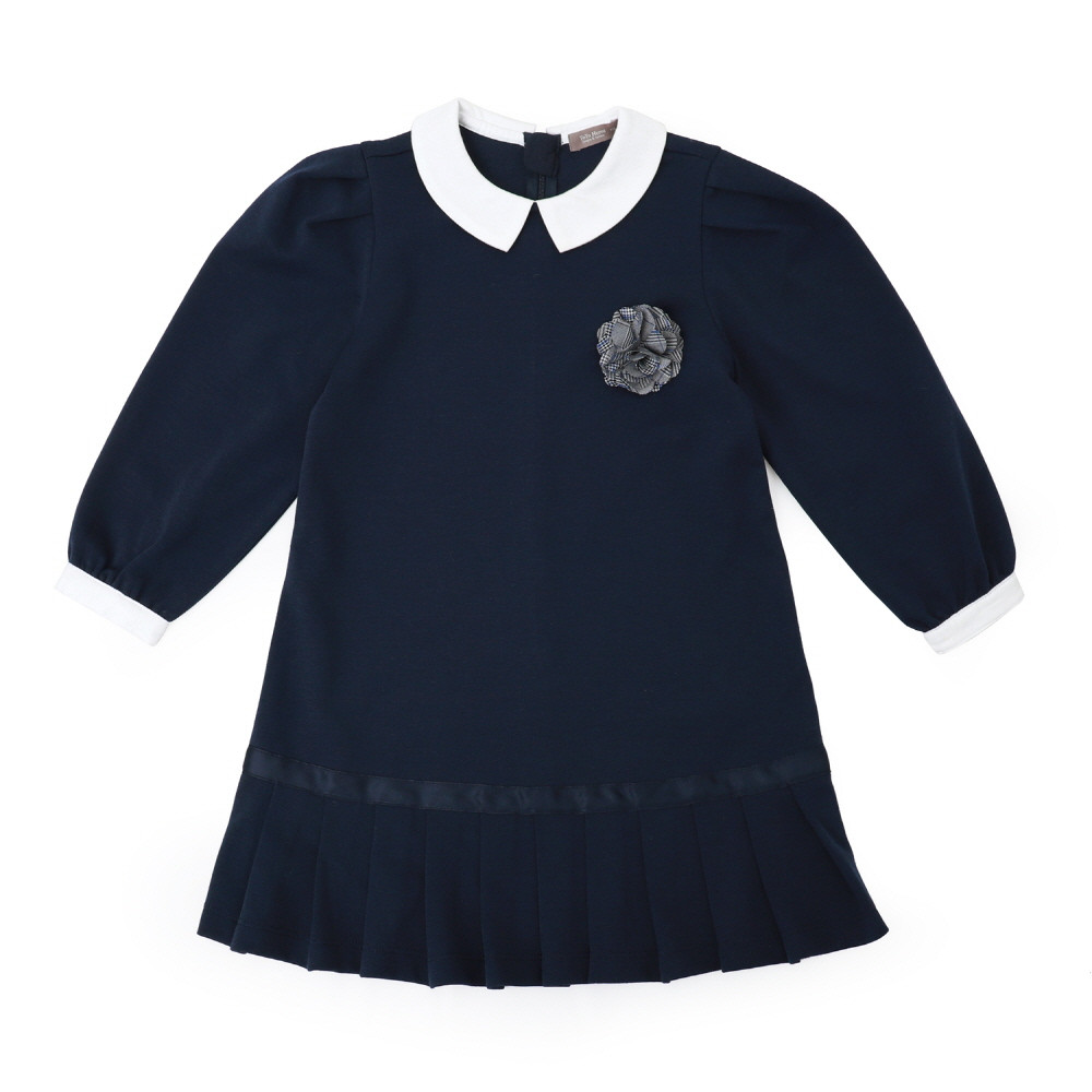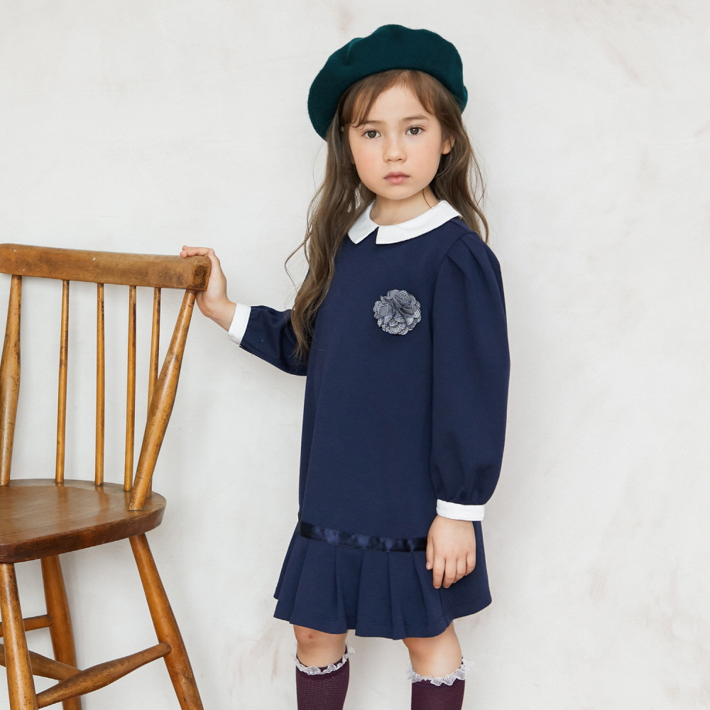 화이트 카라와 화이트 소매끝단 그리고 플리츠 주름이 단정하면서도 고급스러운 정장풍 원피스입니다. 그레이 체크 코사지도 분위기있는 원피스입니다