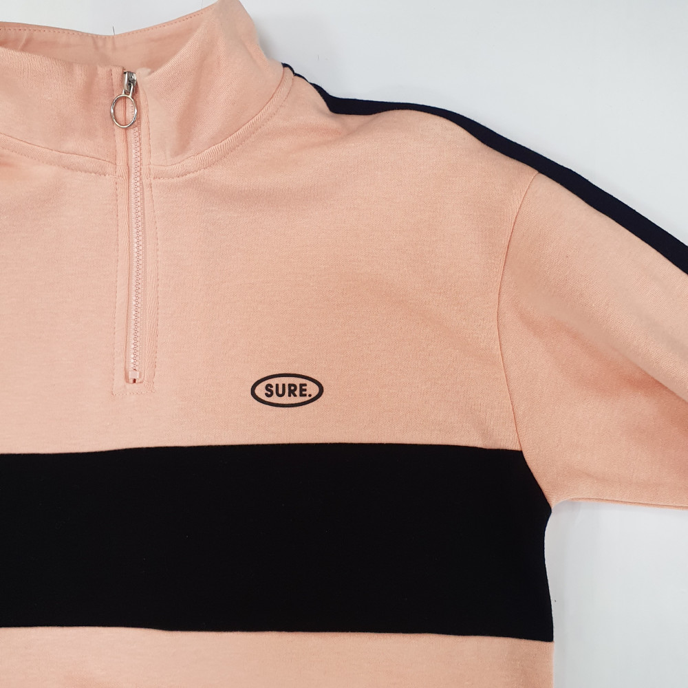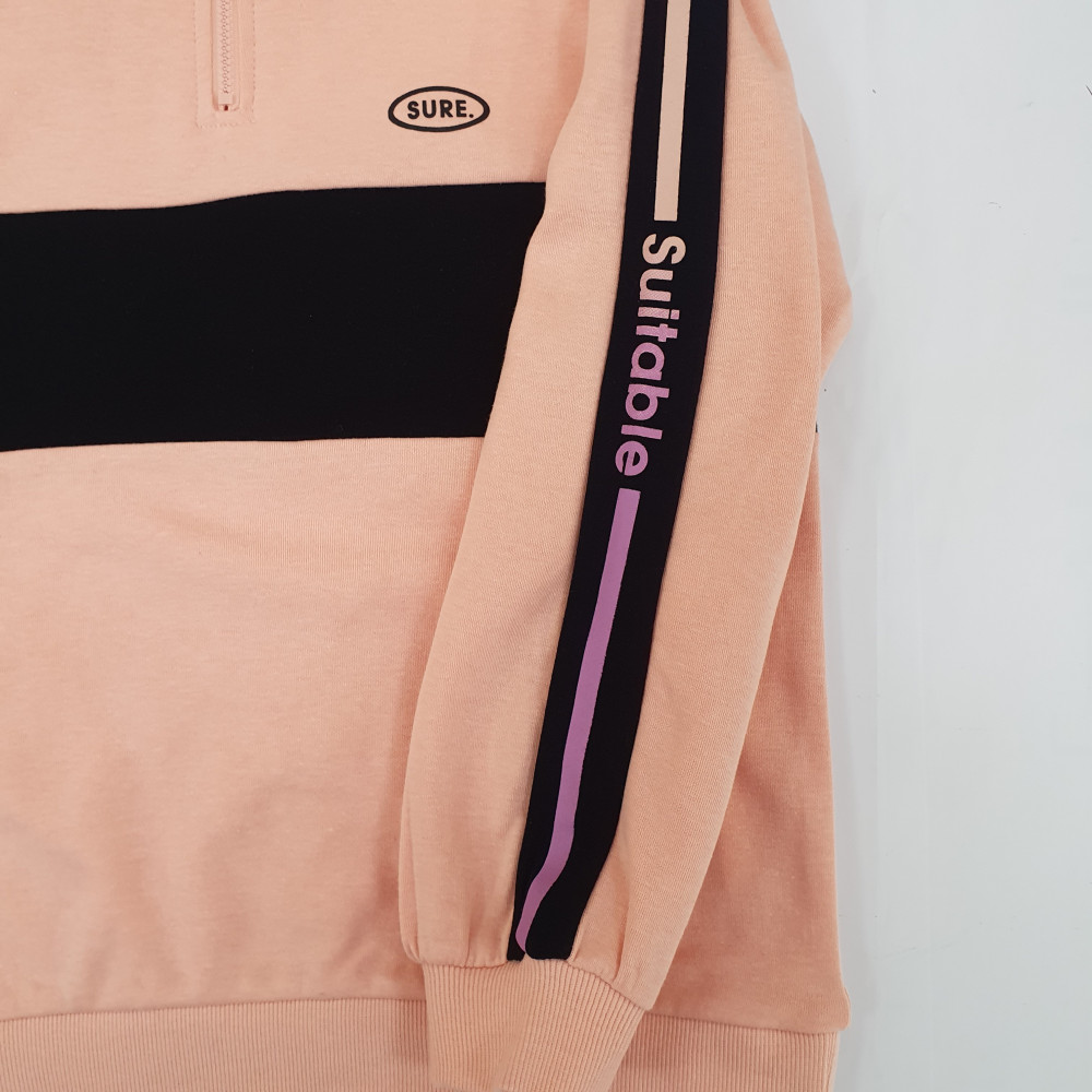 핑크에서 바이올렛으로 그라데이션되는 트레디한 느낌의 프린트가 돋보이는 아노락 티셔츠
