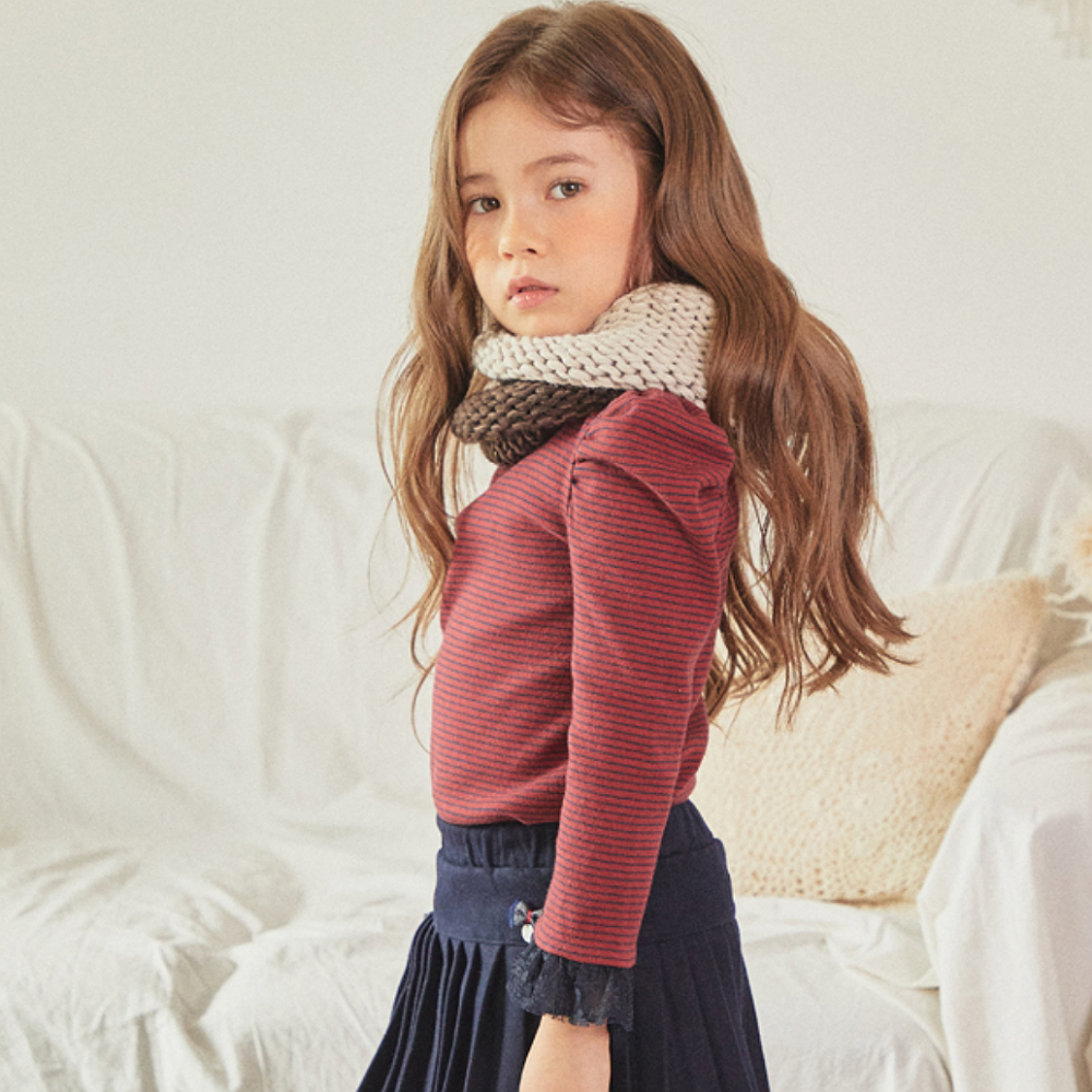 따뜻하게 입을 수 있는 소프트 기모티셔츠입니다. 소매끝단의 레이스 프릴과 소매셔링이 귀여운 러블리한 티셔츠입니다