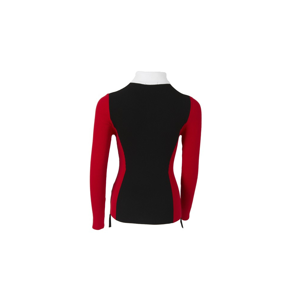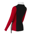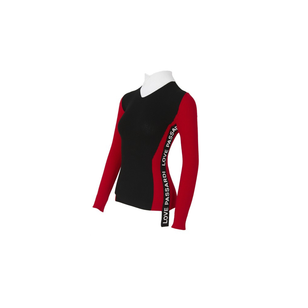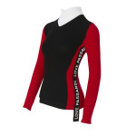 골조직 스웨터 풀오버에 인타샤 편직으로 배색을 넣은 고급스러운 편직의 제품. 아웃심 부분의 배색에 로고 프린트를 넣었고 변형된 카라모양의 넥 디자인이 포인트인 디자인.