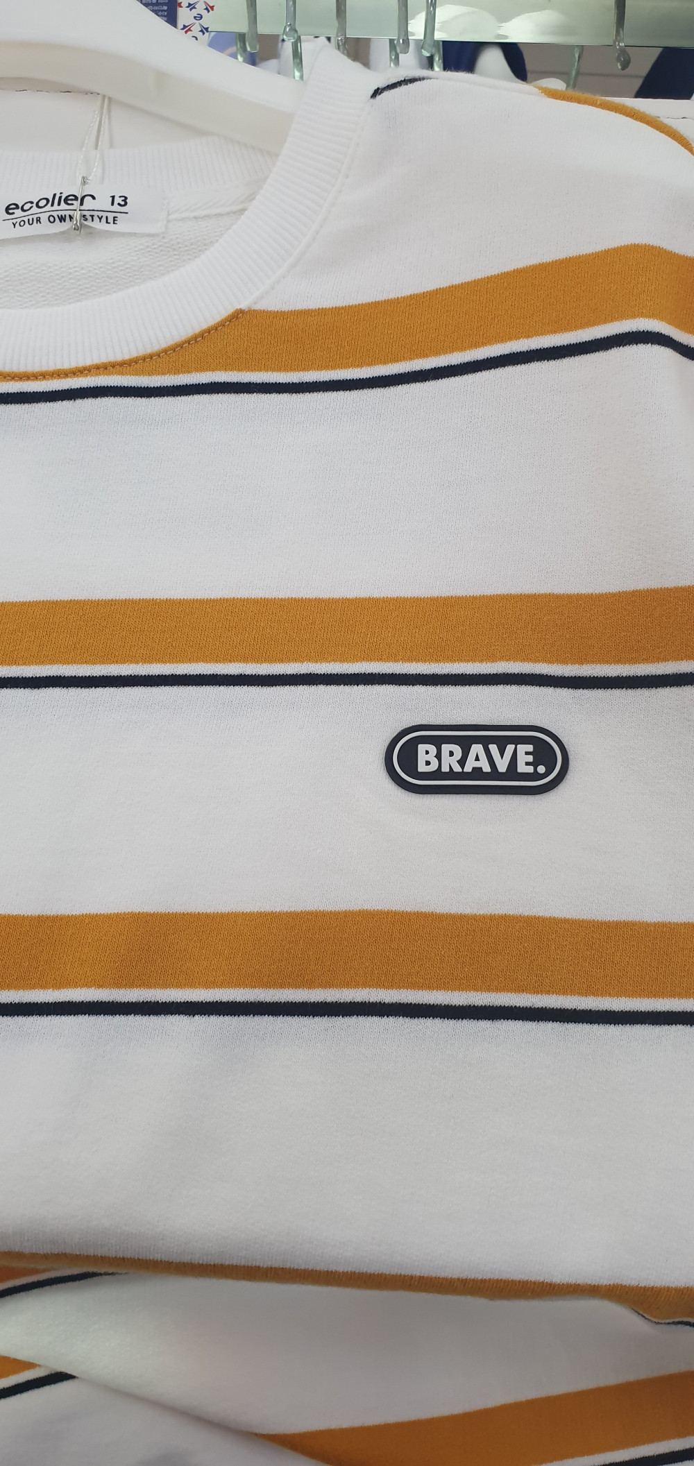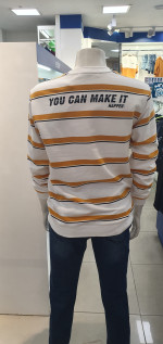 트렌트 컬러인 머스타드색상이 들어간 스트라이프 티셔츠로 베이직한 면바지 청바지와 코디해서 입기좋은 아이템