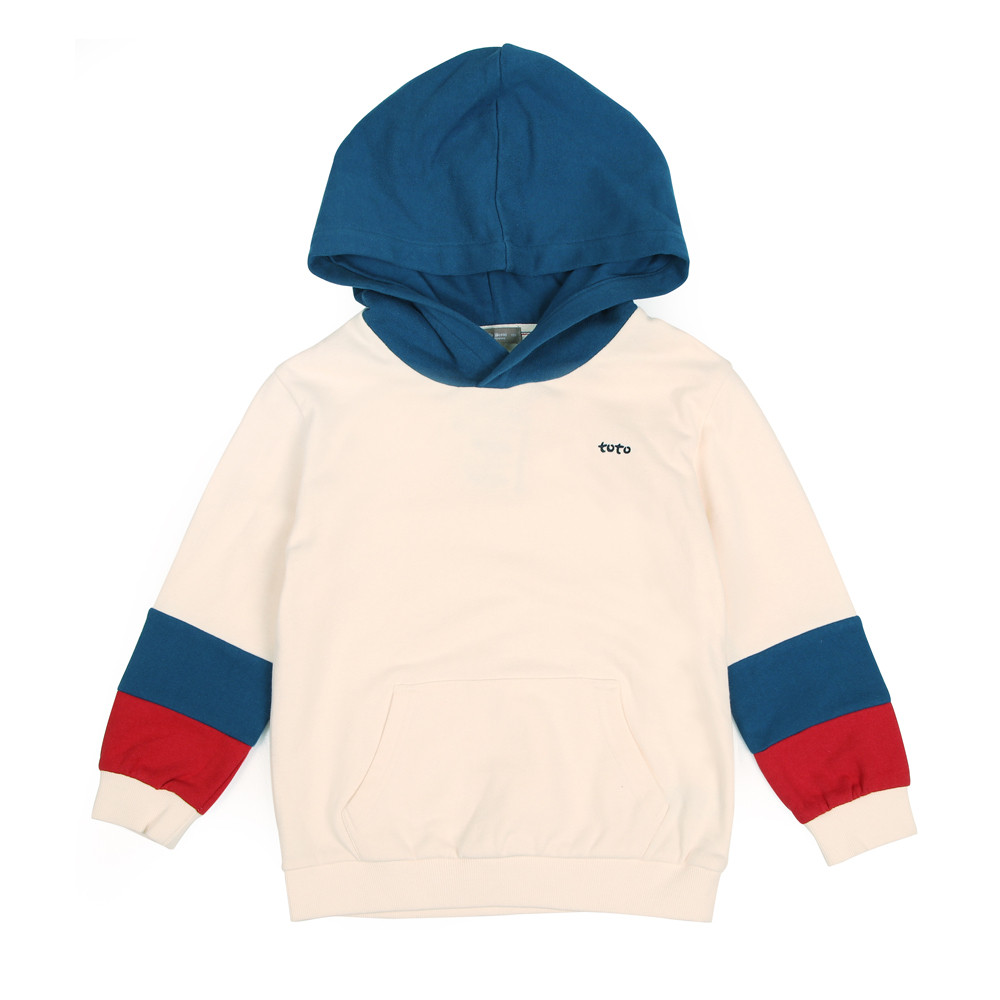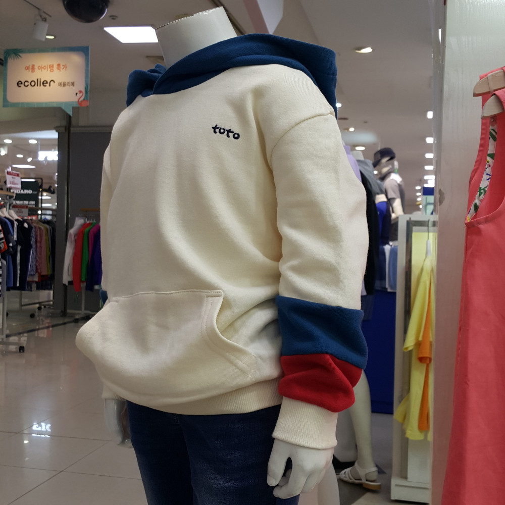 후드와 소매의 배색이 멋스러운 후드티입니다. 여아,남아 모두에게 잘 어울리는 후드티입니다