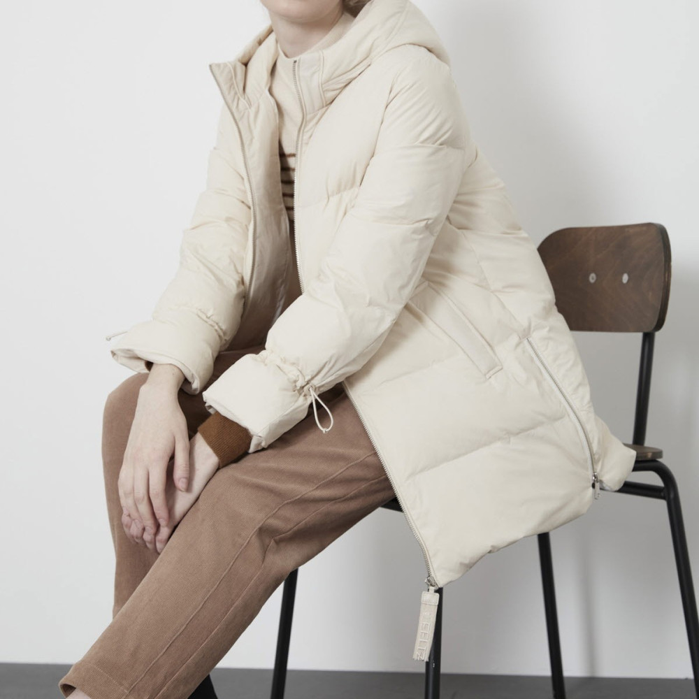 말랑한 소재감이 포근해 보이는 중경량 다운점퍼 입니다 장식 슬라이더로 포인트를 주었습니다