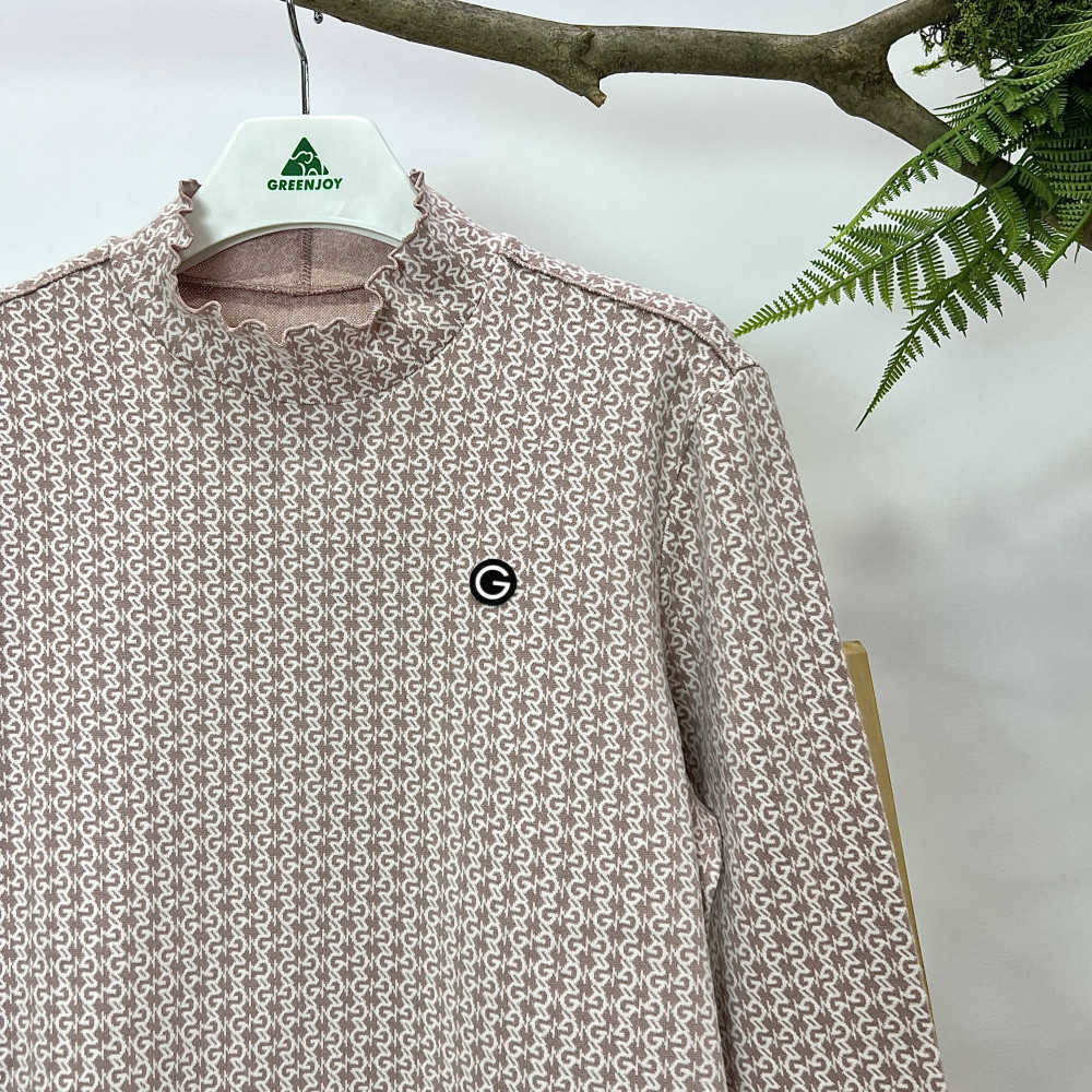 네크라인에 셔링 디테일이 더해진 여성 반목 긴팔 티셔츠입니다.