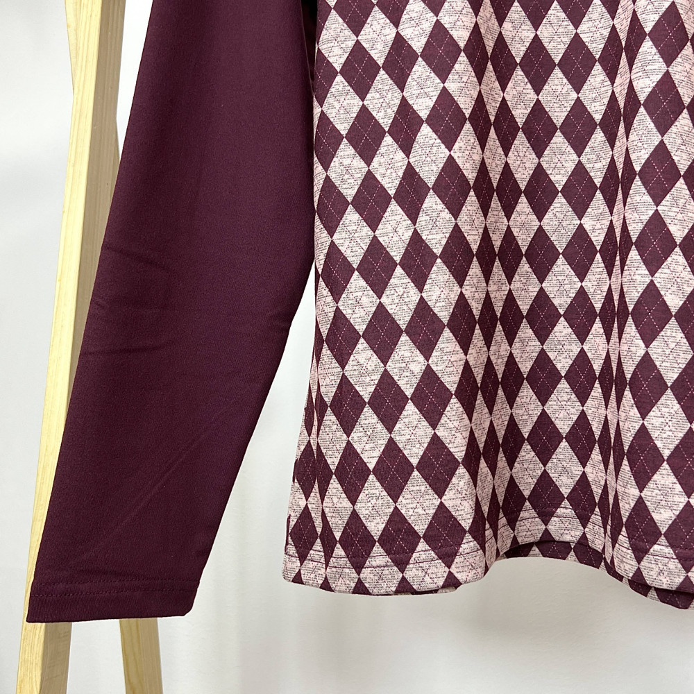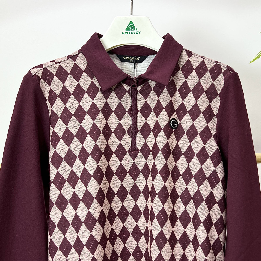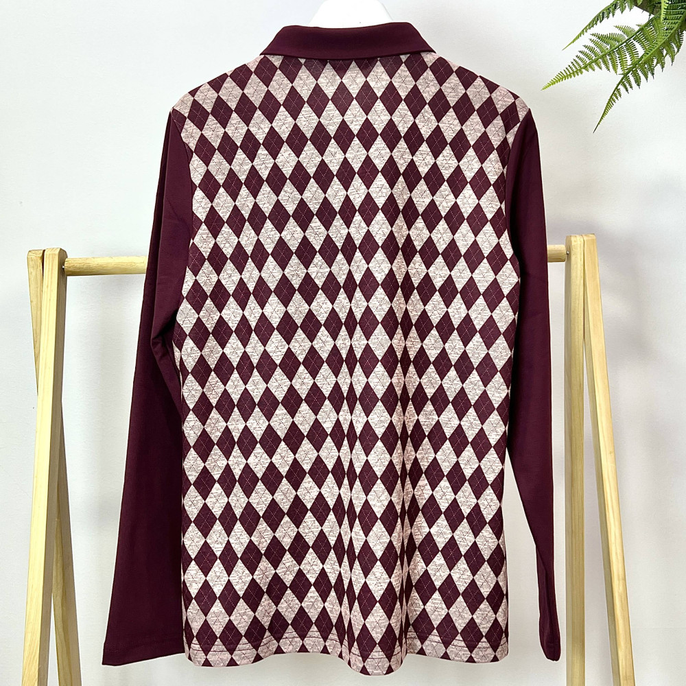 몸판 부분에 아가일 패턴이 더해진 여성 긴팔 카라 티셔츠입니다.