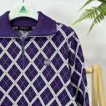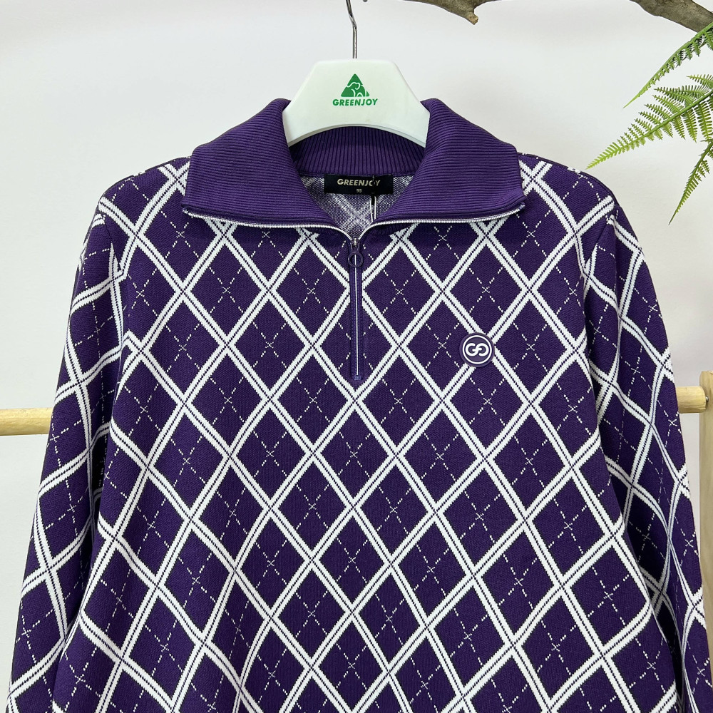 여유로운 핏으로 편안하게 착용하기 좋은 여성 반목 반집업 니트 스웨터입니다. 아가일 패턴이 더해져 멋스러운 느낌을 줍니다.