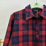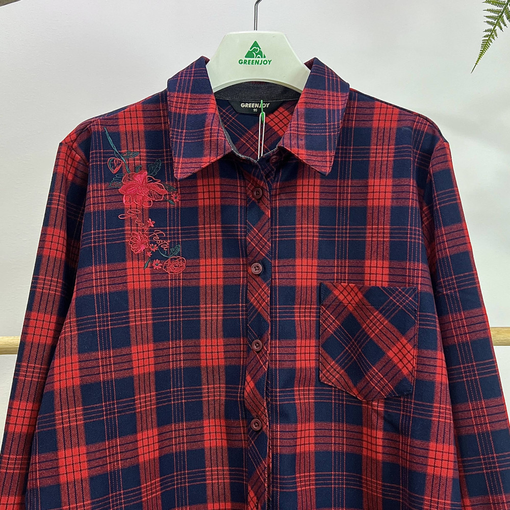 자수 포인트를 더해준 여성 중기장 체크 셔츠입니다. 캐주얼한 느낌으로 편안하게 착용하기 좋습니다.