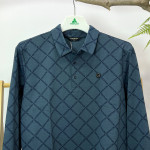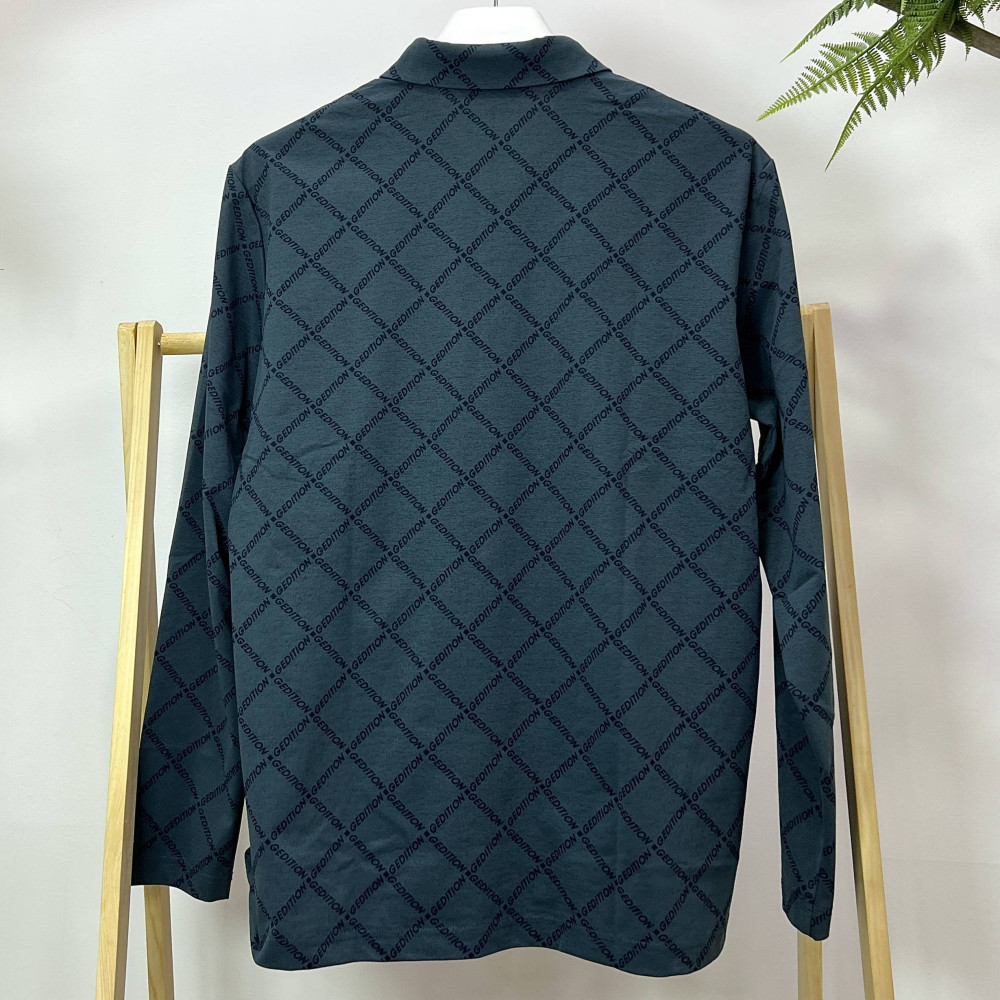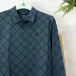 전판에 다이아 모양으로 로고 프린트가 더해진 남성 긴팔 카라 티셔츠입니다.