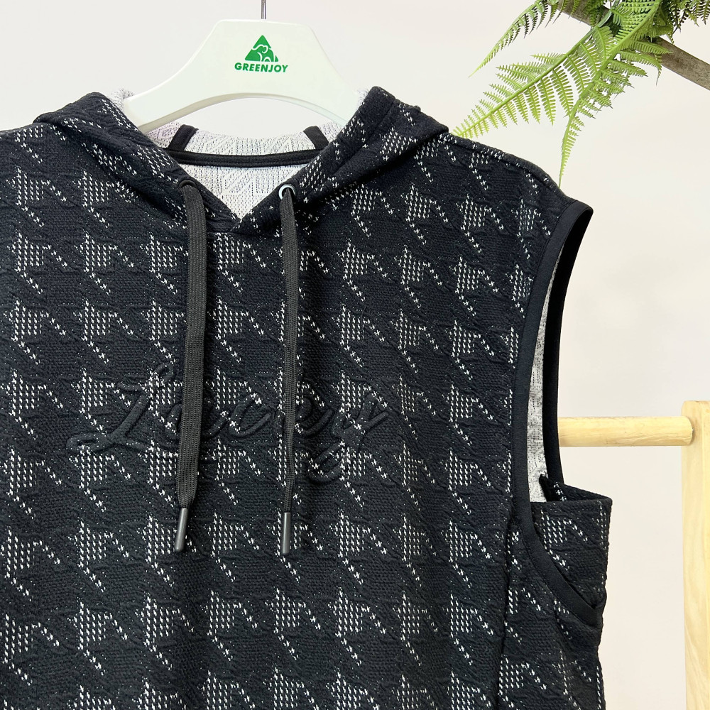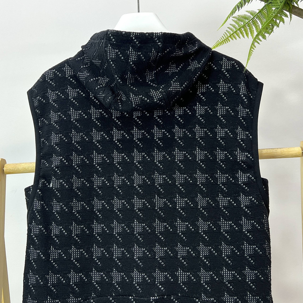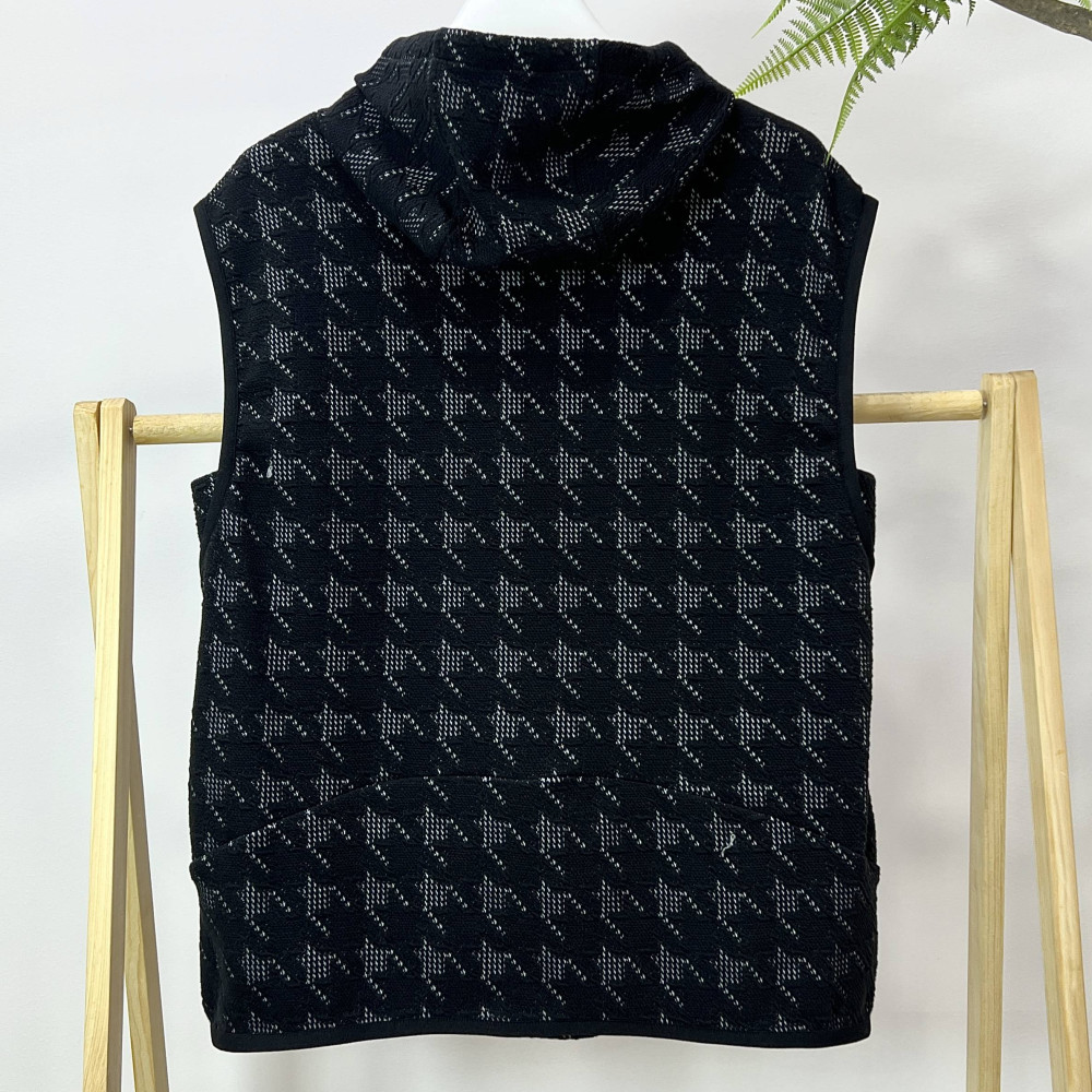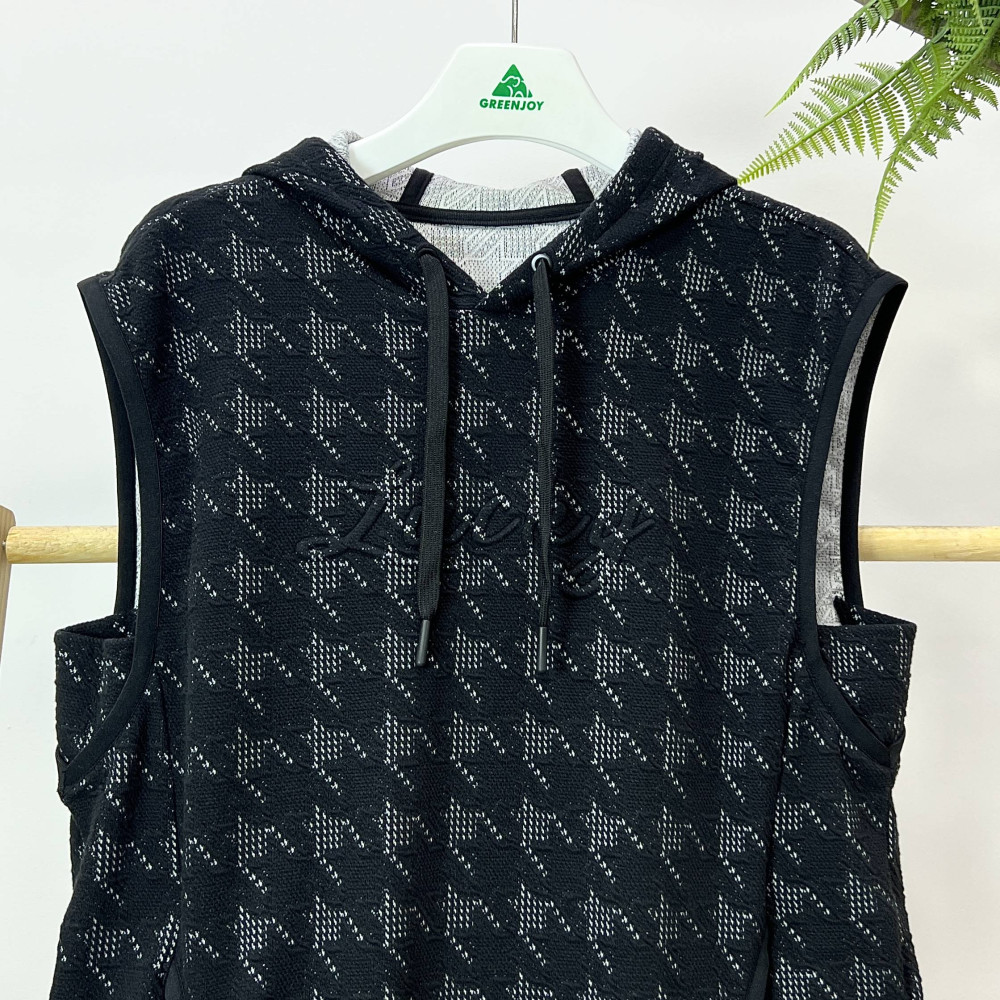 가슴 부분에 엠보 로고가 포인트로 더해진 체크 패턴의 여성 후드 베스트입니다. 캐쥬얼한 느낌으로 편안하게 착용하기 좋습니다.