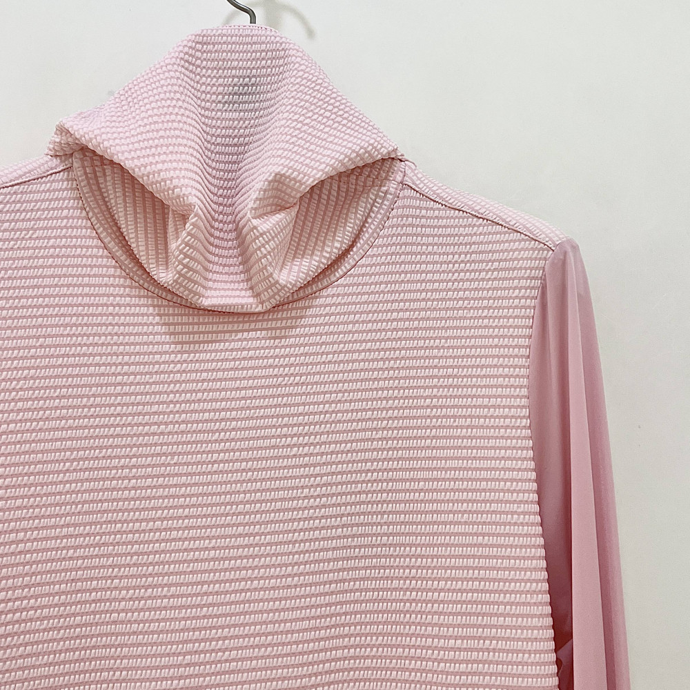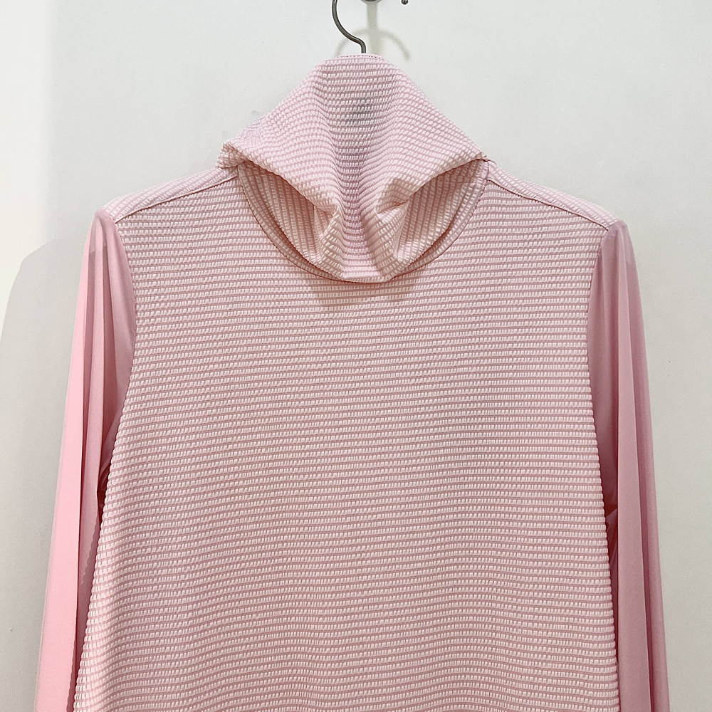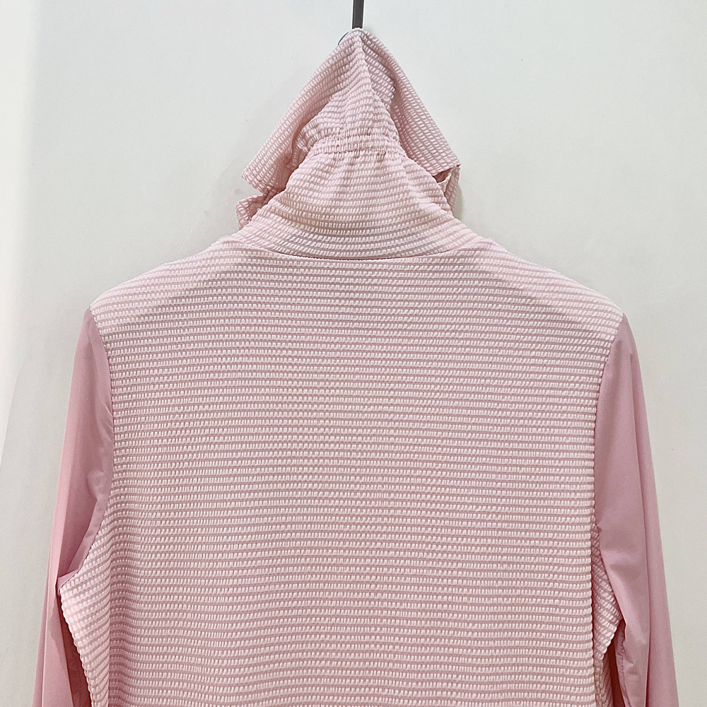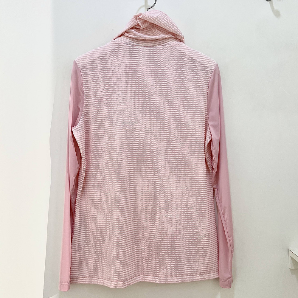가볍고 시원하게 착용하기 좋은 시어서커 소재의 여성 폴라 티셔츠입니다. 마스크 처럼 활용할 수 있어 자외선 차단에 좋습니다.