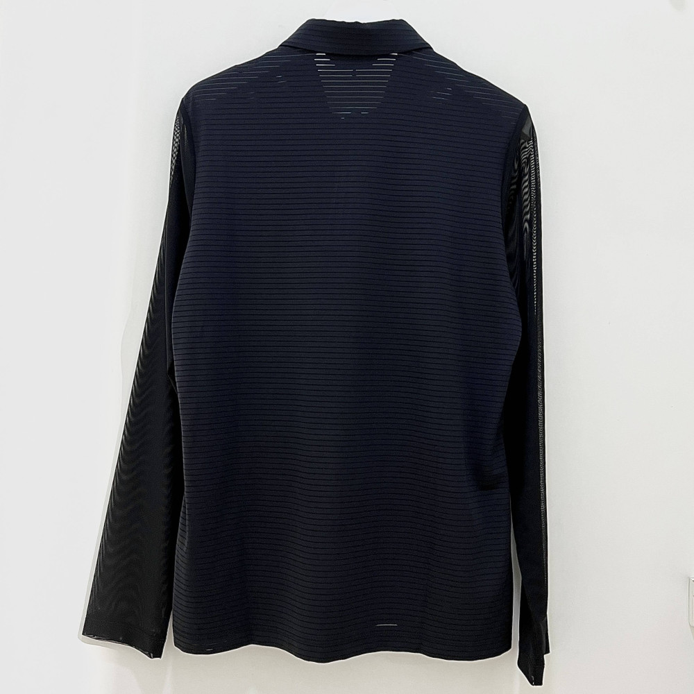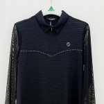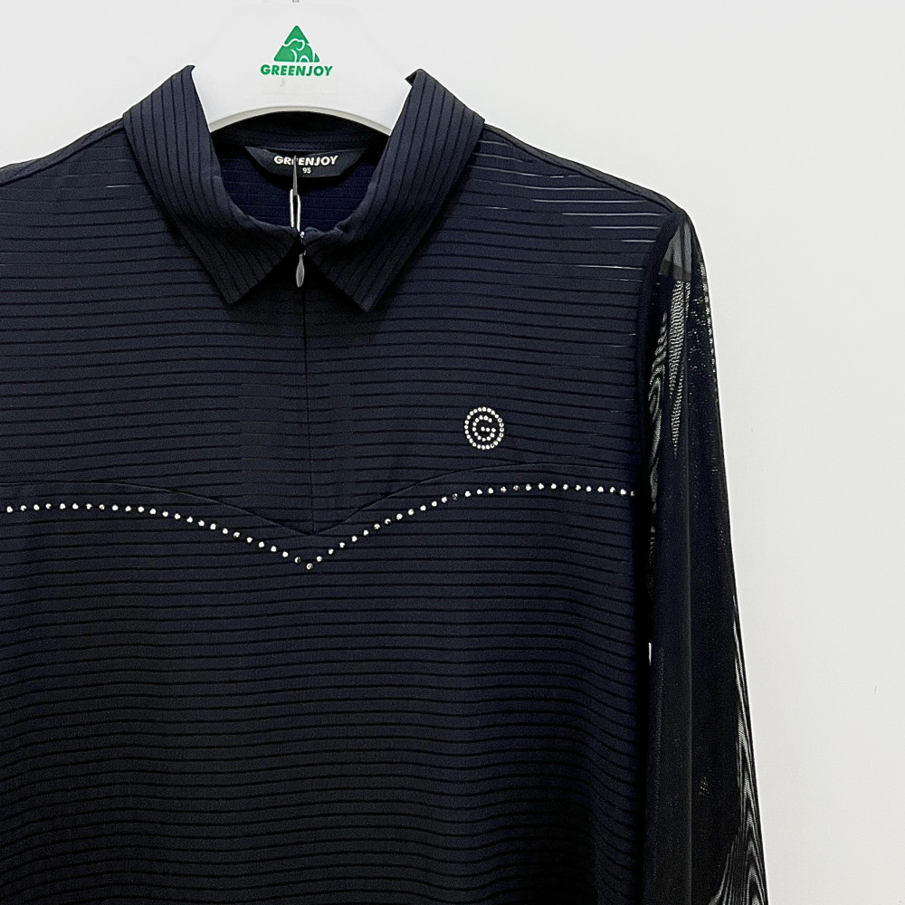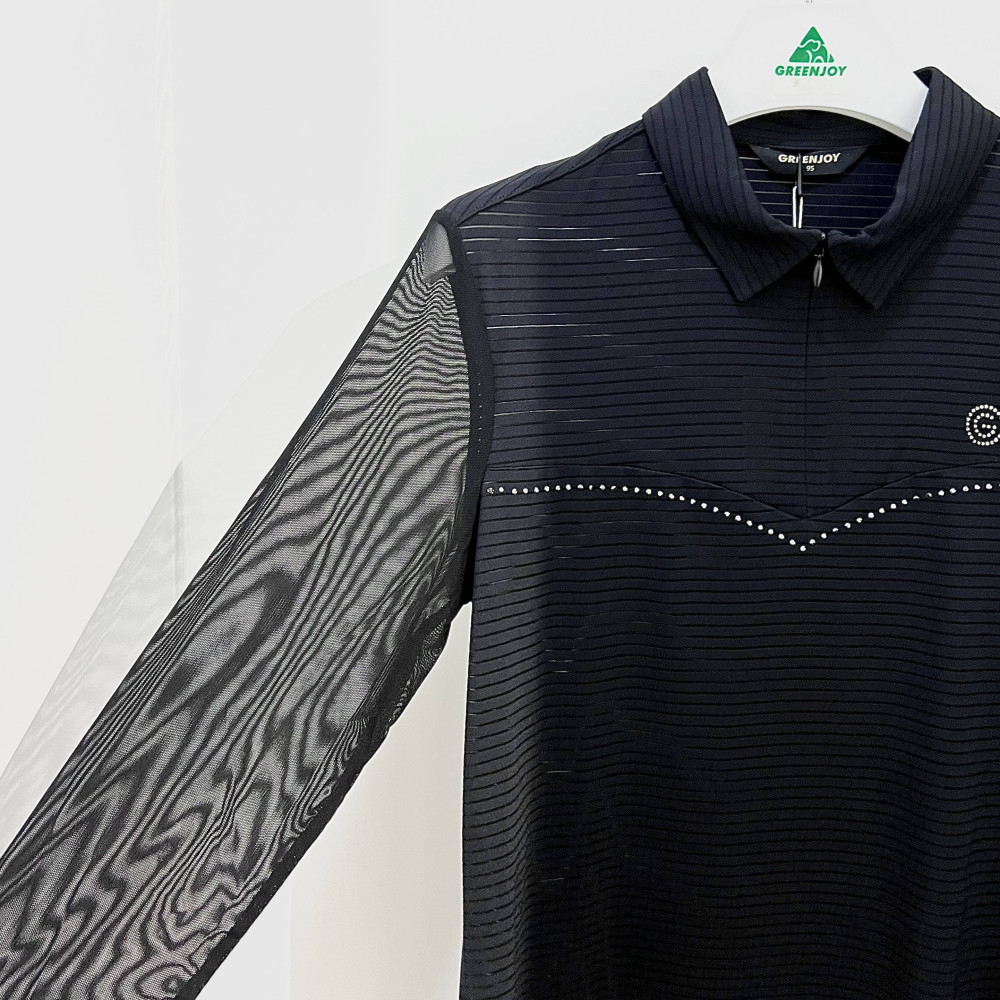 소매 부분 메쉬 소재 배색이 더해진 여성 긴팔 반지퍼 티셔츠입니다. 얇고 가벼워 시원하게 착용하기 좋습니다.