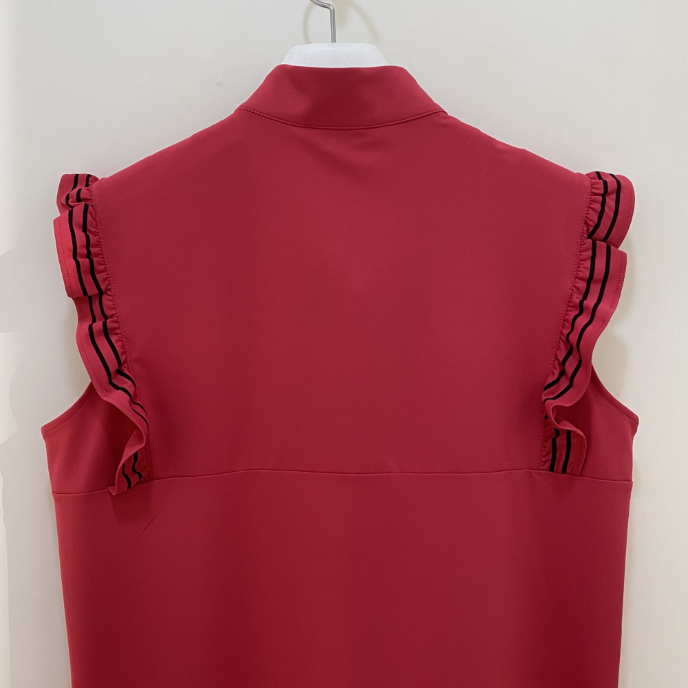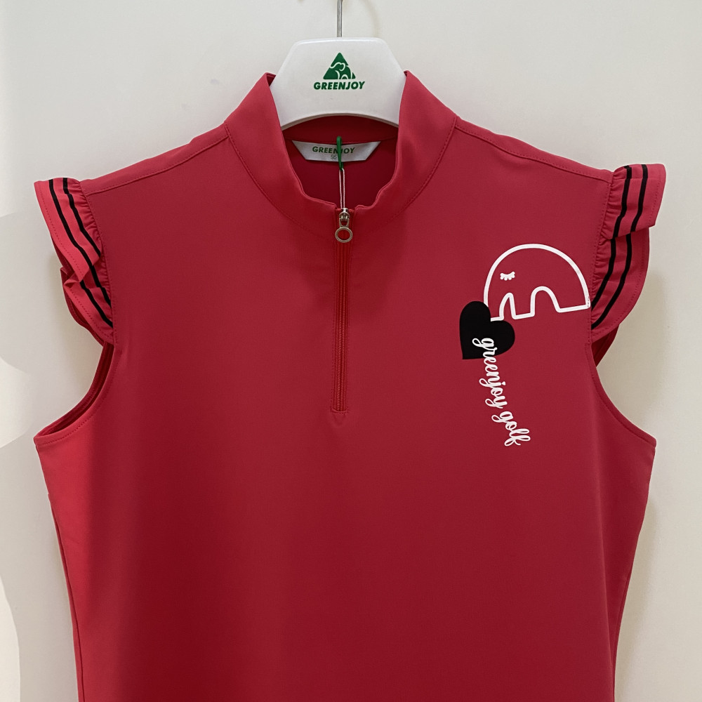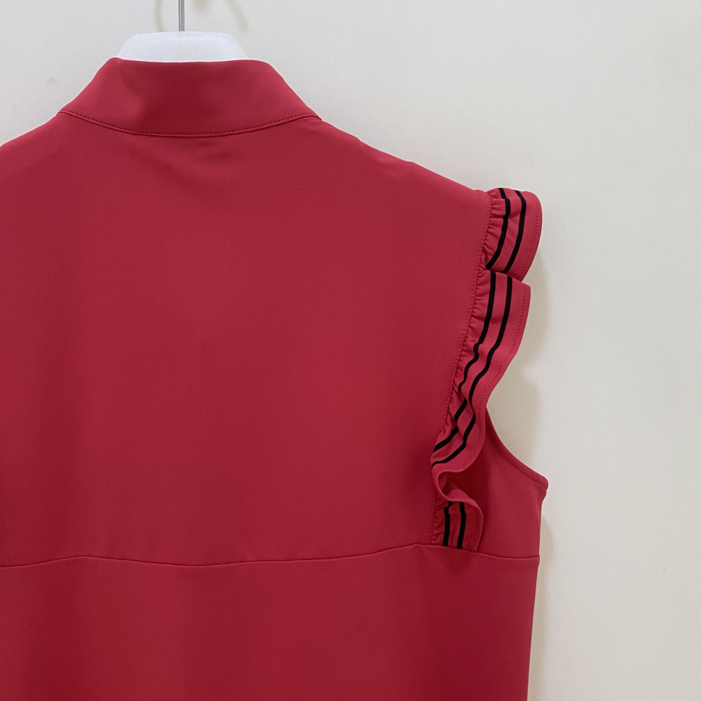 프릴 소매 디자인으로 캐주얼한 느낌을 더해준 하이넥 반집업 슬리브리스 티셔츠입니다.