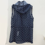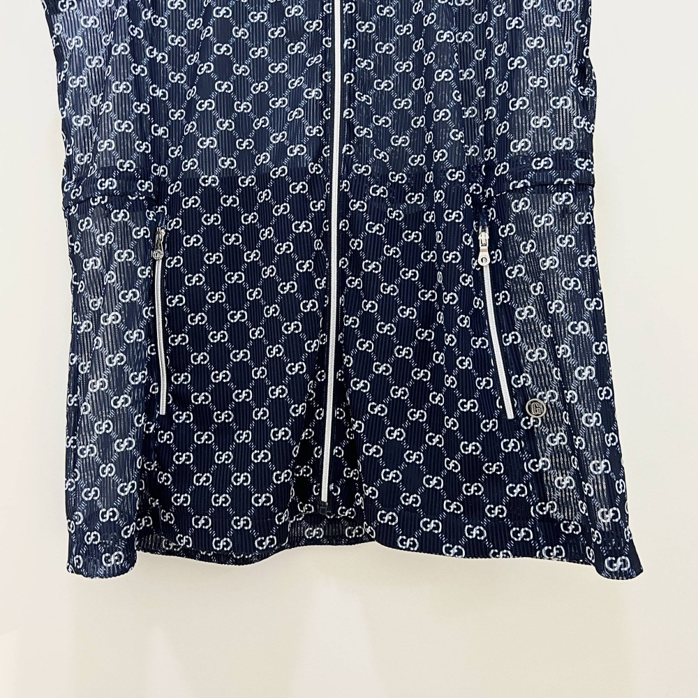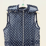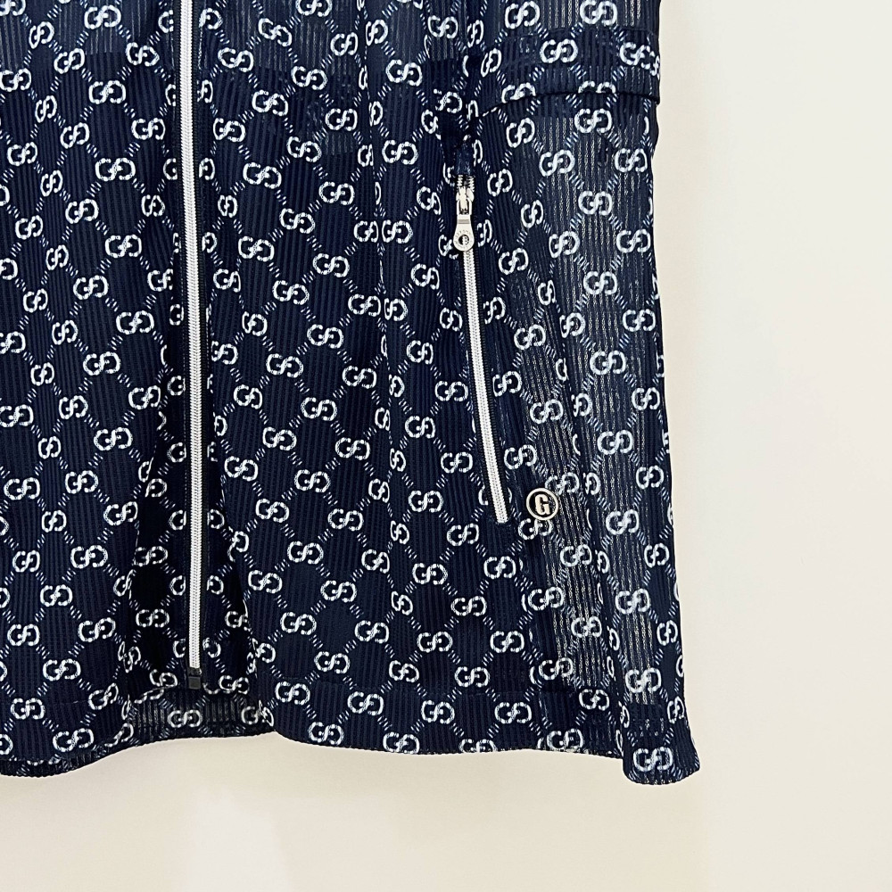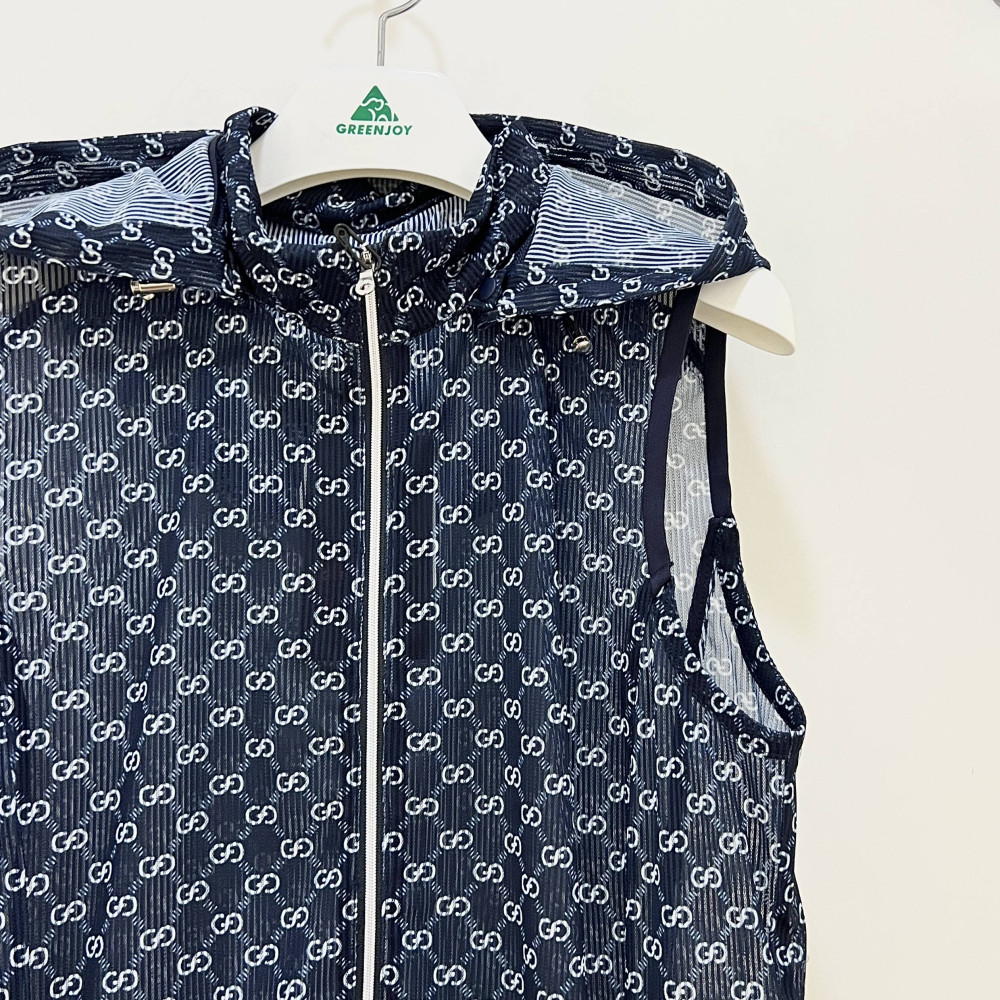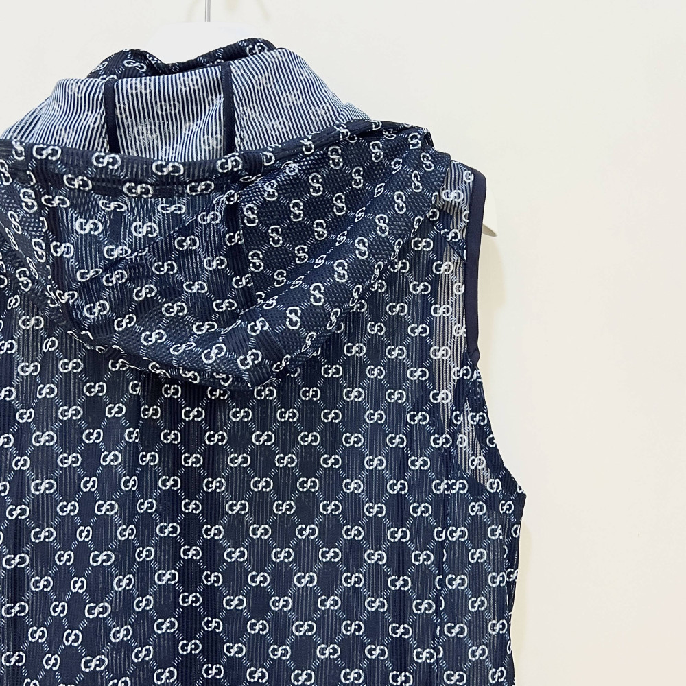 전판 G 로고 패턴의 여성 후드 집업 베스트 조끼입니다. 메쉬 소재로, 가볍고 편안하게 착용하기 좋습니다.