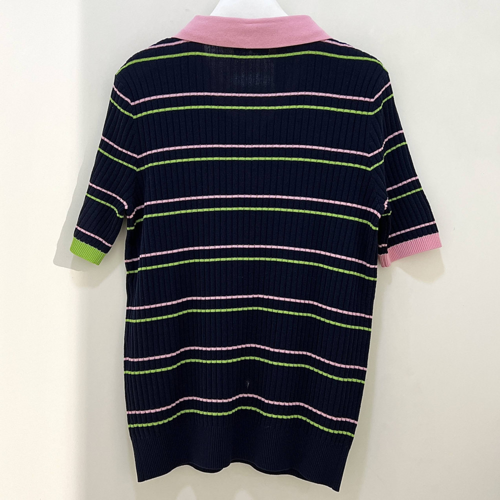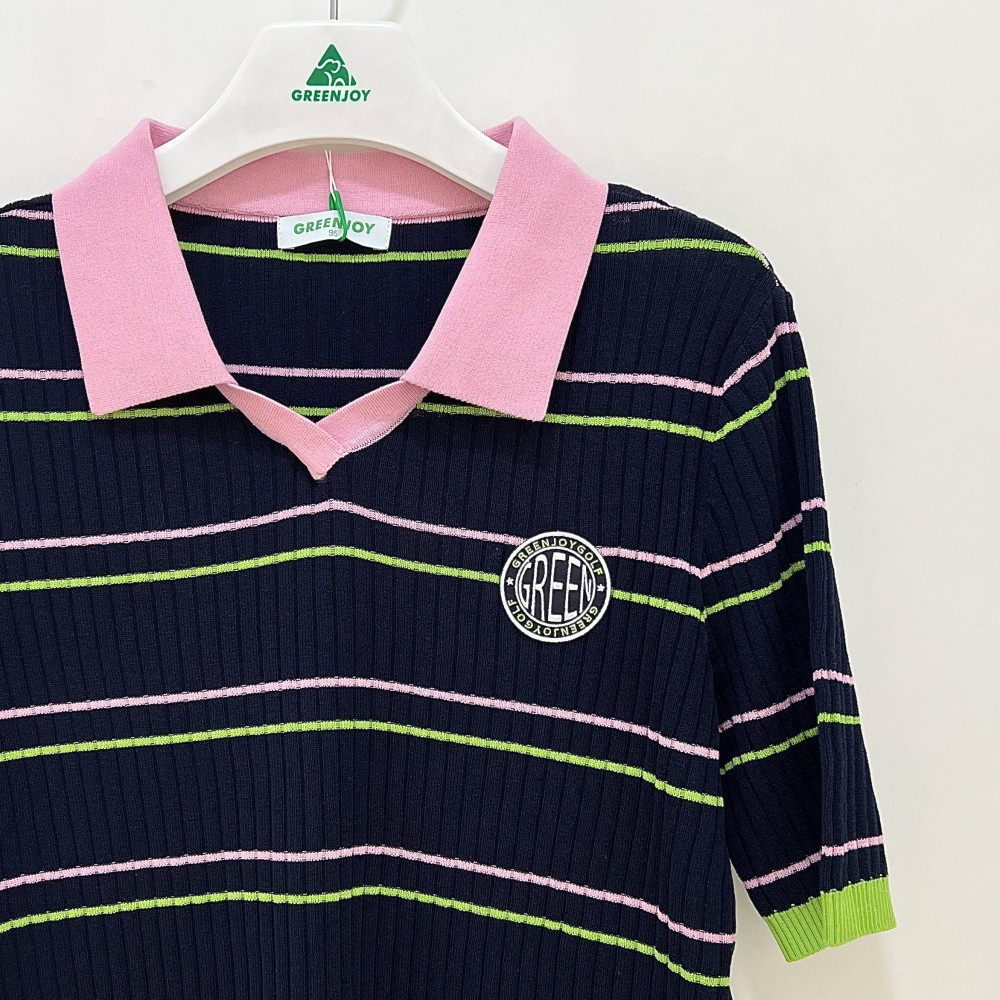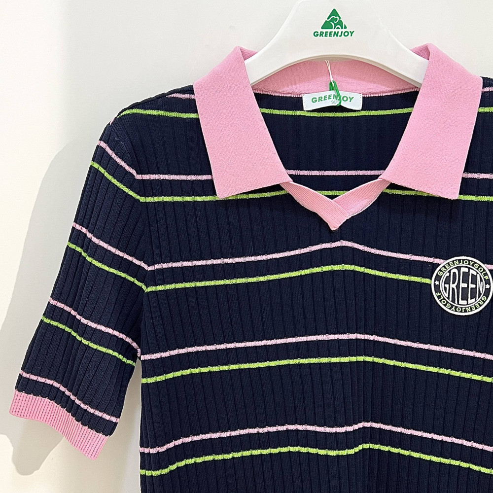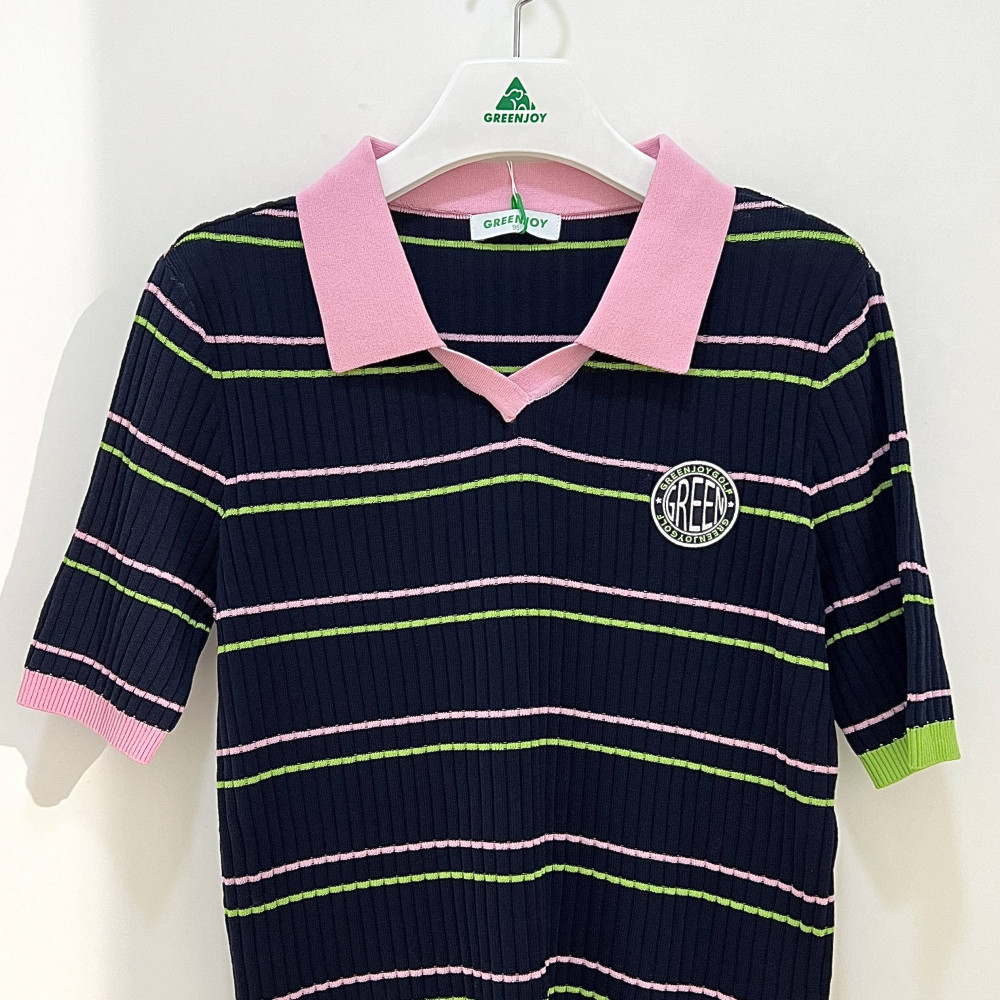 카라 부분에 컬러 포인트 배색을 더해준 여성 반팔 카라 니트 티셔츠입니다. 세로 골지 패턴으로 착용 시 슬림하게 연출해줍니다.