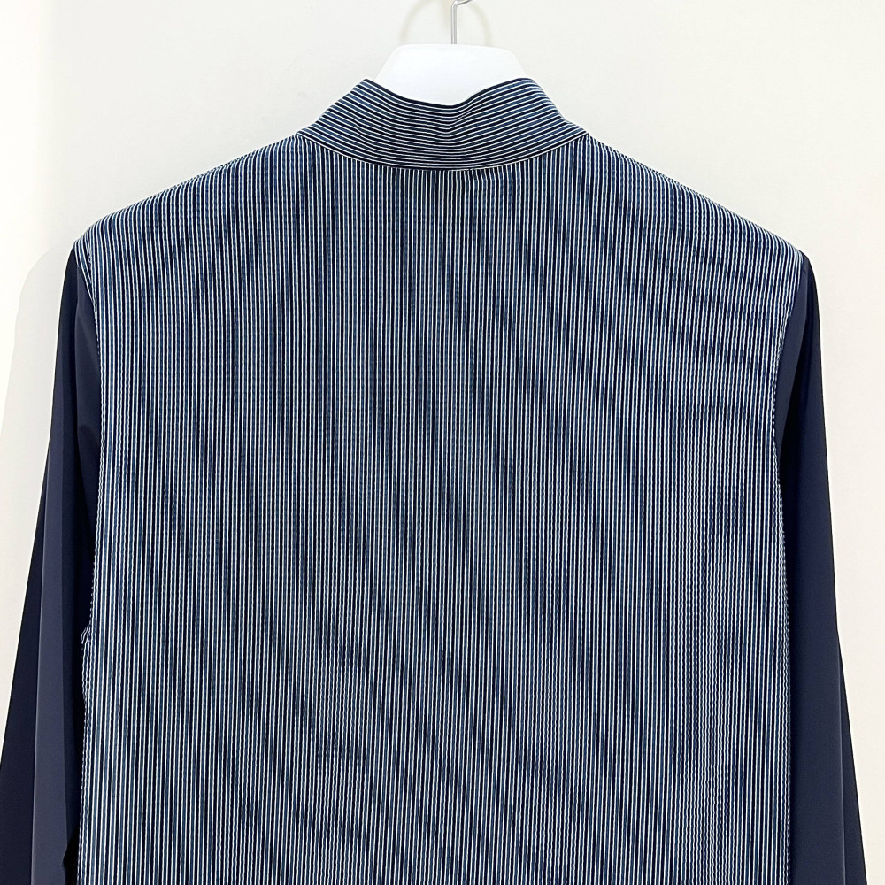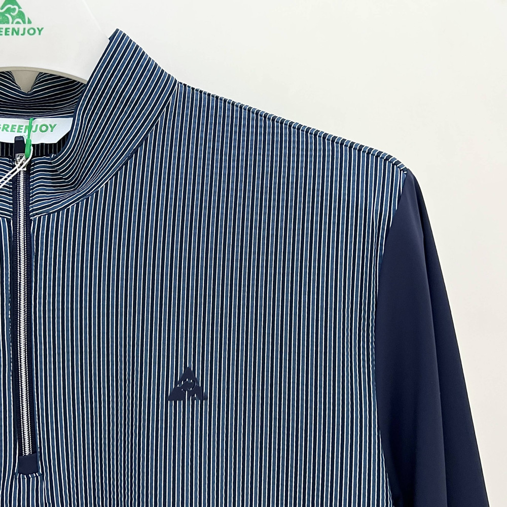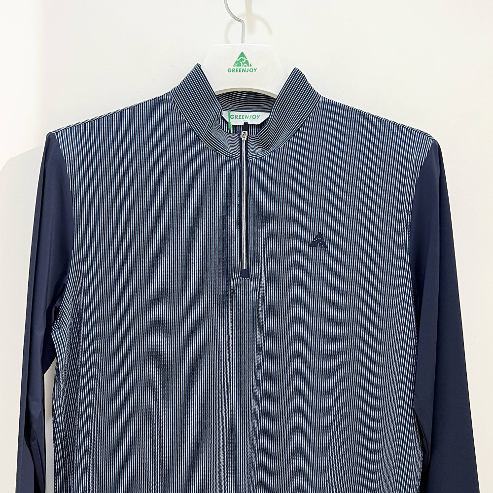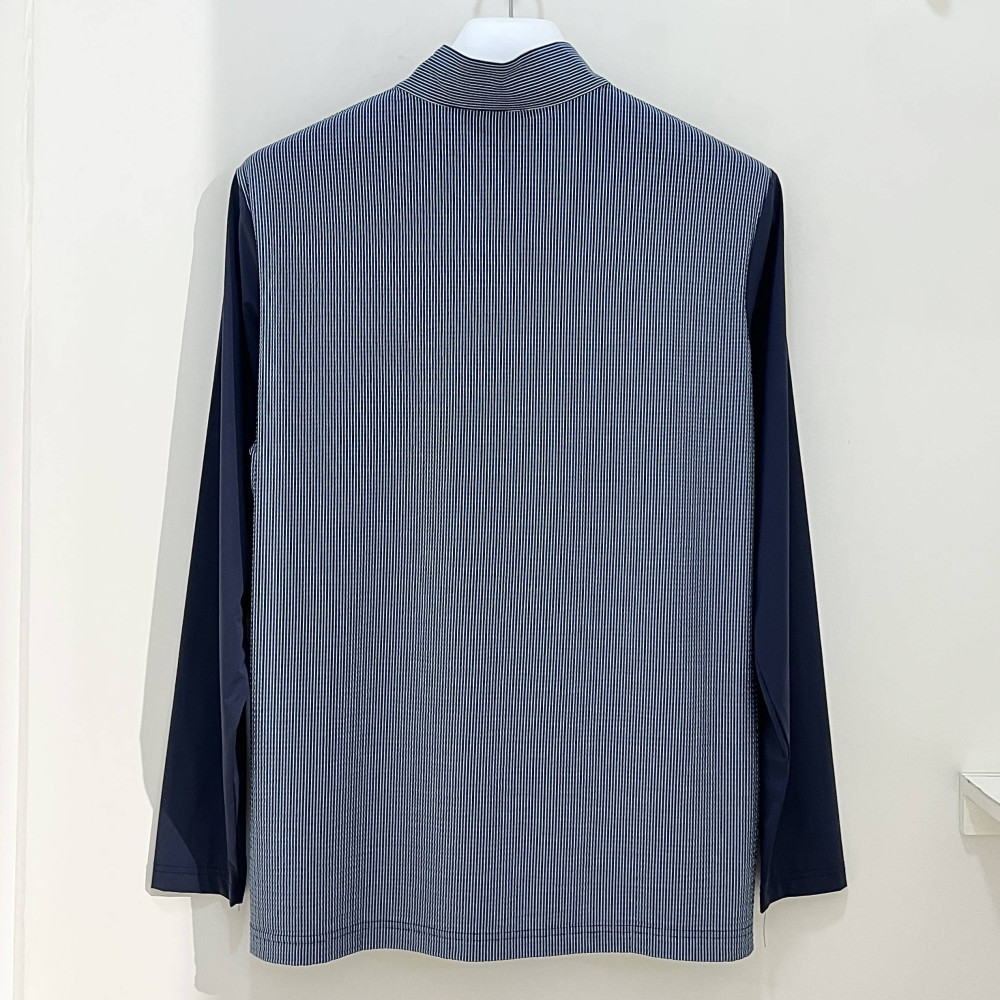 몸판 부분에 잔스트라이프 패턴을 더해준 남성 반하이넥 하프 집업 긴팔 티셔츠입니다.