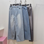 신축성이 좋은 얇은 데님팬츠로 인밴드가있어 허리 조절이 가능하며 가장 많이 즐겨입는 통이 있는 일자 느낌의 세미와이드핏팬츠
