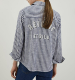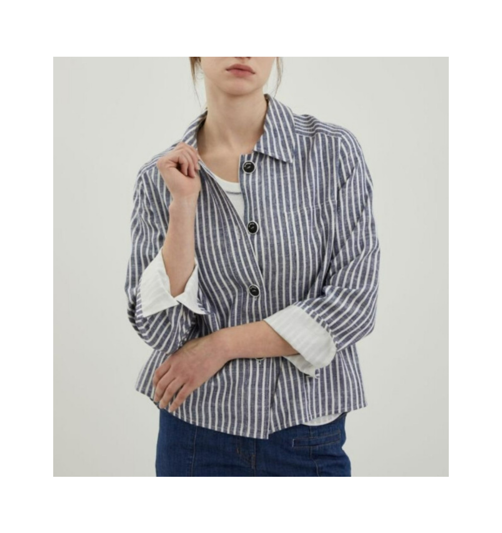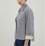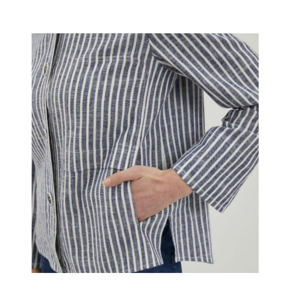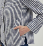 섬세한 스트라이프 패턴 아우터형 셔츠 주머니가 있어 케주얼하고