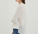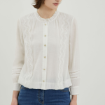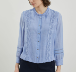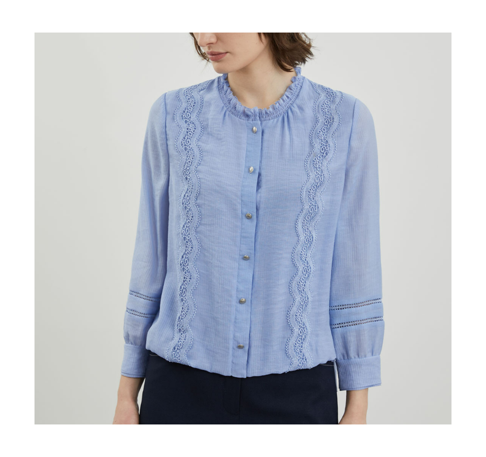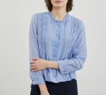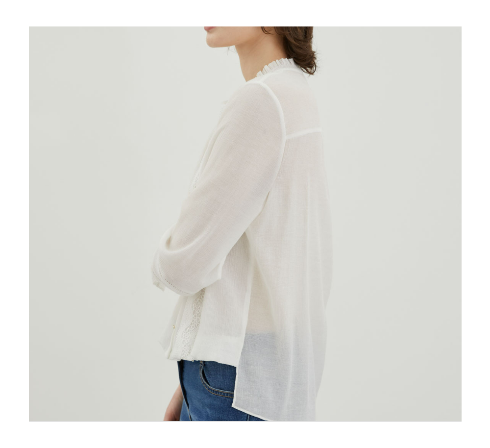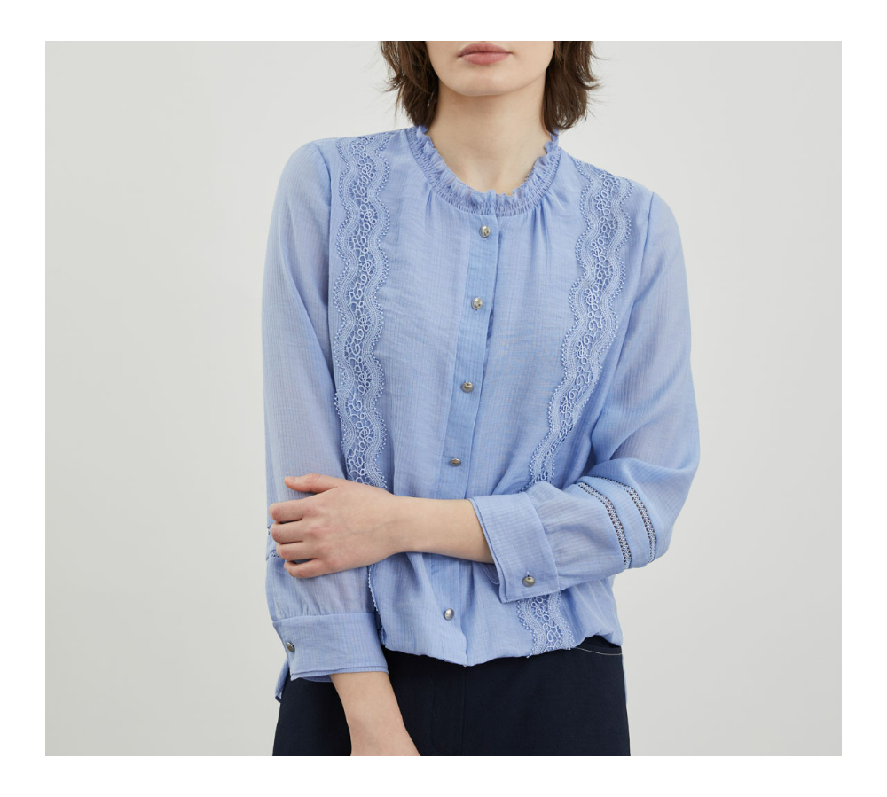페미닌한 레이스테입과 골드버튼이 포인트되는 블라우스 입니다