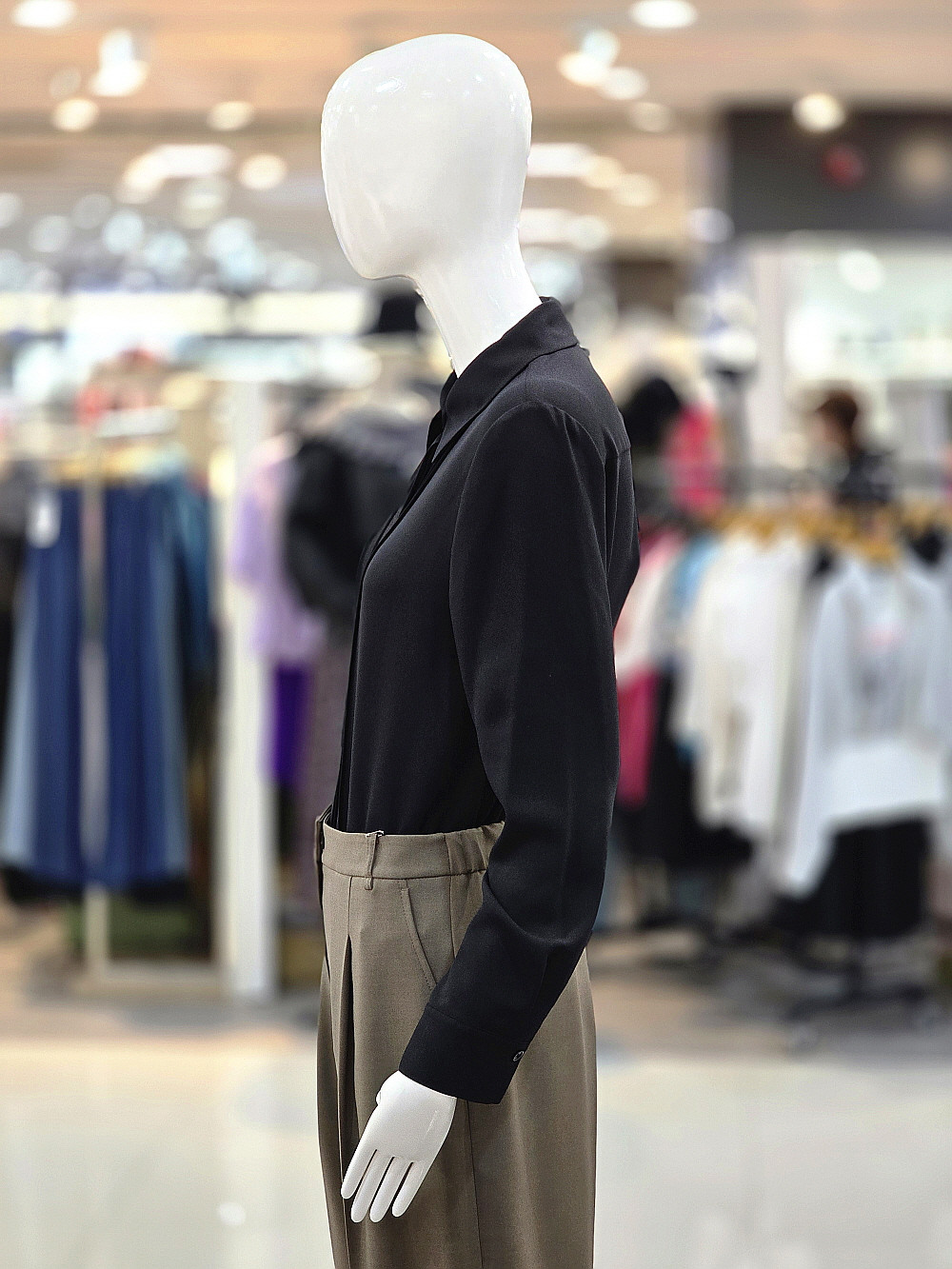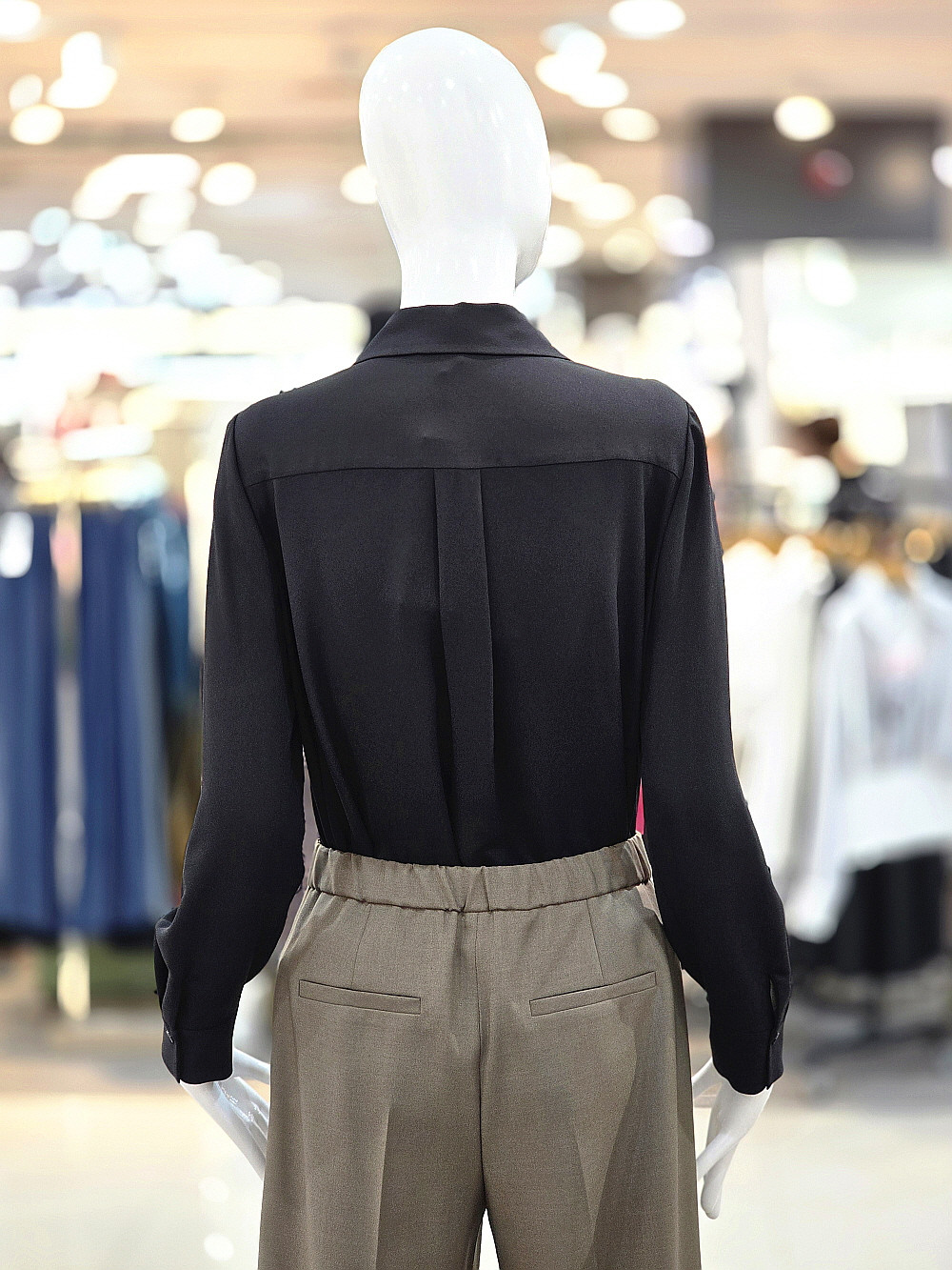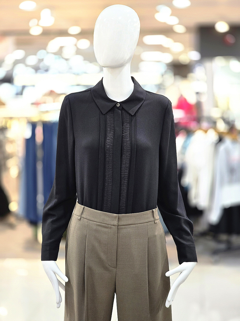 단정한 카라 디자인과 셔링 디테일이 매력적인 블랙 블라우스예요.