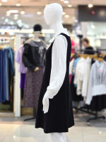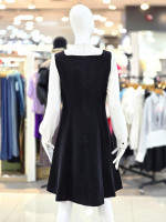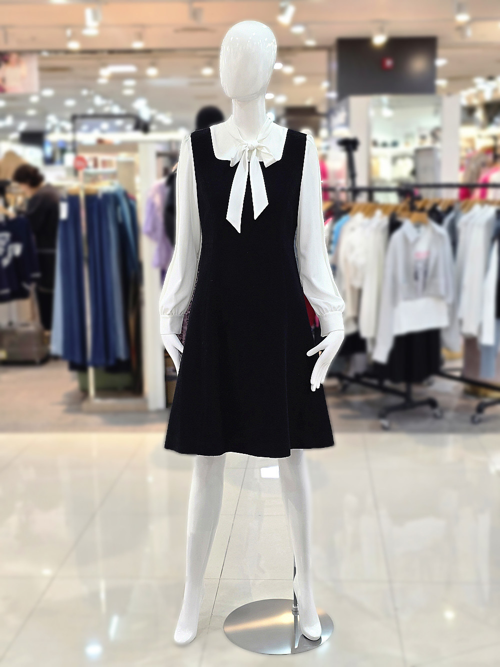 화이트 리본 타이 블라우스와 블랙 원피스가 조화된 여성스러운 레이어드 스타일 원피스입니다.