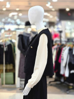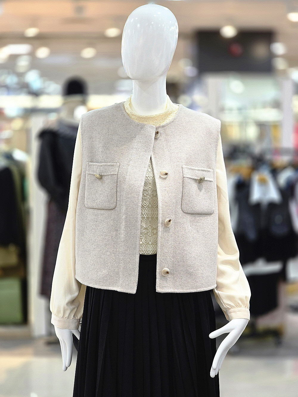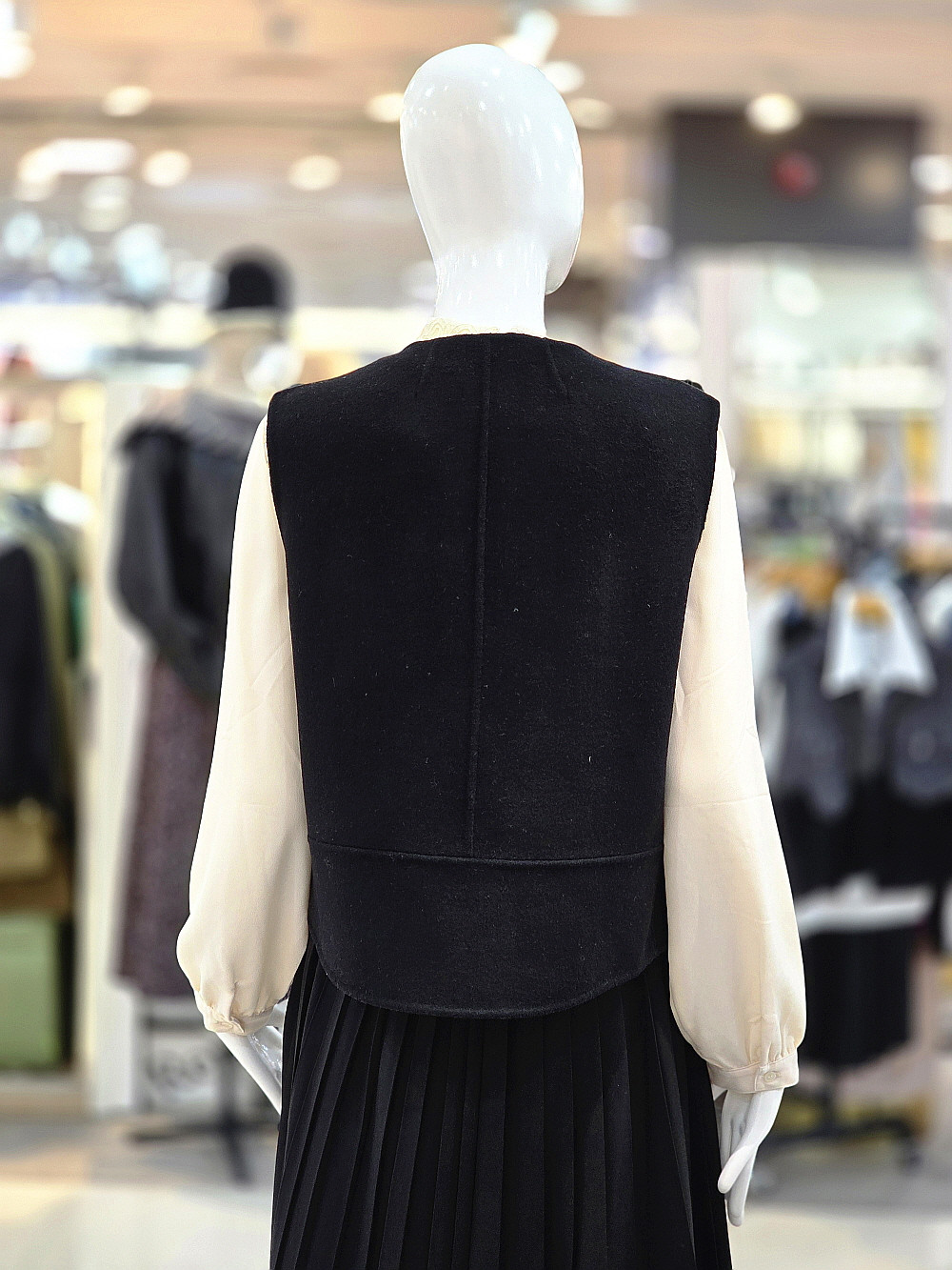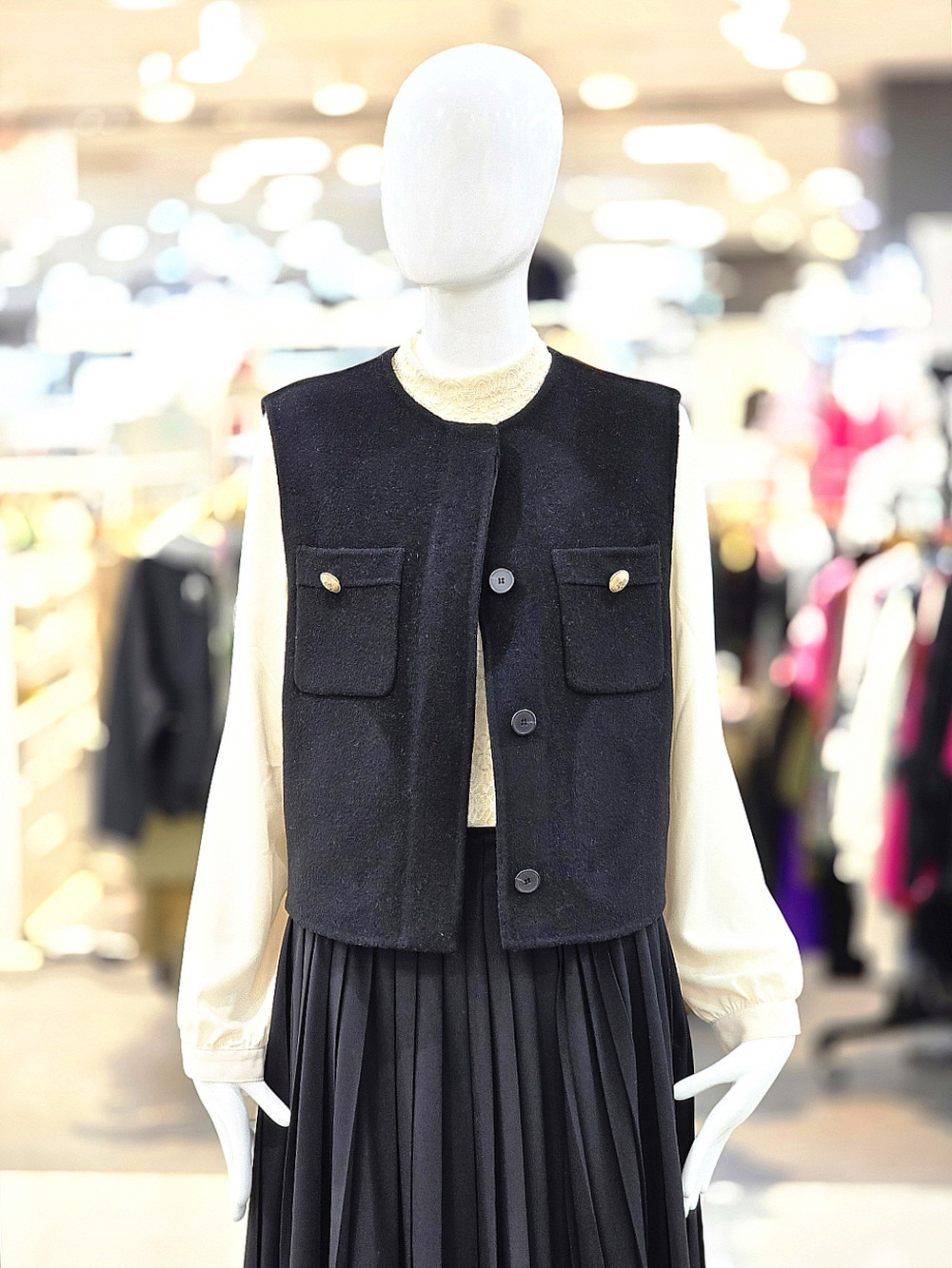 세련된 블랙 컬러에 금장 버튼 디테일이 돋보이는 베스트입니다.