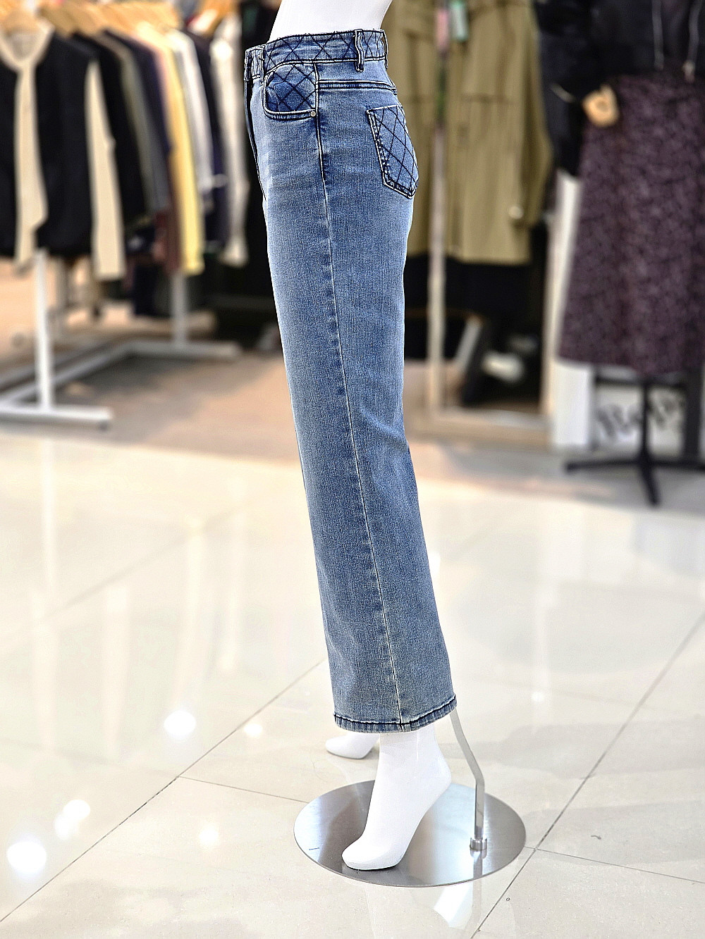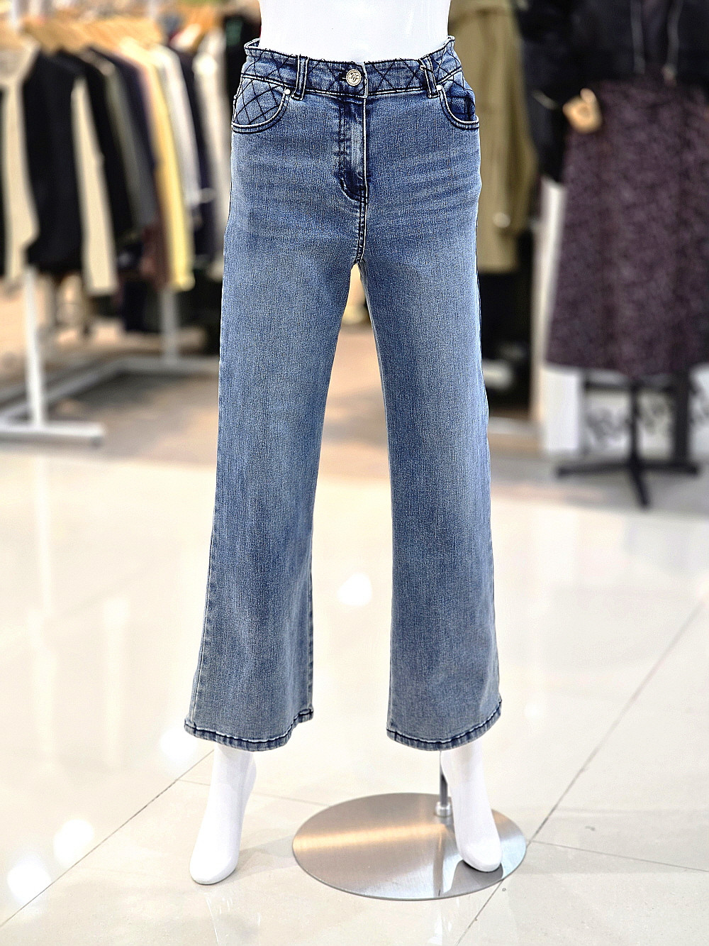 포켓 부분 퀼팅 디테일이 돋보이는 데님 팬츠입니다.