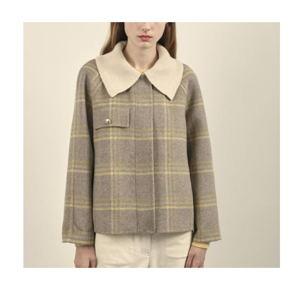 옐로우 핀칼라가 포인트되는 체크소재의 핸드메이드 자켓 입니다