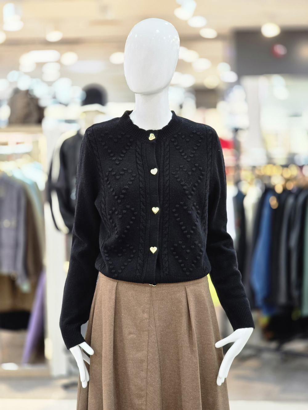 입체적인 짜임 디테일과 하트 버튼 장식으로 포인트를 준 가디건입니다.
