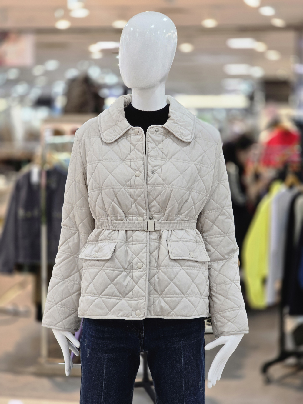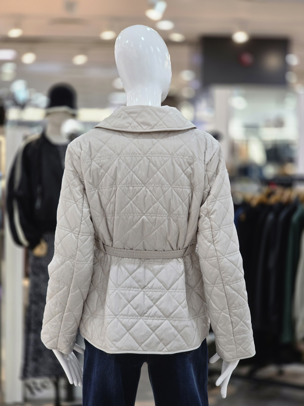 은은한 윤기의 에크루 컬러가 고급스러운 다이아 퀼팅 숏패딩입니다.