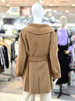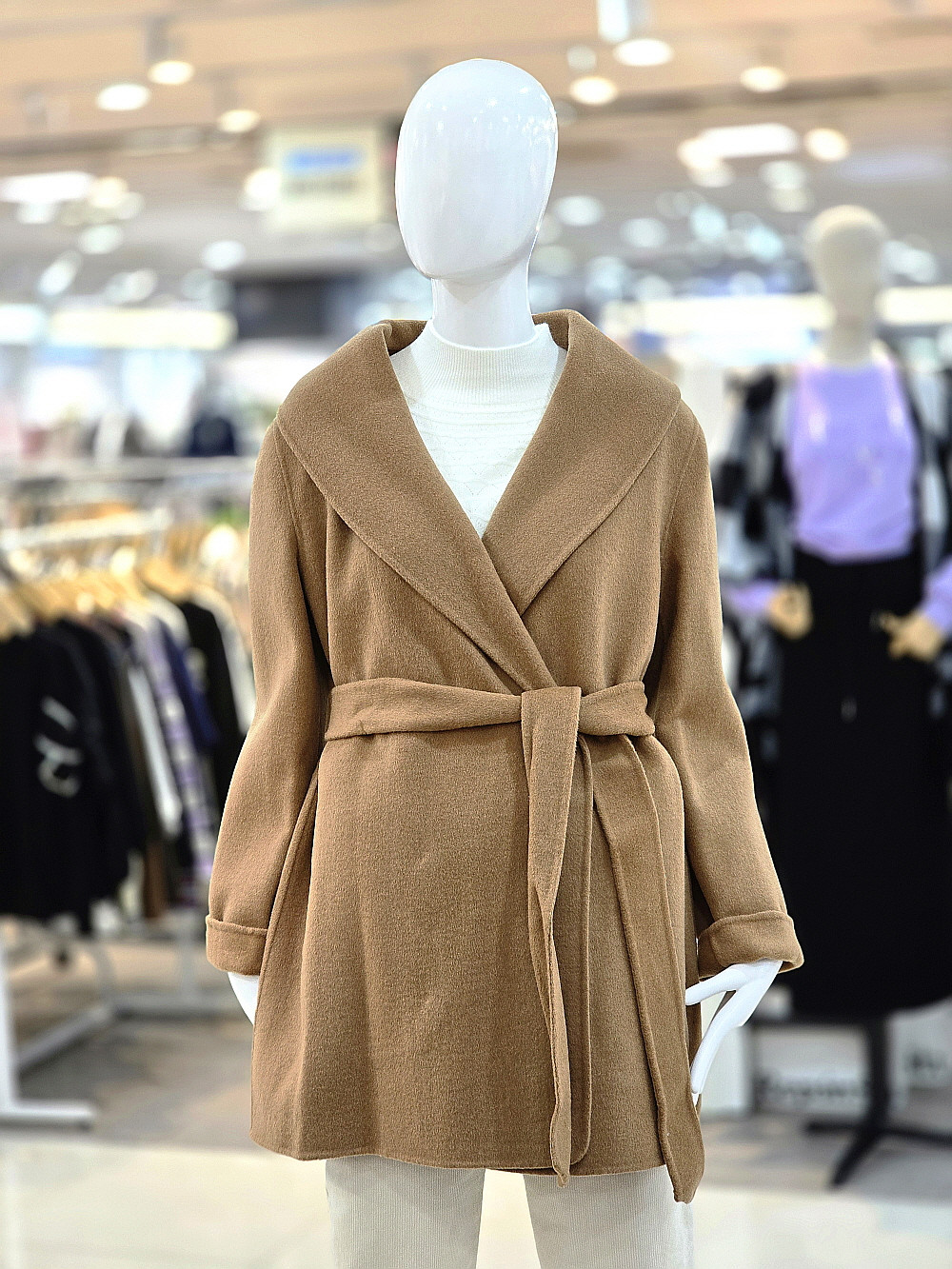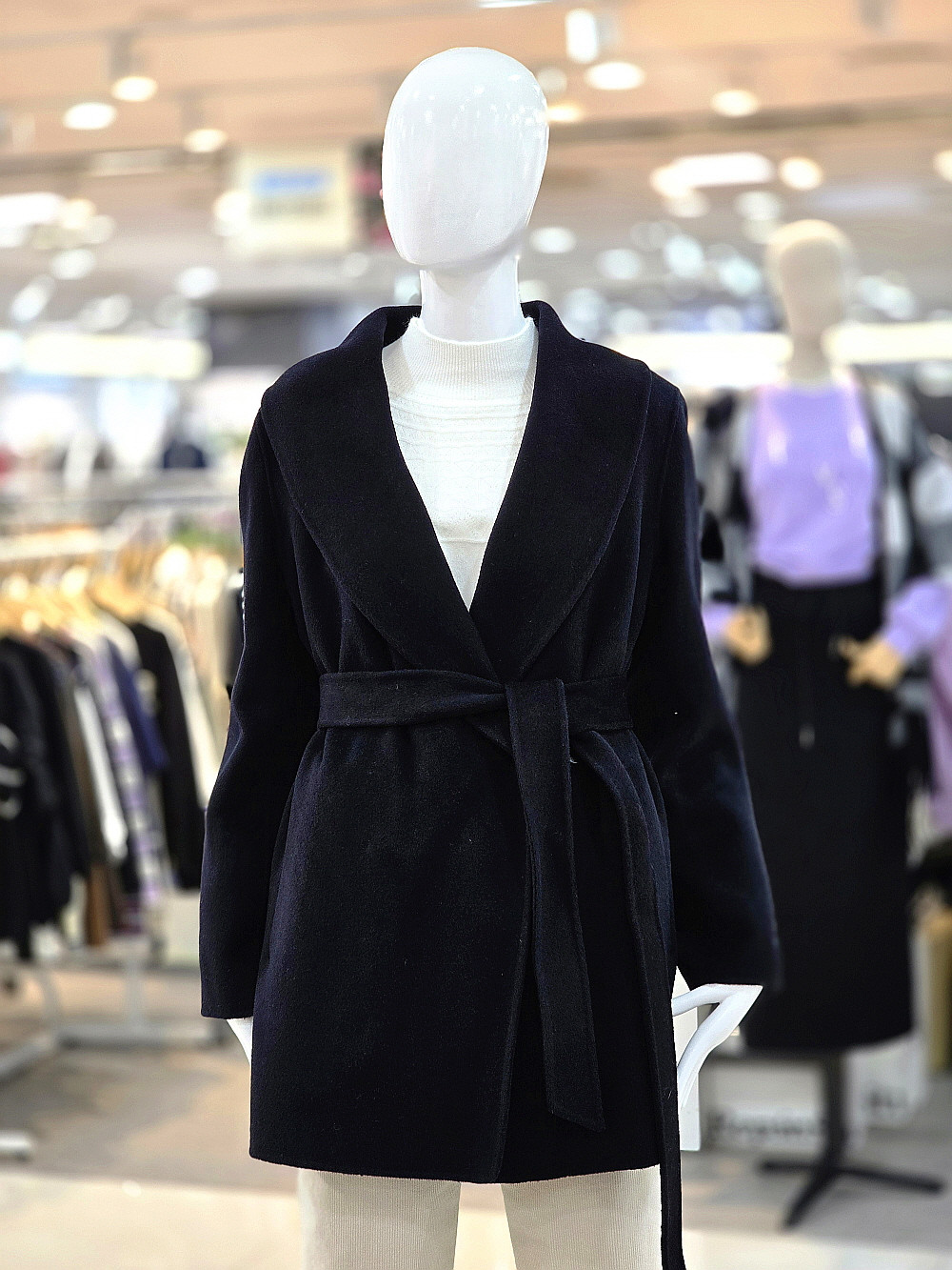 넓은 숄카라와 허리 벨트 디자인으로 여성스러운 실루엣을 강조하며,