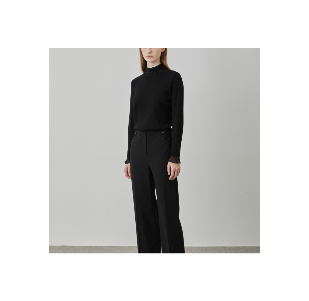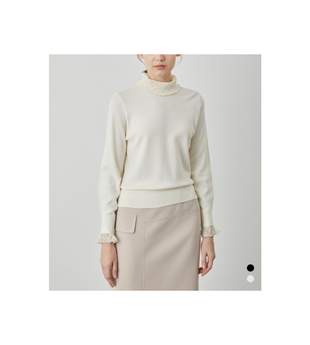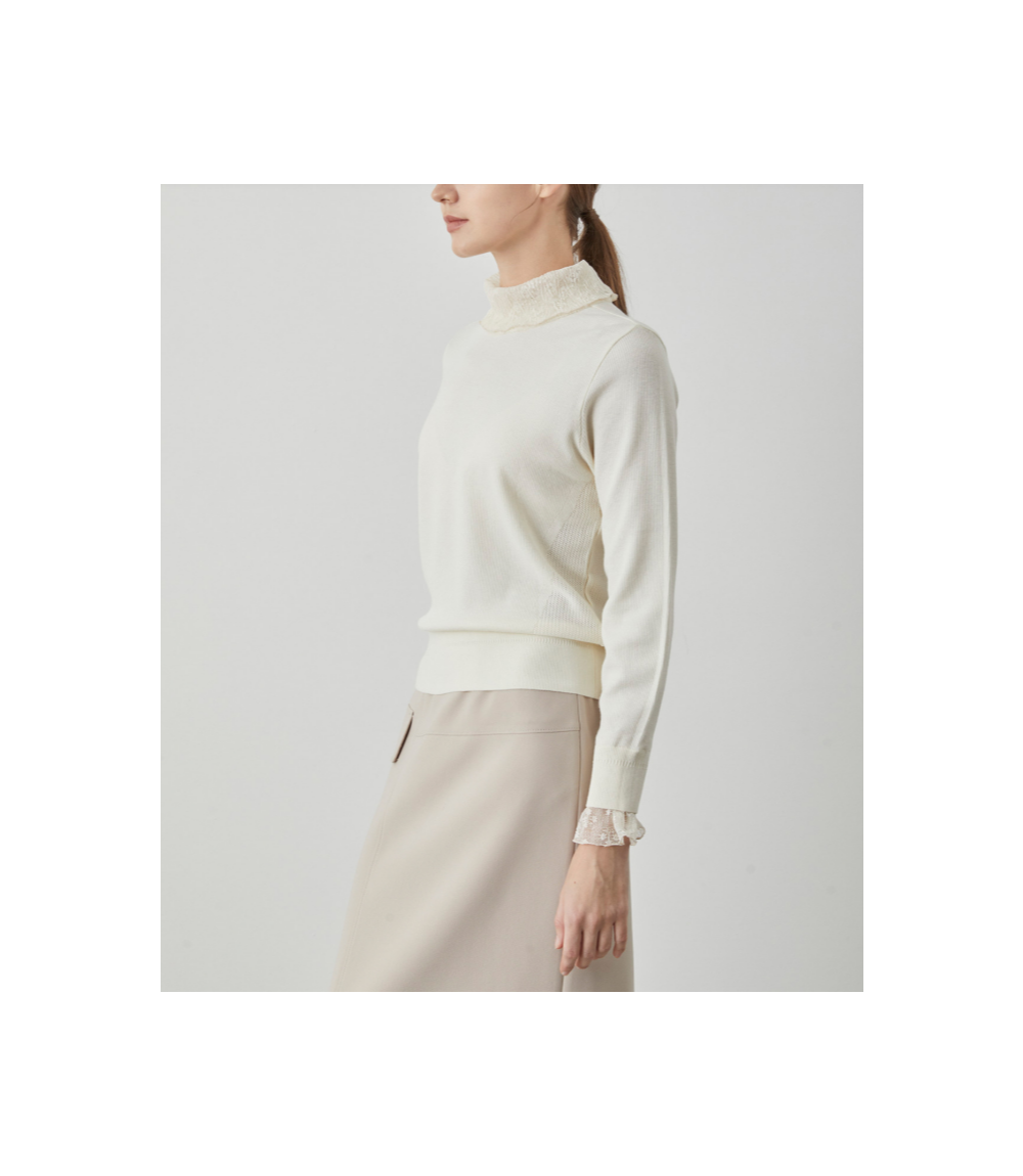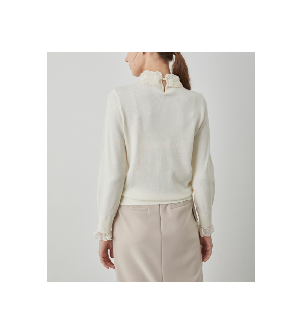 넥과 소매에 레이스 디테일이 있는 레귤러 니트 탑 입니다