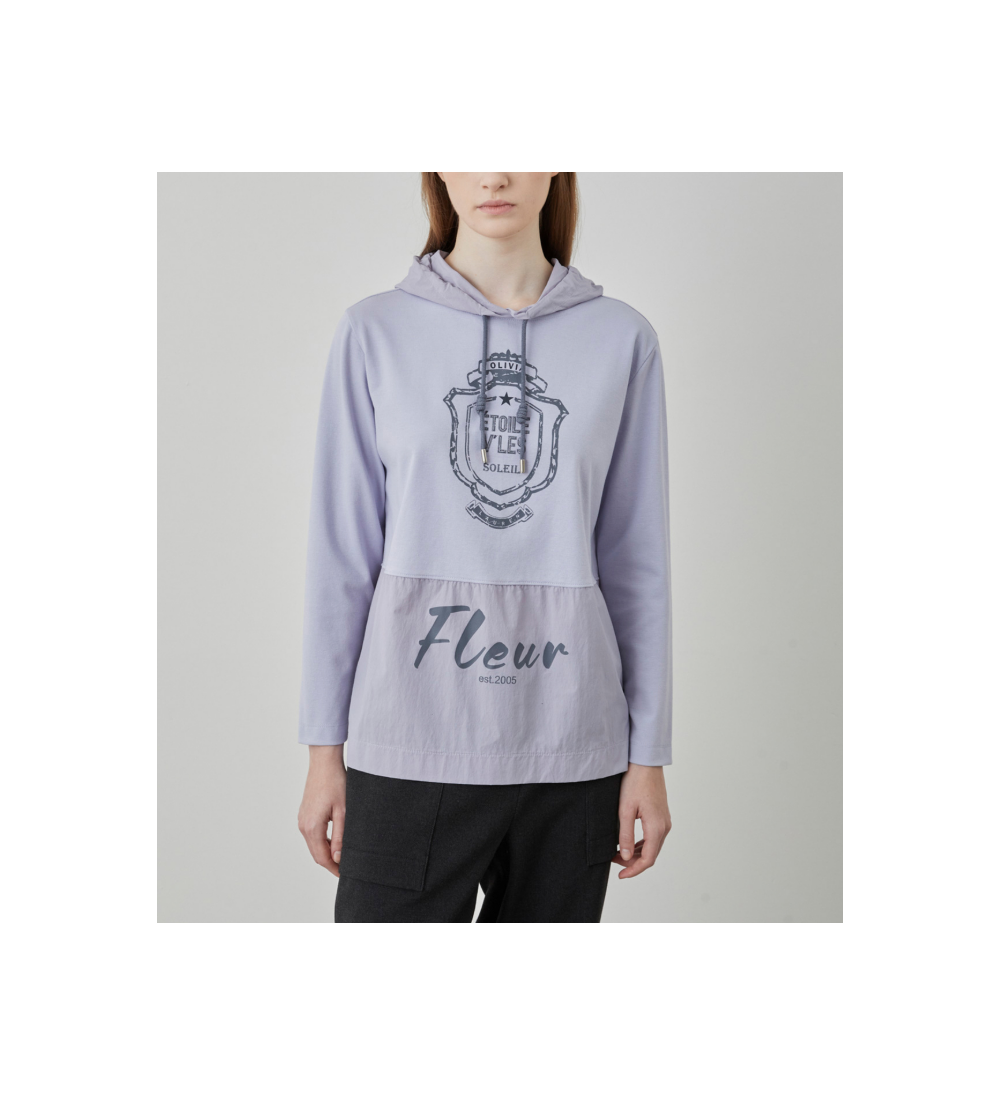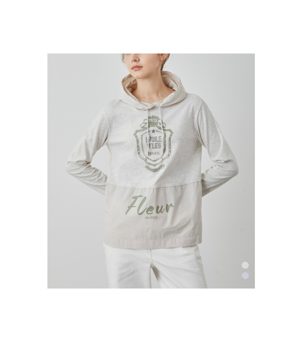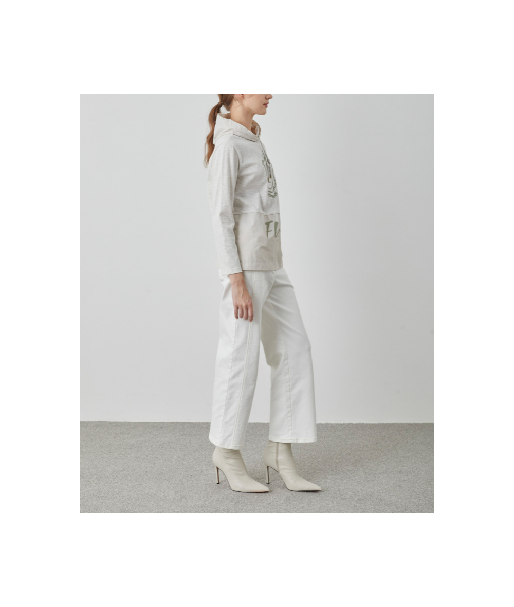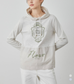 후드와 밑단에 가벼운 소재감의 우븐패치를 더한 케주얼한 스타일로